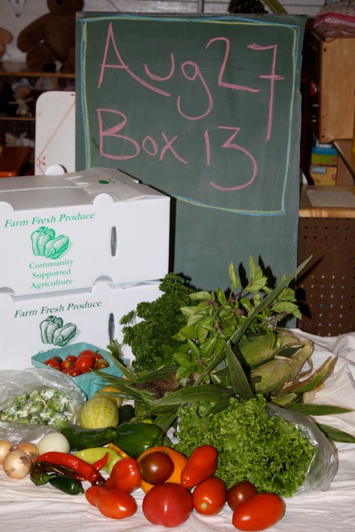 We have not included any eggplant in the boxes this week….even though the plants are still producing like crazy. We took the bounty to the farmers’ market to give everyone a break. It is the year of the eggplant for sure. There are a few in the extra box just in case a few of you want some.
