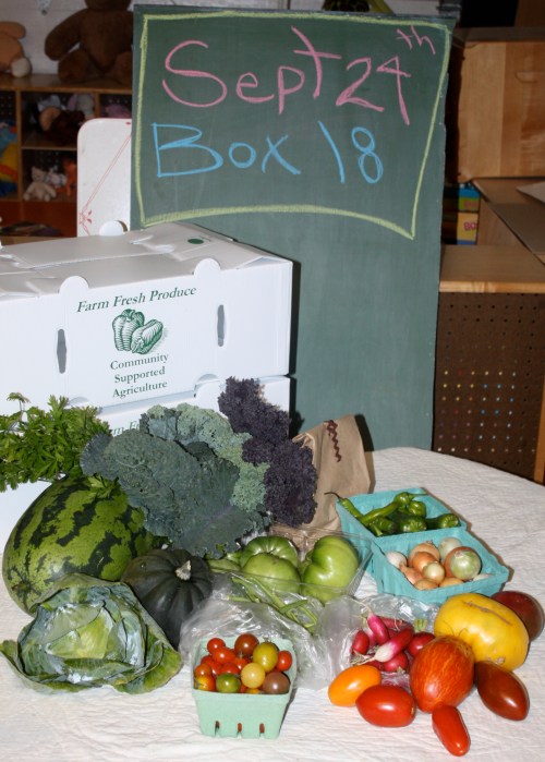 A wonderful week here in the garden…..As I mentioned this is the time of year I look forward to all summer long. I love to be out in the chilly mornings with the cold hardy plants. And then there is always that amazement of the plants that thrive at this time of year. The cold hardy broccoli grows so quickly and looks so strong and robust. Our Nappon Cabbage is lovely too right now. The radishes seem to develop over night and the spinach looks juicy and thick. Lots of crop harvesting and fun to finally see the yield of many vegetables we planted so long ago. We have had 2 light frost here and 1 hard frost last night so many of the tender plants are done. I know everyone is sad to see the amazing eggplant disappear from the boxes. I have honestly never seen eggplant thrive and produce the way it did this summer….The tomato vines froze hard and we had a flurry of harvest to get the last beauties in before the cold. I think we will have enough tomatoes stored for one more week and then they too will be gone until next season. We were very pleased with this crop and have made some notes as to favorites as well as “never again” for next year’s planting. I always like to test a few new guys every year and see what we think. The pepper plants got quite a chill and we harvested everything that was out there before the frost. This will be the last week of this astounding crop. Fun stuff is all set for the last few boxes and we are excited to share the Autumn Season with all of you.