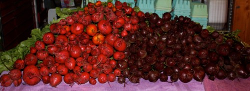 Beets-A colorful mix. Remember the greens are edible and tasty too. We add them to stir fry or as a side dish slightly wilted with garlic and onion.