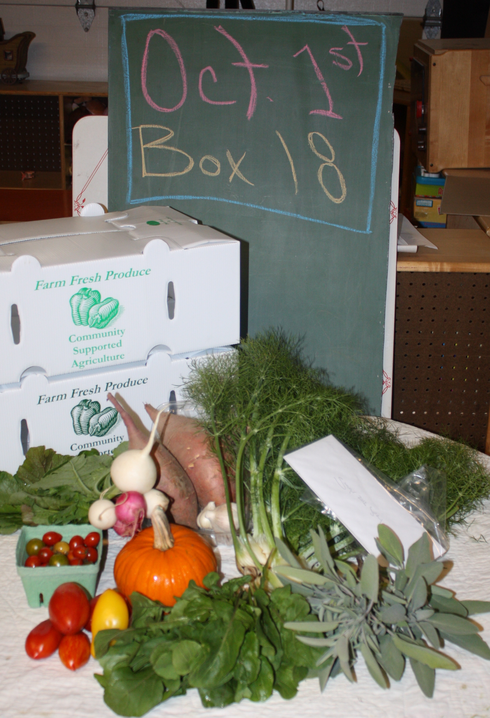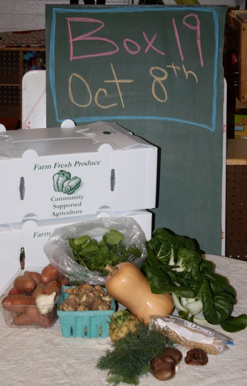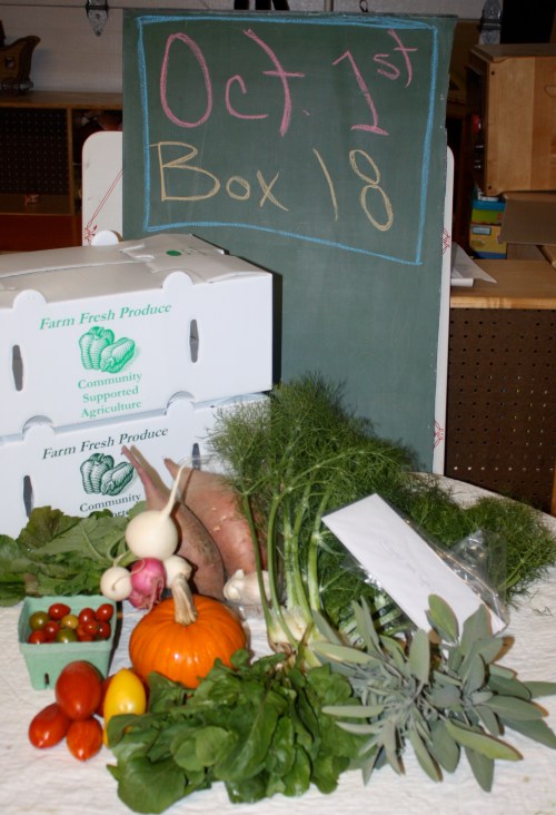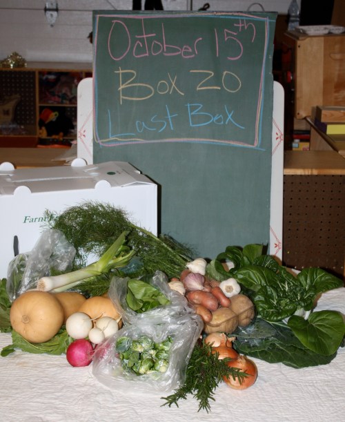 Last Box Pick up today! What an amazing season for all of us. We are thrilled, a little bit proud and greatly relieved we survived and flourished through the difficult drought of 2012. Scott and I both feel it is the best CSA season yet for us. We hope you feel the same. Thank you all for sharing. We had our goal check off list for the year and were able to succeed in reaching most. We wanted a steady bounty of green beans and we were able to provide this. I really wanted to grow a killer watermelon patch this year. We harvested over 200 of these beauties throughout the season and we just ate the last one this week. We have never grown cauliflower well in the past and even in the extreme heat of the summer were able to get a small crop that was tasty this year. Our pepper harvest was one of the best ever and the leeks were large and flavorful. It was a fabulous tomato year and we are happy with the varieties we choose to grow. The reflections on our disappointments seem to be heat and drought related. We had a terrible time with carrot germination. Our Number 1 disappointment was that we had such a small offering of carrots this year. We had several failed plantings as carrot seed will not germinate over 90 degrees. We tried and 1000 of seeds were planted. So, watch out next year! We have the carrot beds ready and we are starting early to ensure a bountiful crop. The peas were pretty wimpy due to the early Spring heat too. Our vines usually tower over our heads when harvesting and this year most only grew to knee or waist height. Again a heat problem we have no control over. Peas like it cool and wet. We always try to have lettuce every week and we missed a few this year due to bolting in the heat. 100’s of heads were composted weekly in the worst of the drought and heat and we are grateful for the delicious harvest we did have. Every season has unique challenges and I feel we did well rolling with what was given to us. The water consumption was pretty worrisome and at times overwhelming but we took it day by day. And finally I am going to spend this winter figuring out how to properly post recipes on the blog so we will have weekly recipes with each box next season.