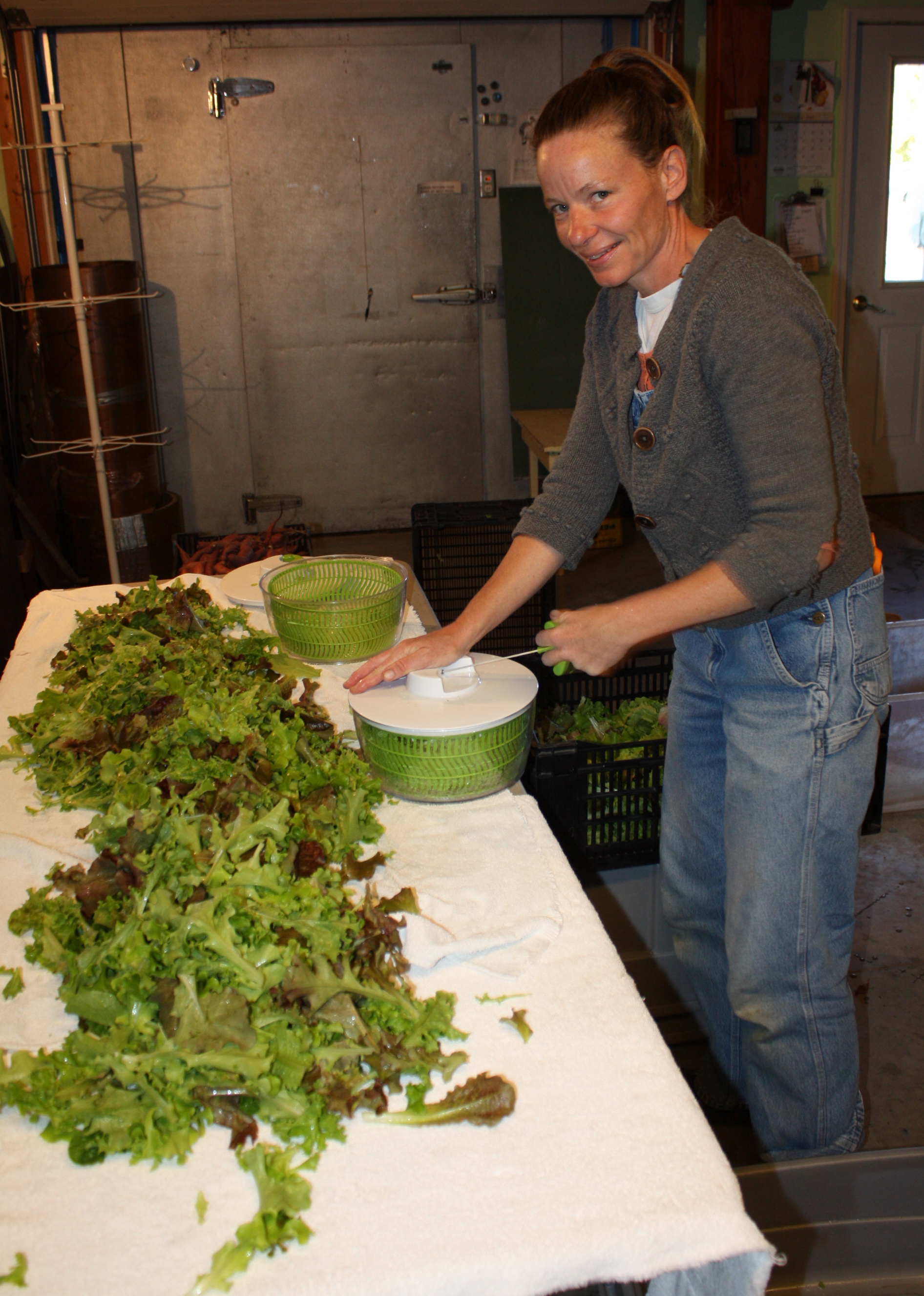 Leaf Lettuce-Harvested from the hoop house. A big bag for everyone and a fun mix. We triple rinse the leaves after harvest and then Scott has a fancy way he “swing dries” the water off and then we spin it all in those lame little home kitchen salad spinners….it takes forever.