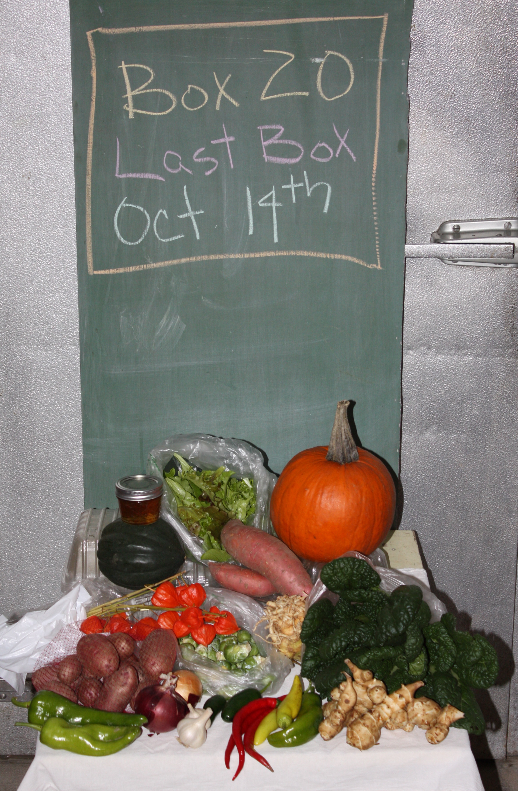 A frosty morning greeted us on this final Summer food box day. Seems appropriate on our last day…..as the frost marks the true transitional growing season end in the garden. Several cold hardy crops remain out in the garden and will thrive in these early Autumn days and the new hoop house is packed with growing treats for the Winter Storage Boxes but the bulk of our crops are out of the ground or done with this cold and diminished day length. It is a bittersweet feeling to know it is the end of summer and surprises us. This has been a nine month whirlwind since the first seeds have been planted.