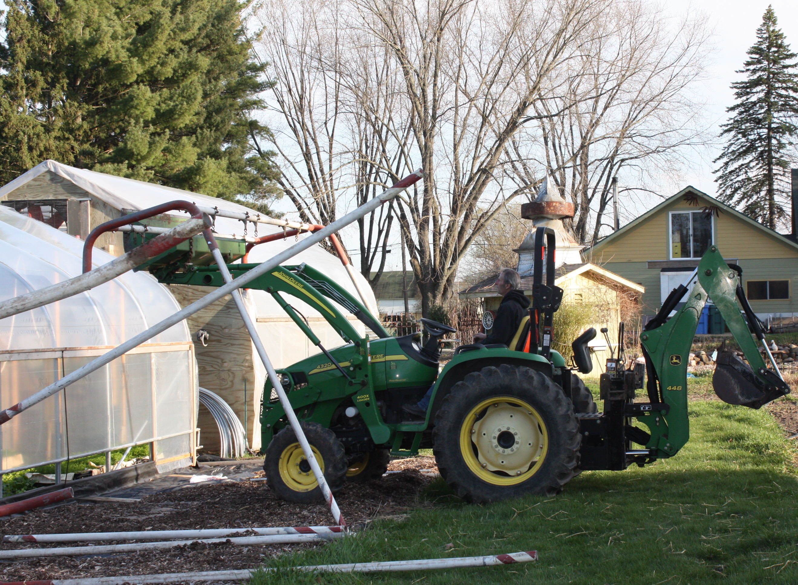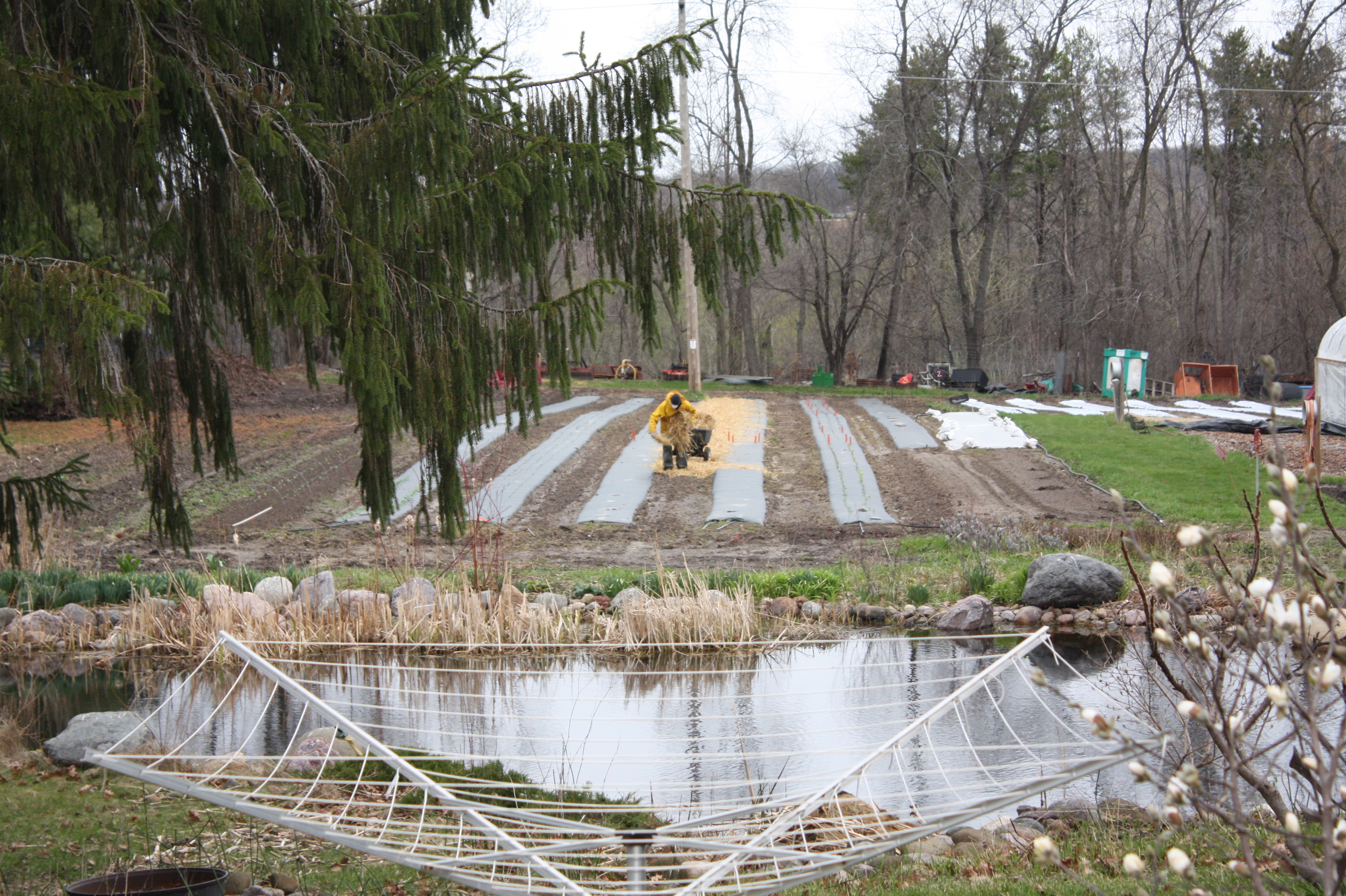 Busy activities in the garden last week. A “focused hustle” was our mantra every day. The chilly nights of threatening frost caused us a bit of worry. Scott covered many of the cold sensitive plants with white protective row cover to keep them safe from a harsh chill. In the morning sun it all had to come off and then back on again in the night. I think (hope) we are finally past the threat of frost and this duty can disappear until Autumn. We finally finished the huge job of planting all the onions. About 4000 starts all went in by hand. 1 at a time. I’m not going to say it was an easy task, I needed to take a power nap 1/2 way through, rough to stand upright when the job was done after being scrunched over for hours on end. But it is done!!! Another duty that was floating around at the top of the “to do” list too long and kept getting pushed back by the rain.