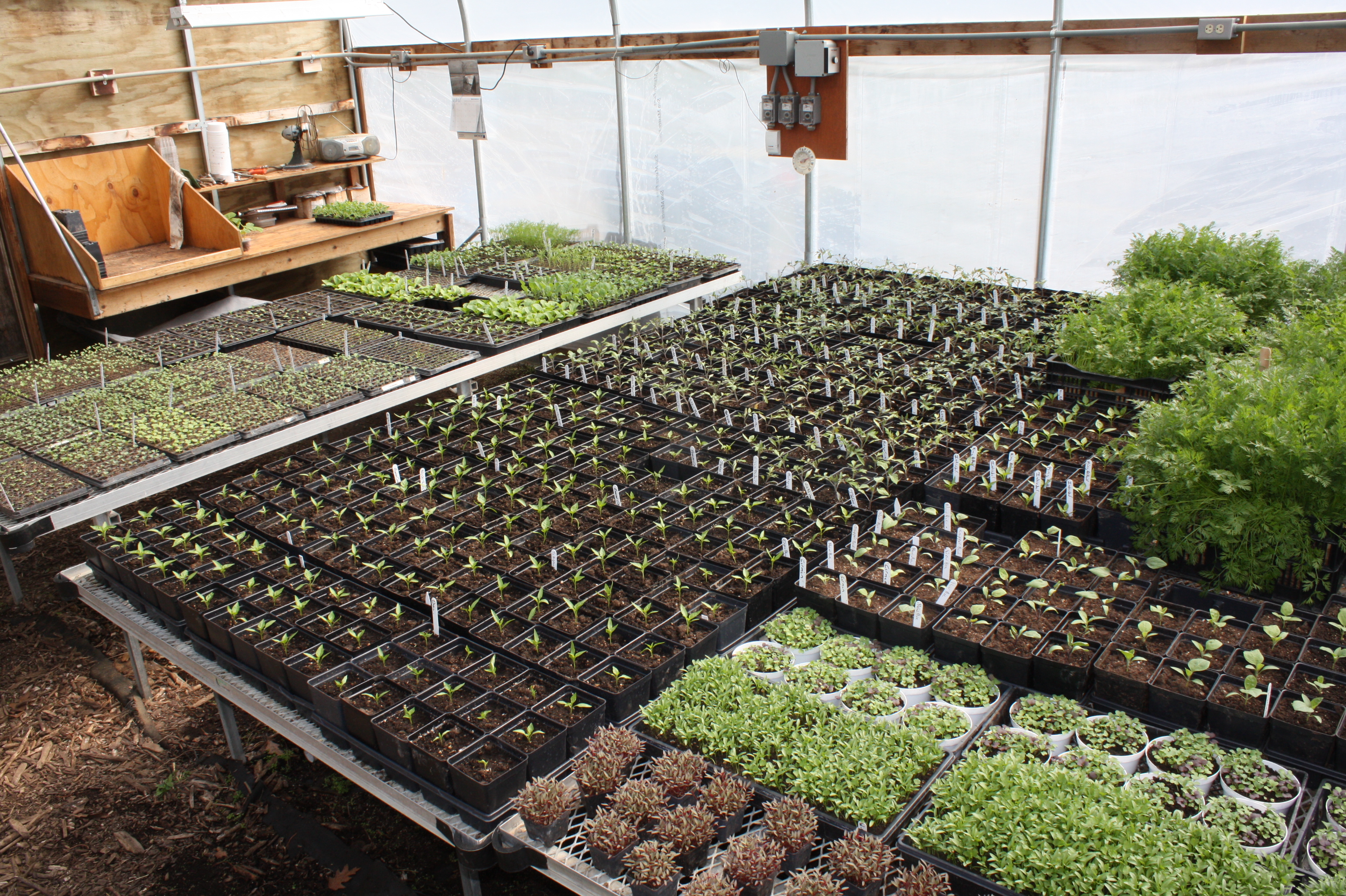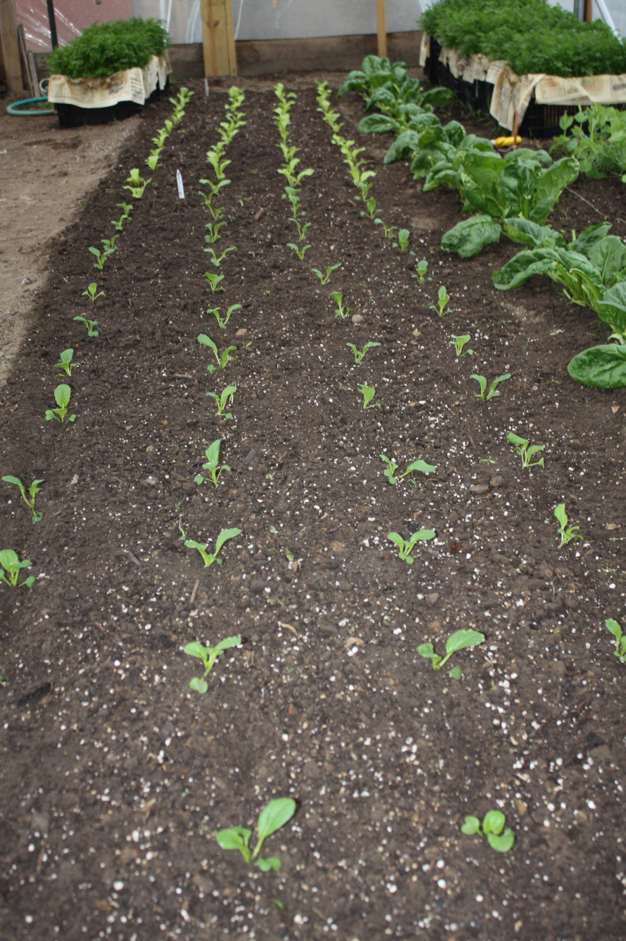 The hoop house has been cleared out and transformed with new seedlings. It amazes me how the crops change so quickly. We are readying ourselves for the start of the Summer Share Season. Warm loving lettuces have been planted, a fresh rotation of Asian greens, an experiment with early beans, more radishes and a few more surprises for the summer all nestled in.