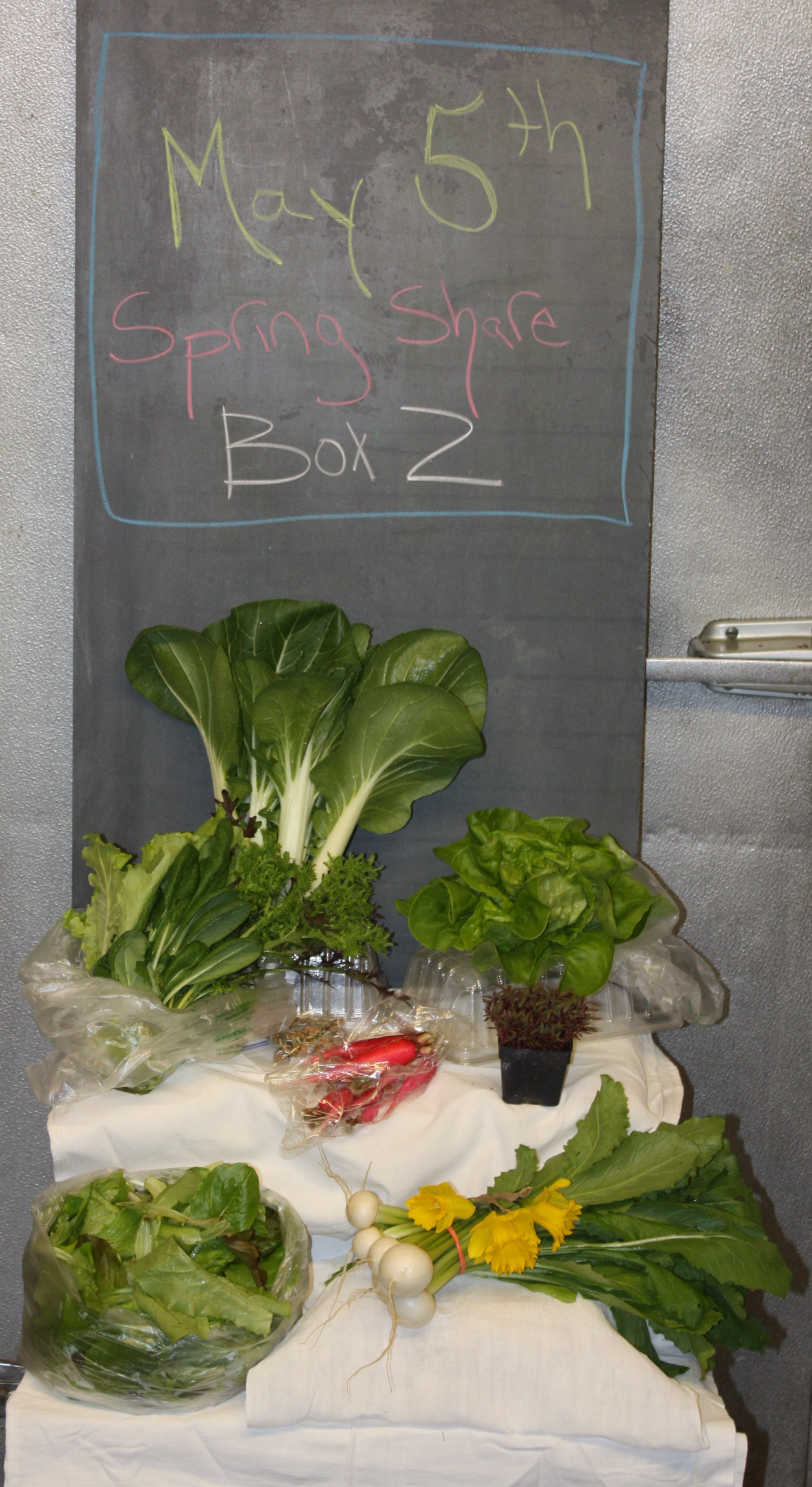 Hard to believe that this is the last box of our 1st Spring Share Season…..Thank You! We loved the experience and are gratefully amazed with the fantastic bounty we were all able to enjoy these first cold weeks of Spring from the hoop house. After a long Winter fresh greens sure taste delicious and we were happy to share with you.