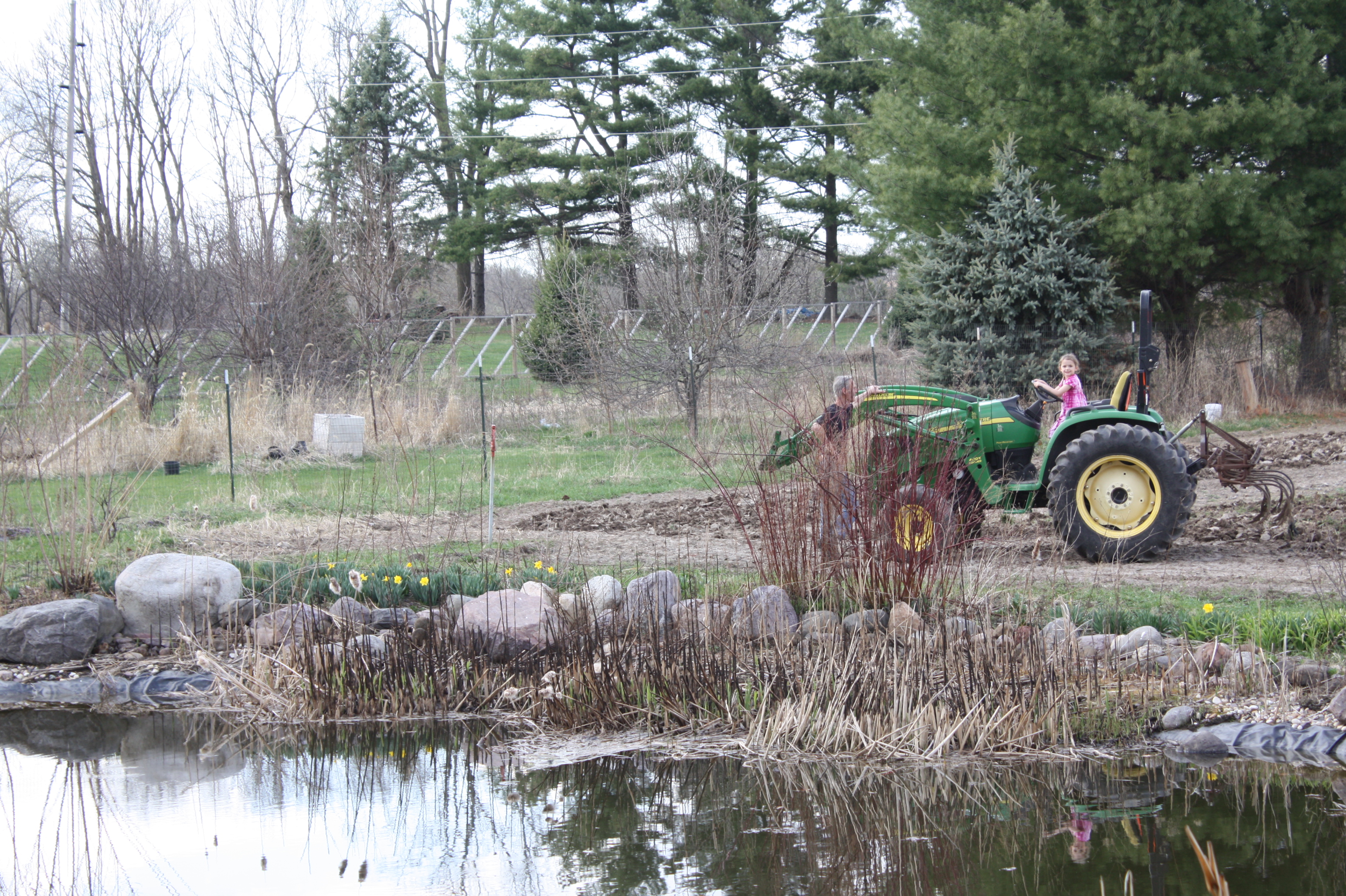 Scott is thrilled that he has all the plastic mulch set and irrigation down. This is the earliest in Spring he has been able to get into our clay soil gardens.