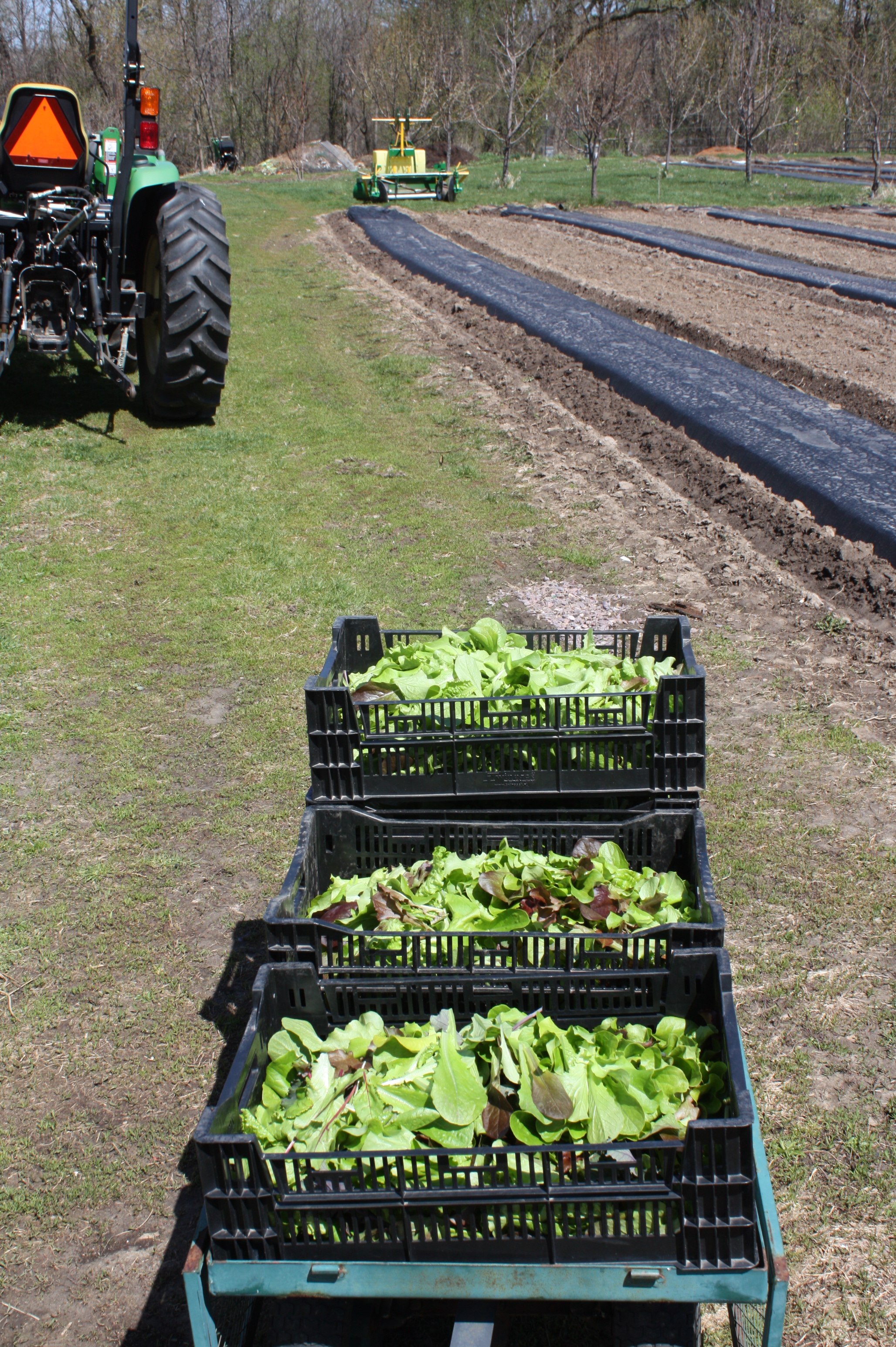 Leaf lettuce harvest ready to be transported to the washing station. Future tomato garden in the background.