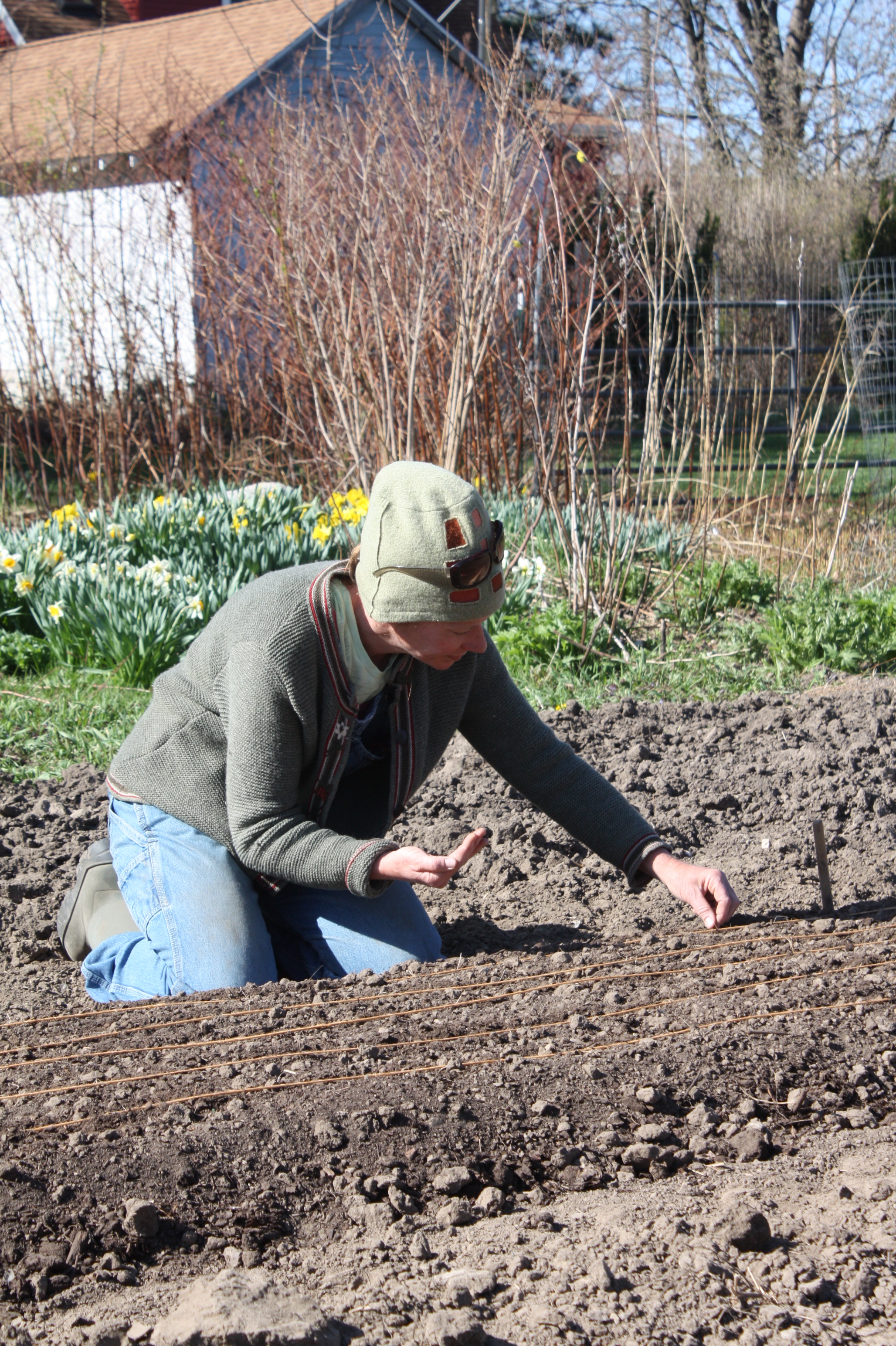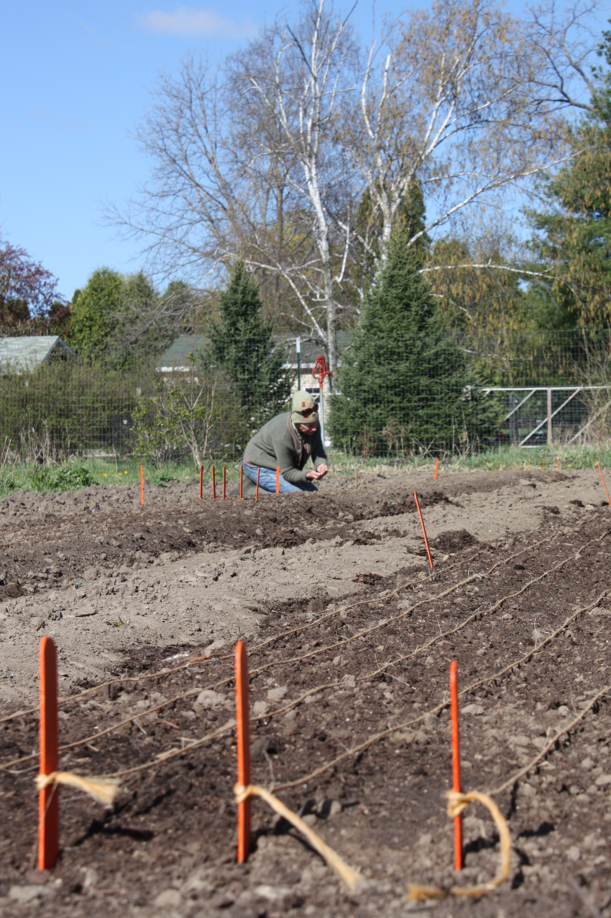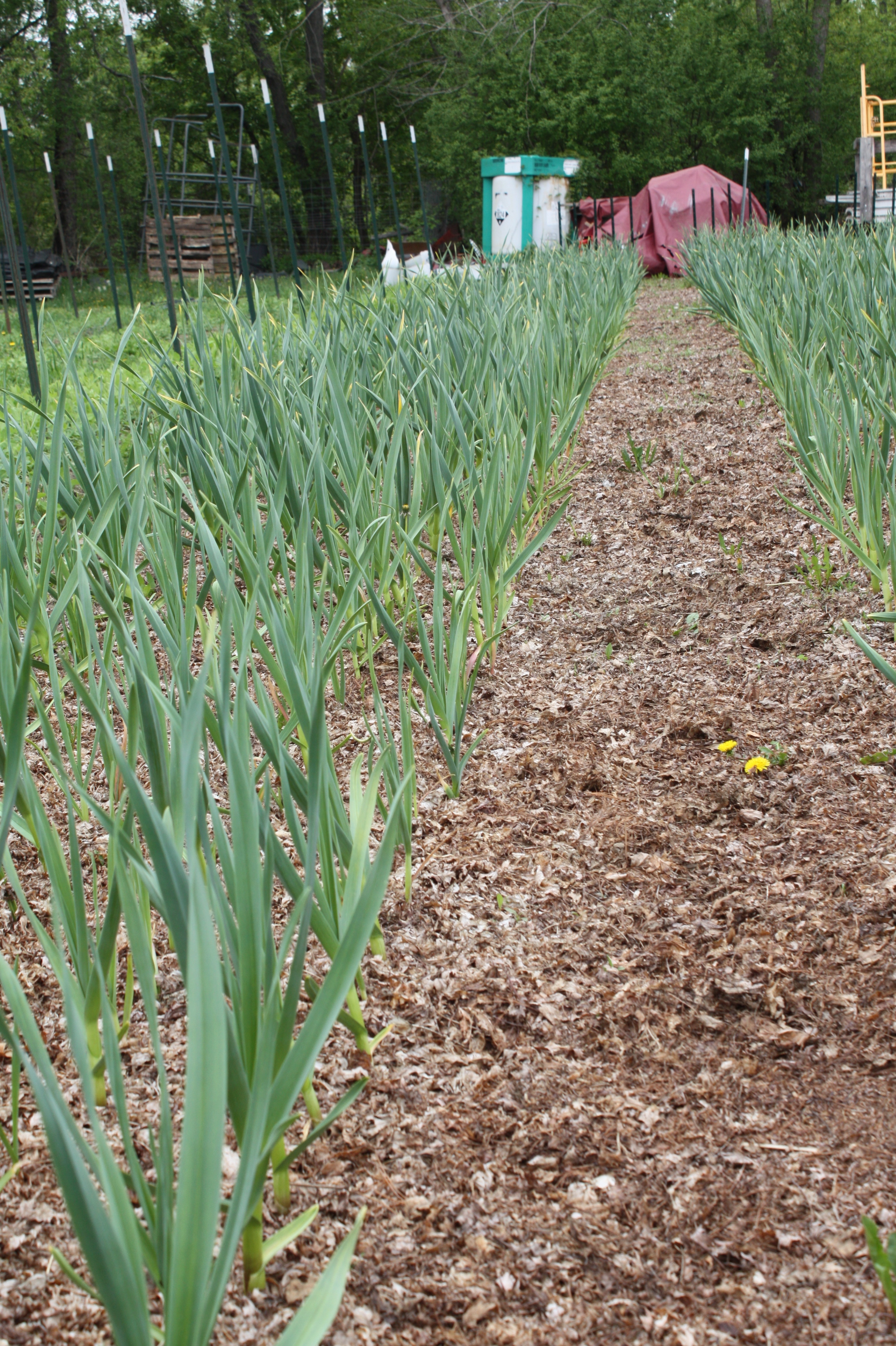 The usual theme of another power house week! The big deal-just over 2800 leeks went in. Not a typo-really 2800…. Scott and I planted all in just under 3 hours. Scott created a perfect row marker and a fancy “hole driller” and I followed behind and planted our pencil thick leek starts. 3 different varieties. Early, mid and late season wonders. We’re excited to start harvesting this crop around mid September. Obviously we love leeks and we’re excited to share with members (and others) starting late summer. We did things a little differently this year and started the seeds in late Feburary in deeper containers and let them grow larger than past years. MUCH!! easier to plant and a stronger start to the season.