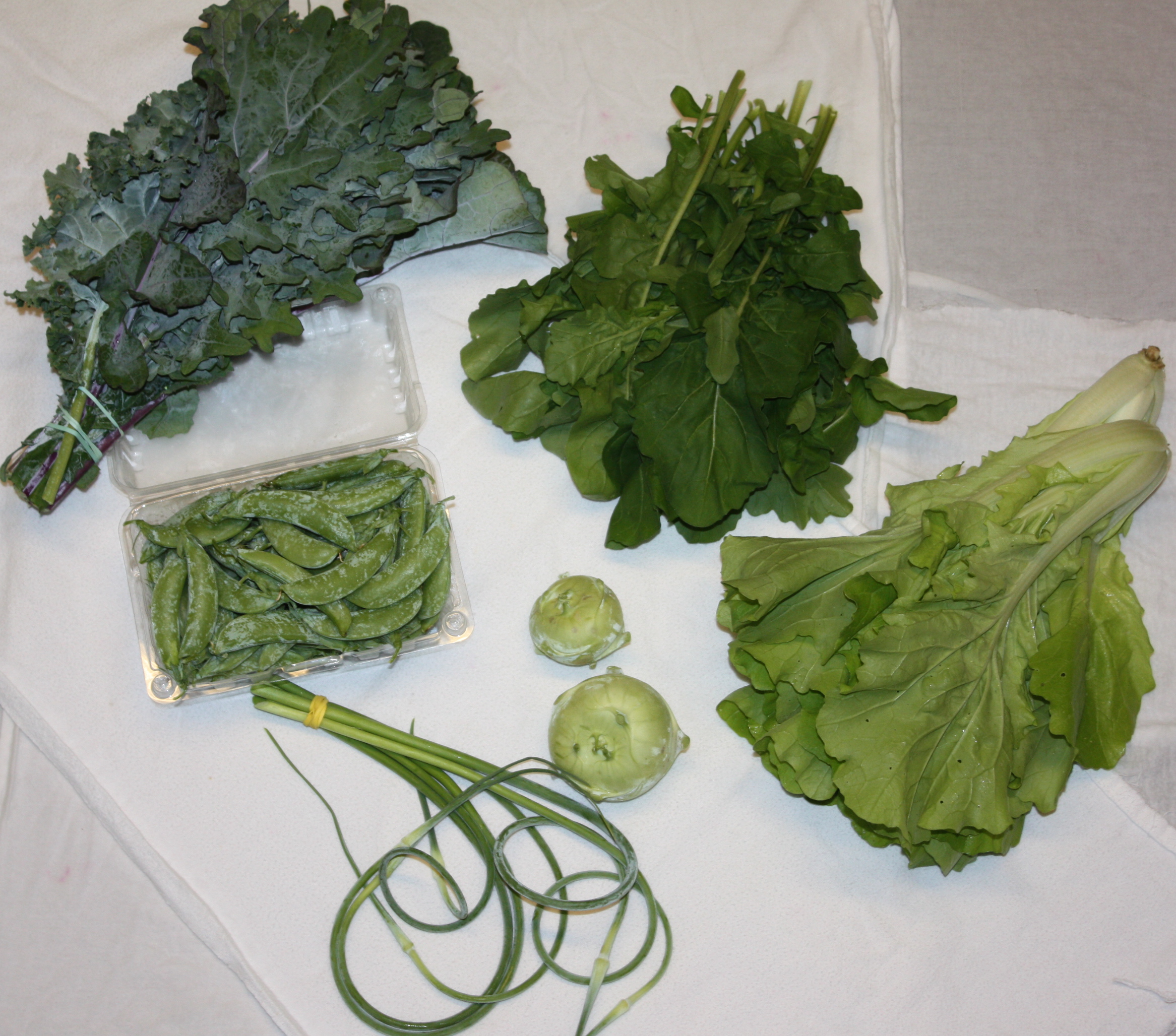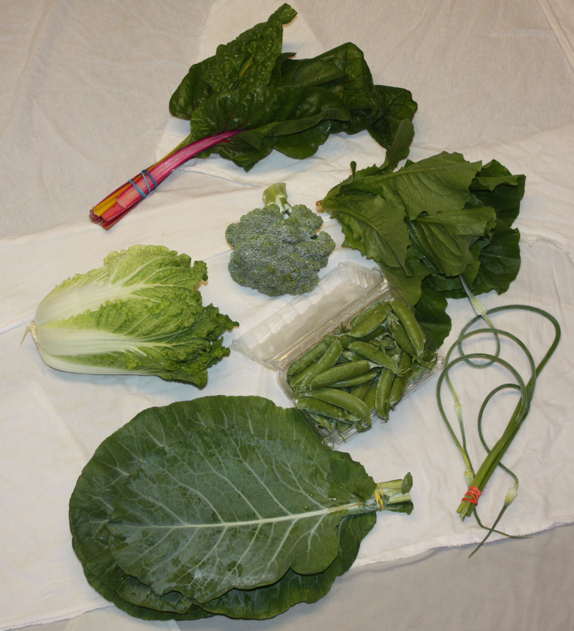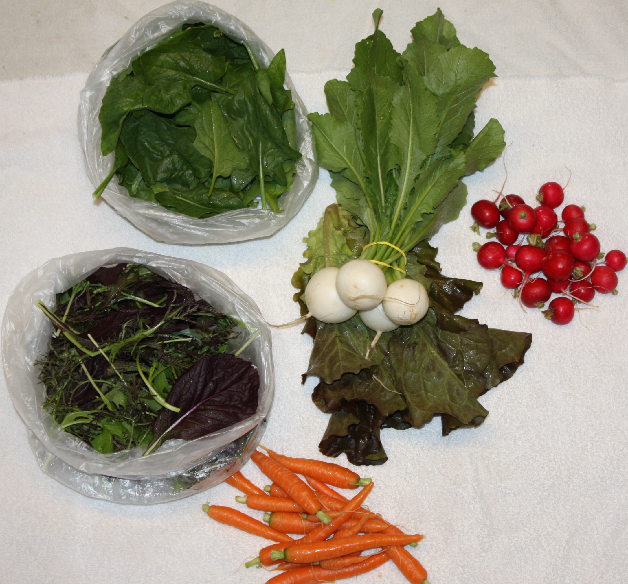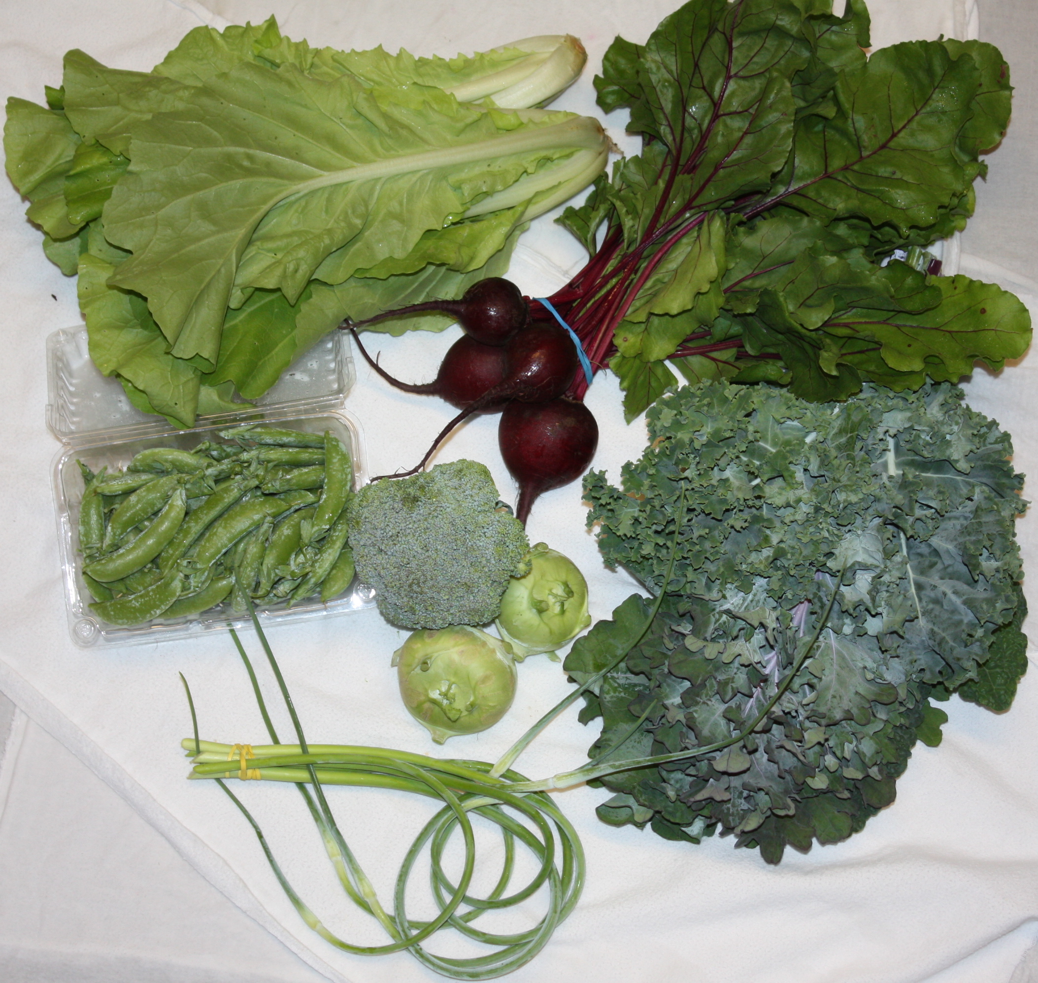 Swiss Chard-A nice big bunch….Hoop house grown and oh so tender. Much different than field grown chard. Eat stems and all if you choose. This is the end of the chard until Fall as we have pulled the crop. Summer chard is not as tasty. Slightly bitter and woody. A new crop is started in the greenhouse now and we will harvest again in the Fall.