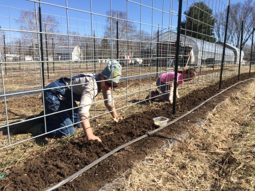 A fantastic week here! EXCEPT we now work in mosquito city….Our cologne of choice is deep woods off and we power on….. We were planting maniacs again all week long and are just about over the big springtime planting frenzy. Potatoes are in! 500 pounds of seed potatoes all in and all planted by hand. We are thrilled….the next day we planted 1400 leeks in an hour and 15 minutes. We’ve wised up a bit over the years and learned that it is much easier to wait a bit for the leek seedlings started in March to size up. As Scott says-“it is much easier to plant pencils than try to stuff yarn in a 9 inch deep hole”. True. The zucchini patch is in, long rows of eggplant, edamame, cutting celery, and parsley all in too. The hoop house is completely transitioned to Summer Production after we harvest the last of the greens for the final Spring Share. Crops look great in the field. The peas are just about ready to grab on the trellis and germination is great after disappointing germination last year. Hopefully we will have a bounty! Beans are up, and the early broccoli plants are growing well. It is a happy start to a great season.