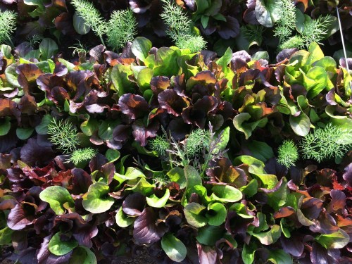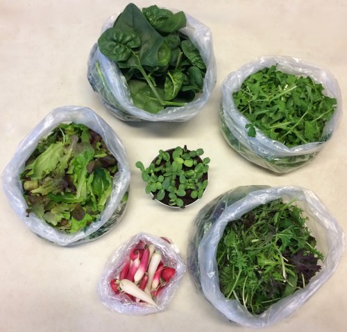 Basil plant, mung bean shoots, mini bibb head lettuce, leaf lettuce, radishes, turnips, spinach, fennel, rhubarb, beta mix OR baby kale.