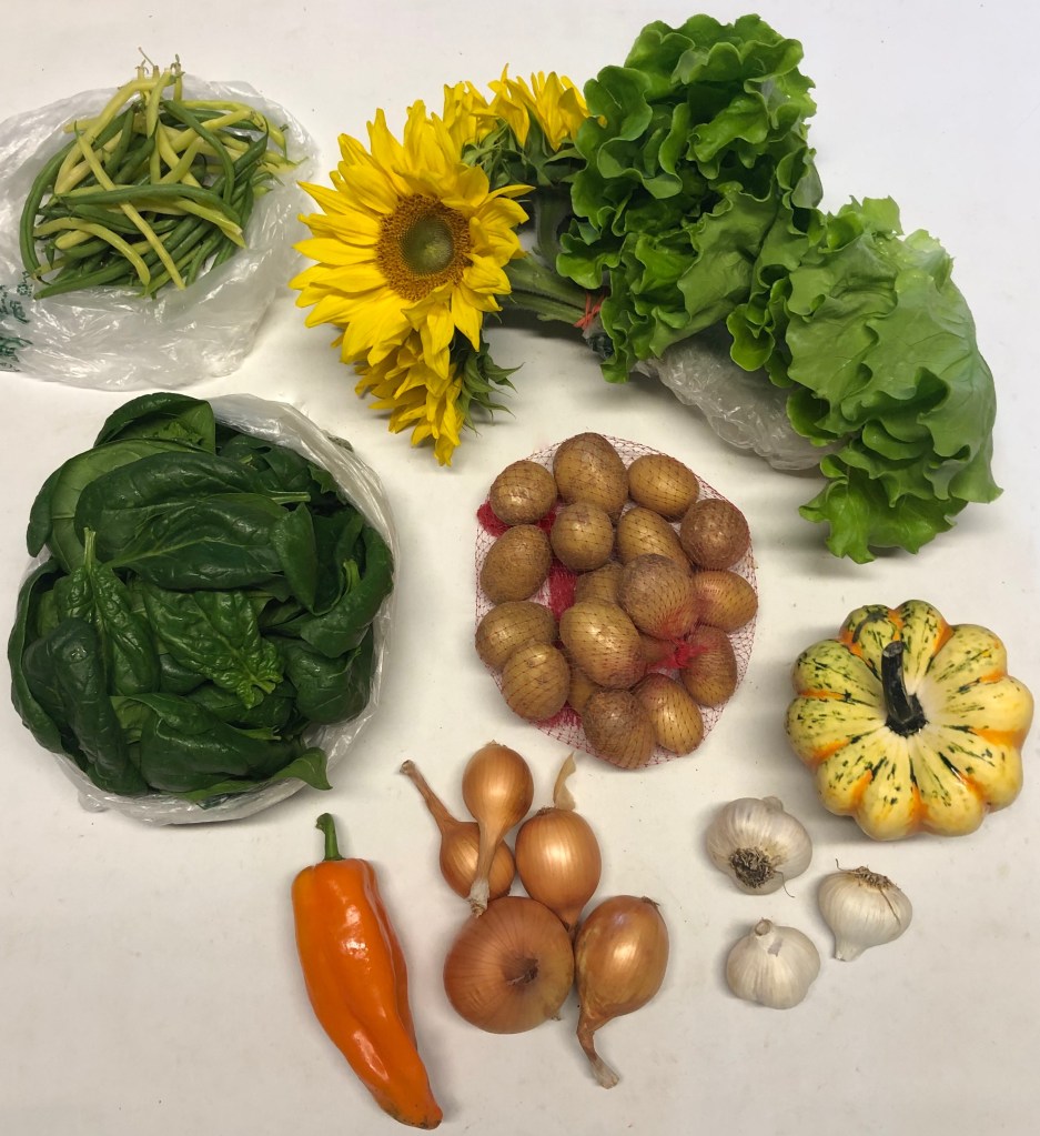 #17 WHAT IS IN YOUR SHARE-head lettuce, spinach!, potatoes, carnival squash, heirloom “aunt thelma” squash (full only), italian fry pepper, onions, garlic, beans (snack only), sunflower bouquet, fennel (full only), golden beets (full only)