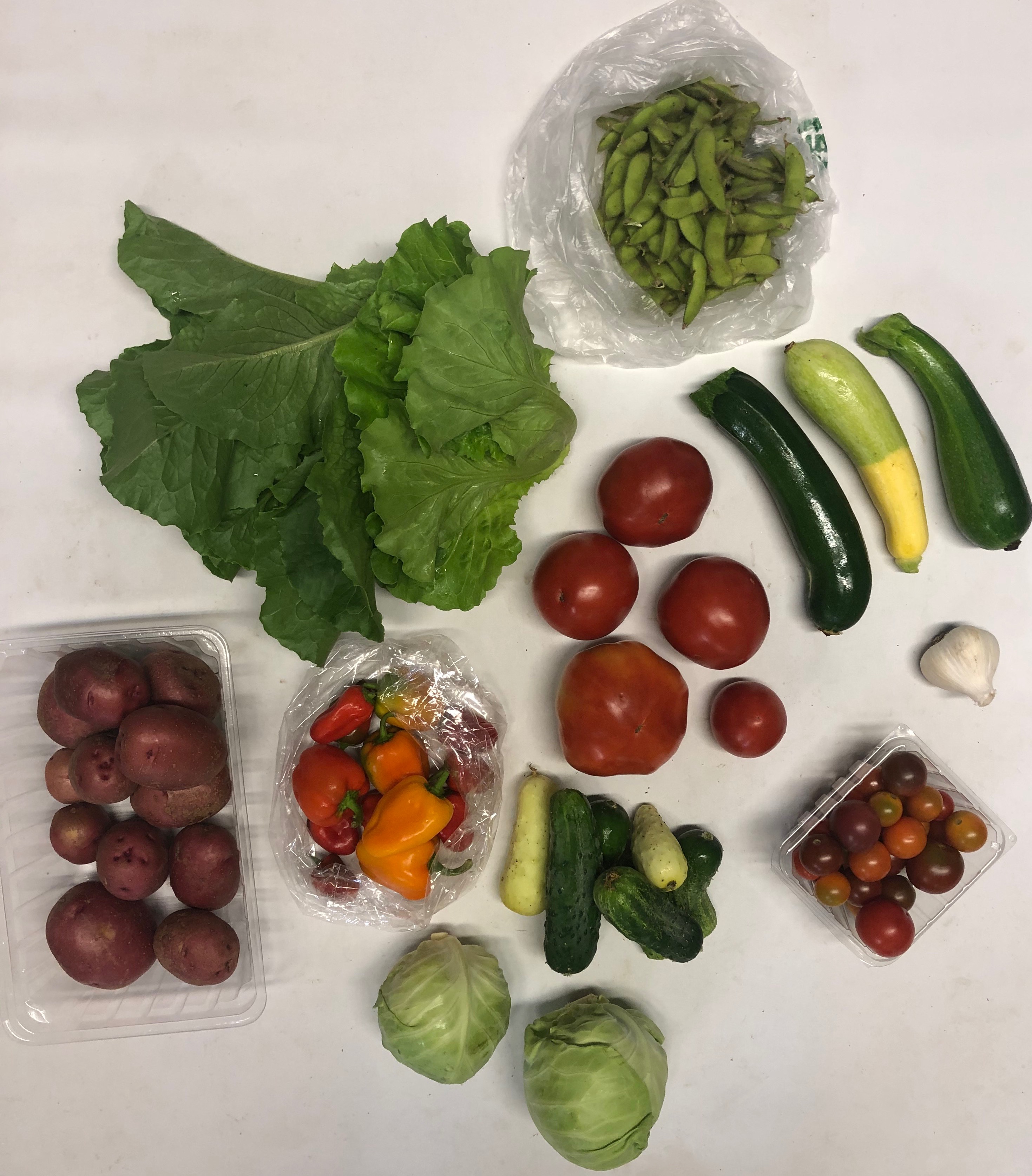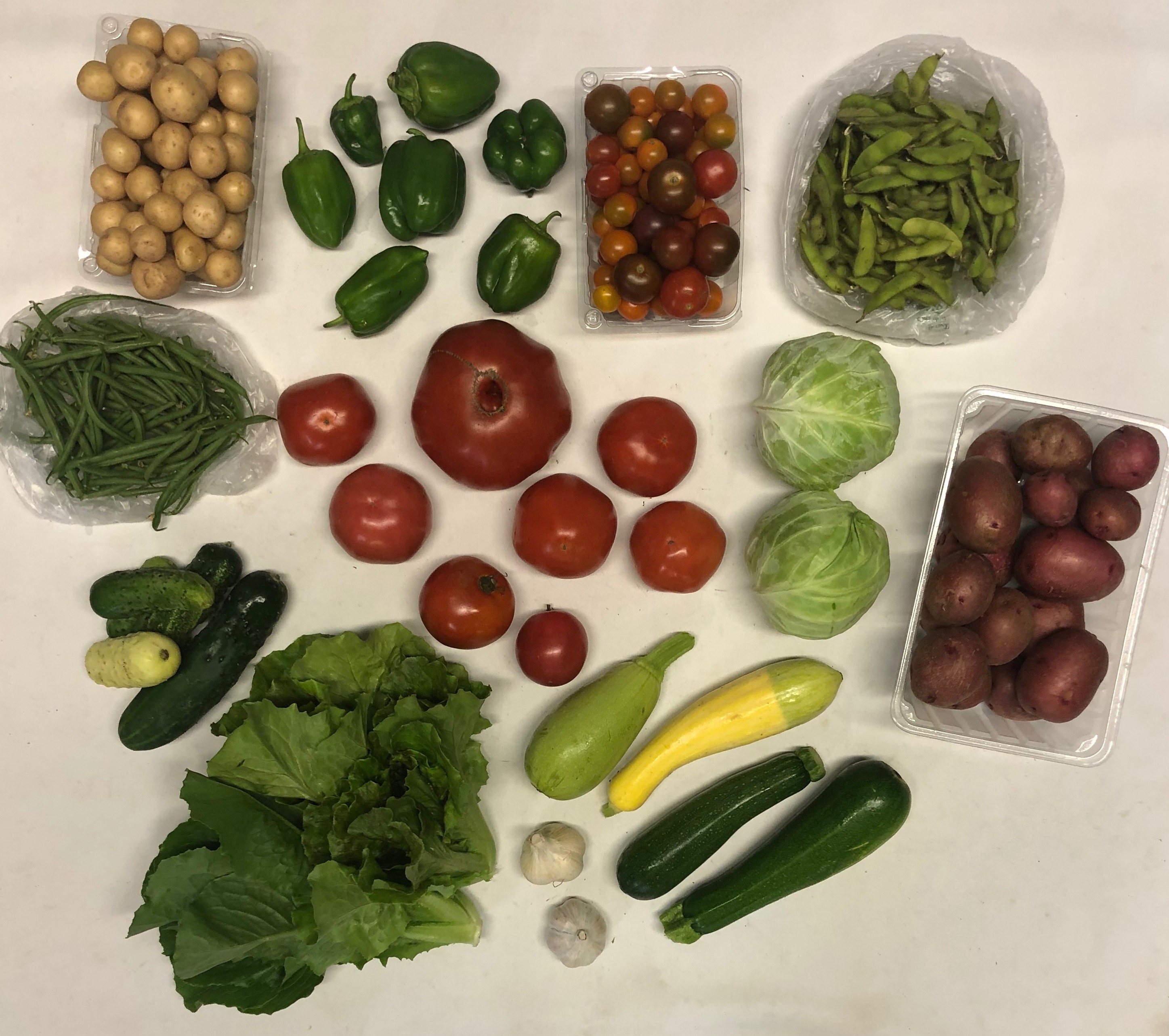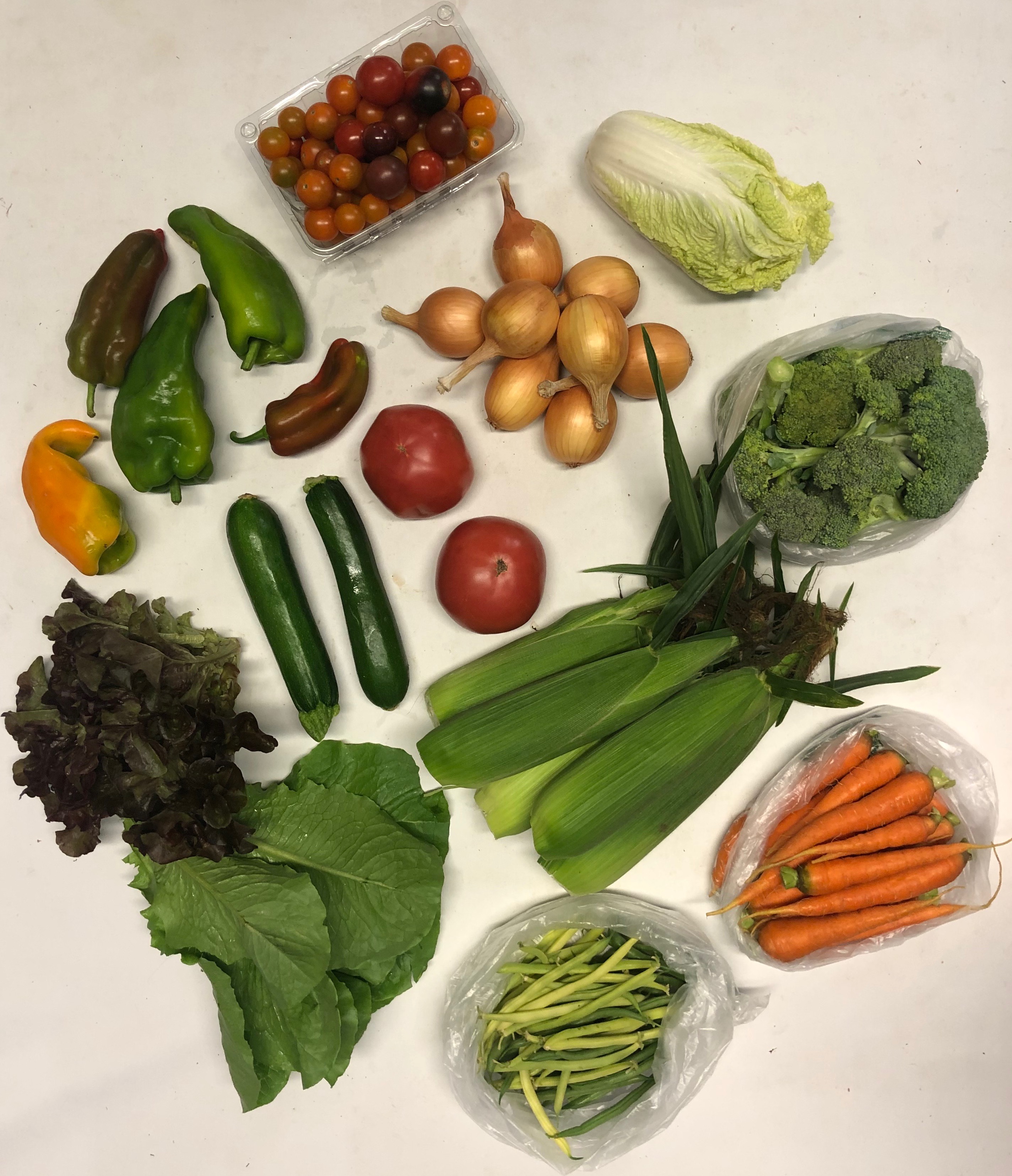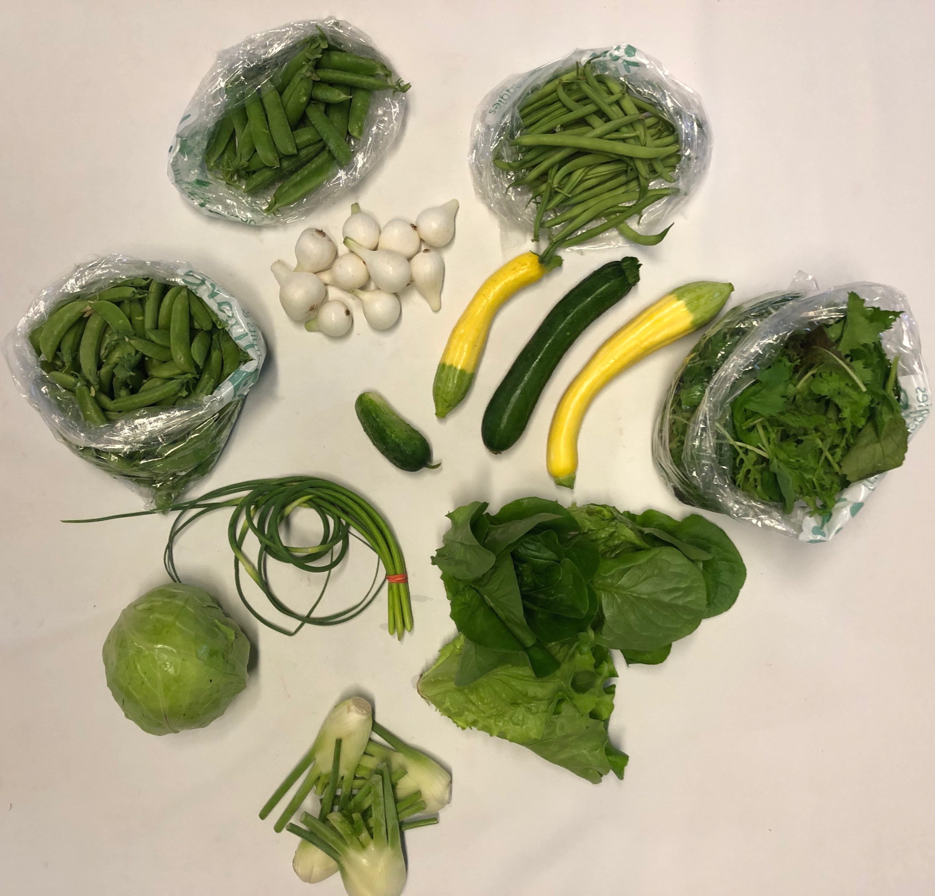 Full Share-18 consecutive weeks starting in June. A perfect share for a family or couple that cooks most weekly meals at home. Feel free to share a share with another family and split the bounty weekly or every other week. Weekly offerings of seasonal produce all summer long. Tons of leafy greens!, spinach, lettuce, salad mix, saute mix, basil, asian greens, pac choi, swiss chard, celery, rhubarb, radishes, carrots, beets, summer squash, winter squash, spaghetti squash, cucumbers, beans, peas, broccoli, cabbage, edamame, potatoes, sweet potatoes, tomatoes, melons, eggplant, peppers, brussels sprouts, onions, leeks, shallots, garlic, turnips, honey, flowers and more…..Produce is clean, carefully packaged and stored in our walk in cooler until time of pickup. $610 ($33.89 a week) SOLD OUT