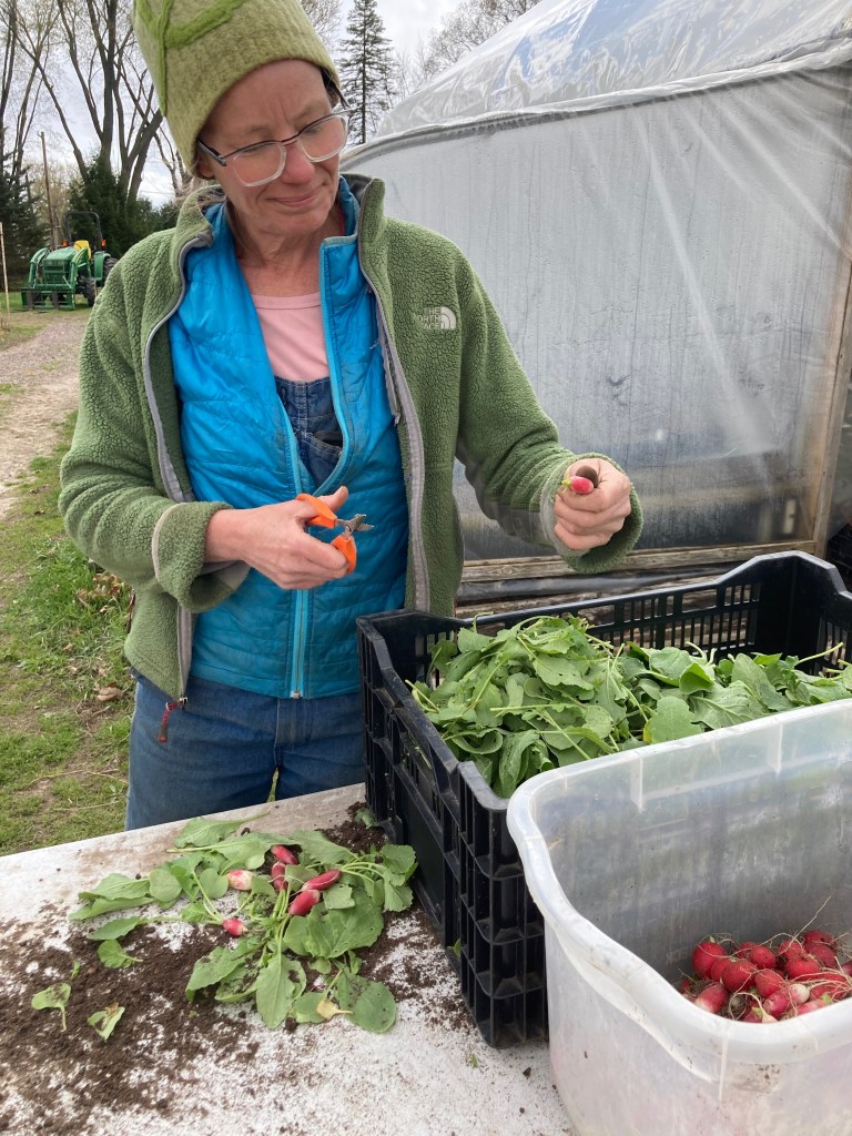 And here we go! A beautiful day for the 1st share….We have had a great start to the season. The weather has been perfect for getting the gardens set and hoop houses prepped. Peas are up outside and all the rows and irrigation set. We planted long rows of early broccoli, cabbages and swiss chard outside last week with fingers crossed the temperatures did not dip too low at night. All good and transplants settled in. Next up the onions will go in and long rows of brussels sprouts and kohlrabi too. The hoop houses are full of fantastic leafy greens that we all crave after this long winter. We are excited to get back to our warm weather routines and days outside.