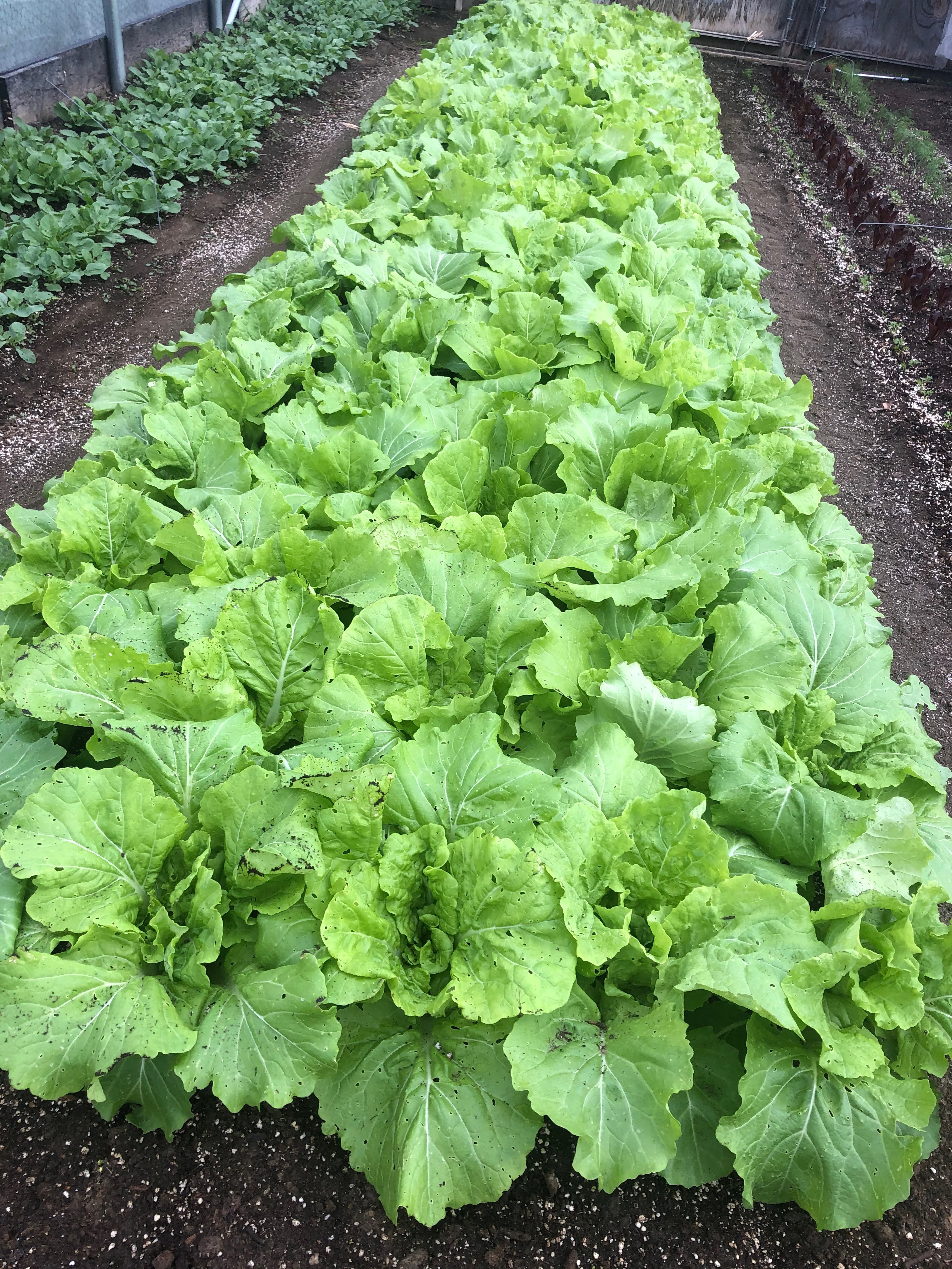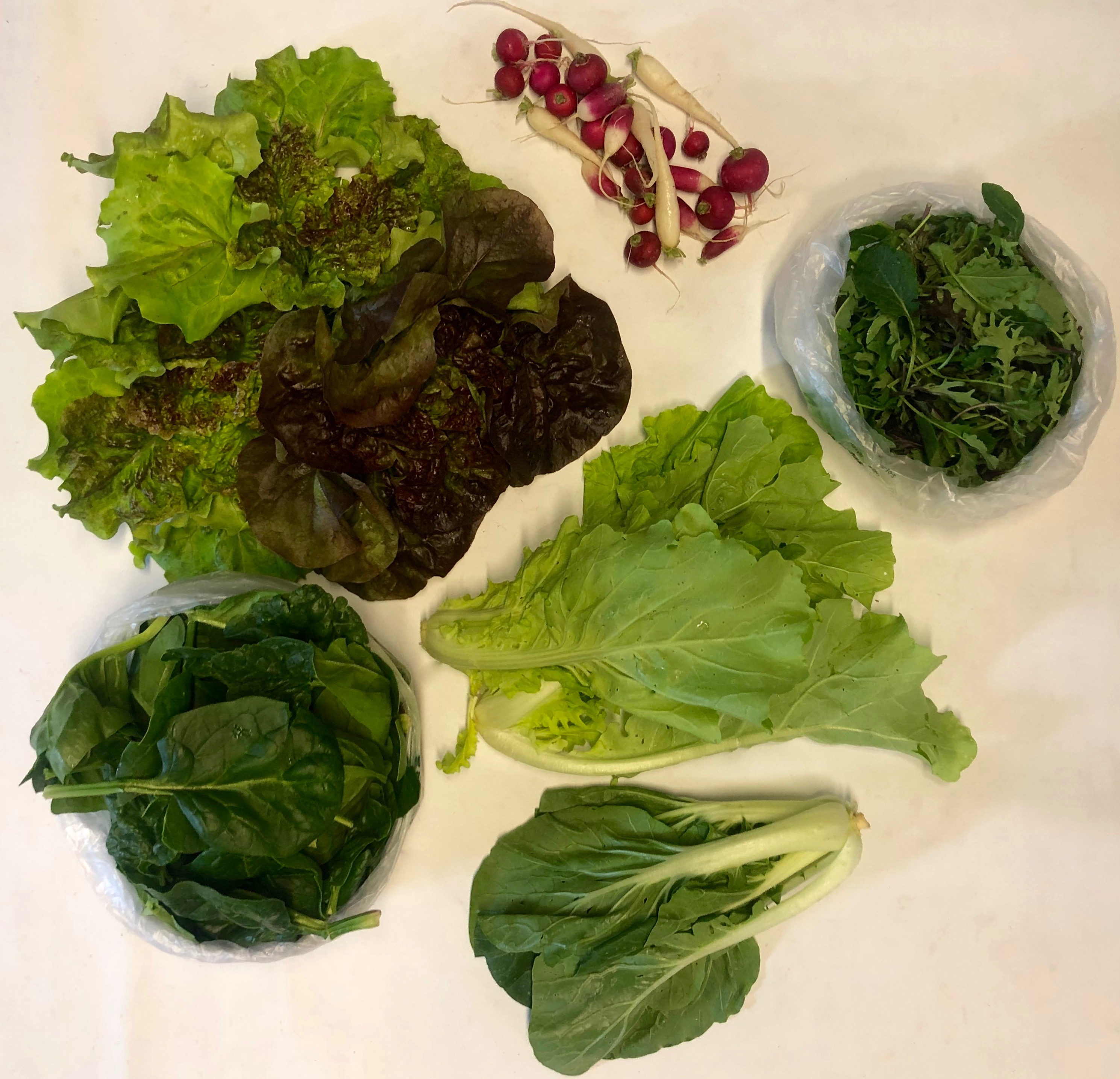 butterhead lettuces, HUGE! bags of spinach, pac choi, tokyo bekana, radish medley, baby kale mix