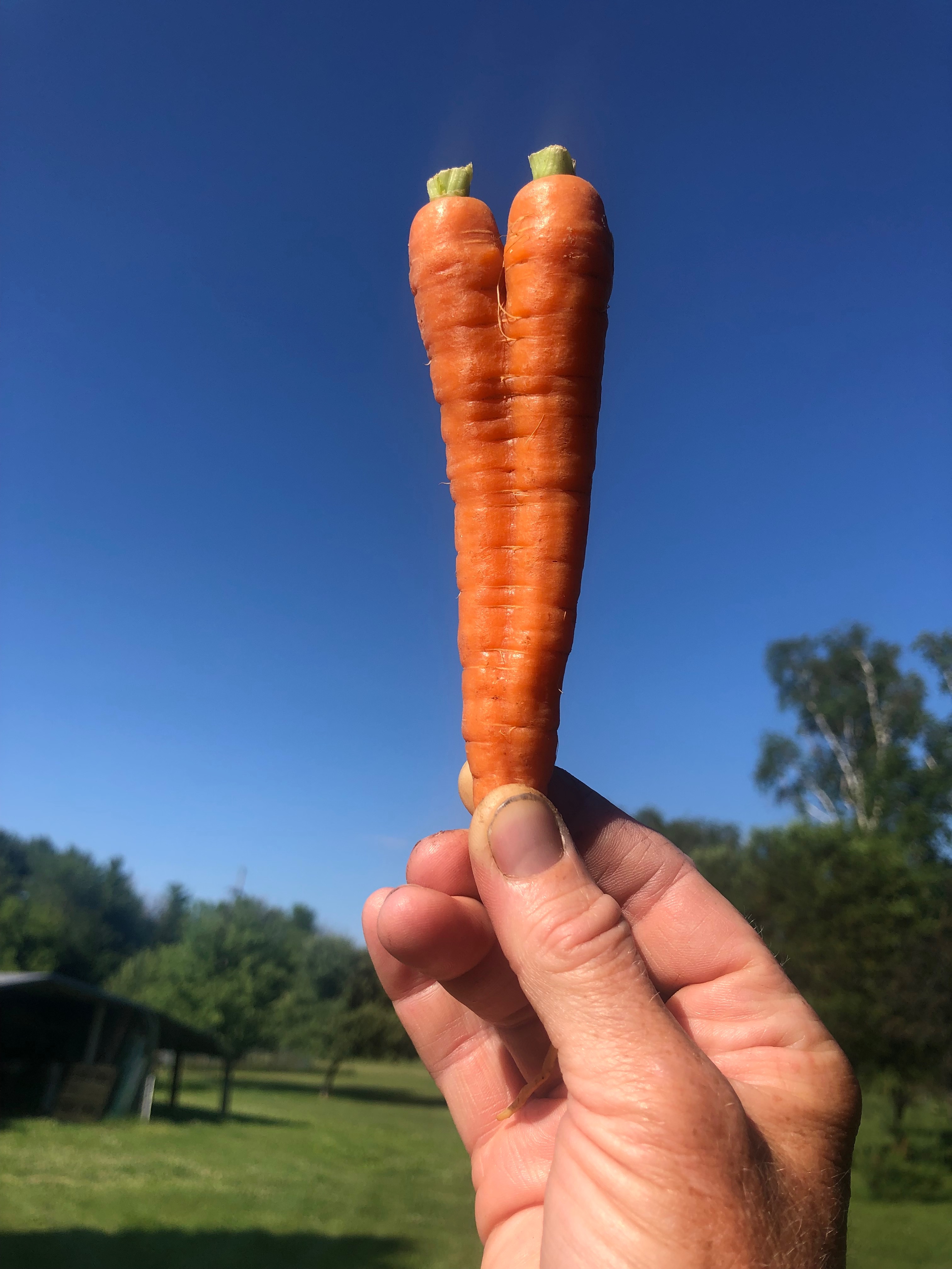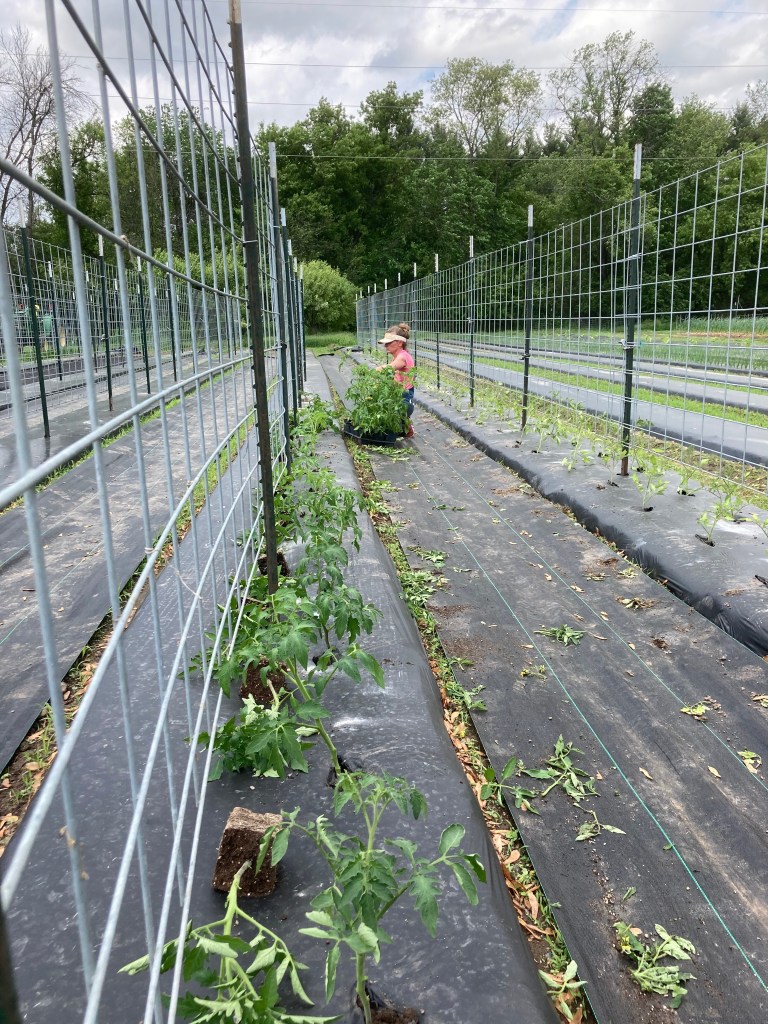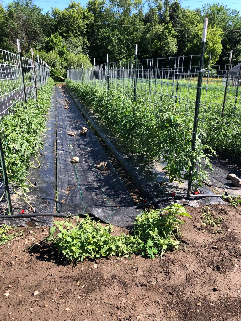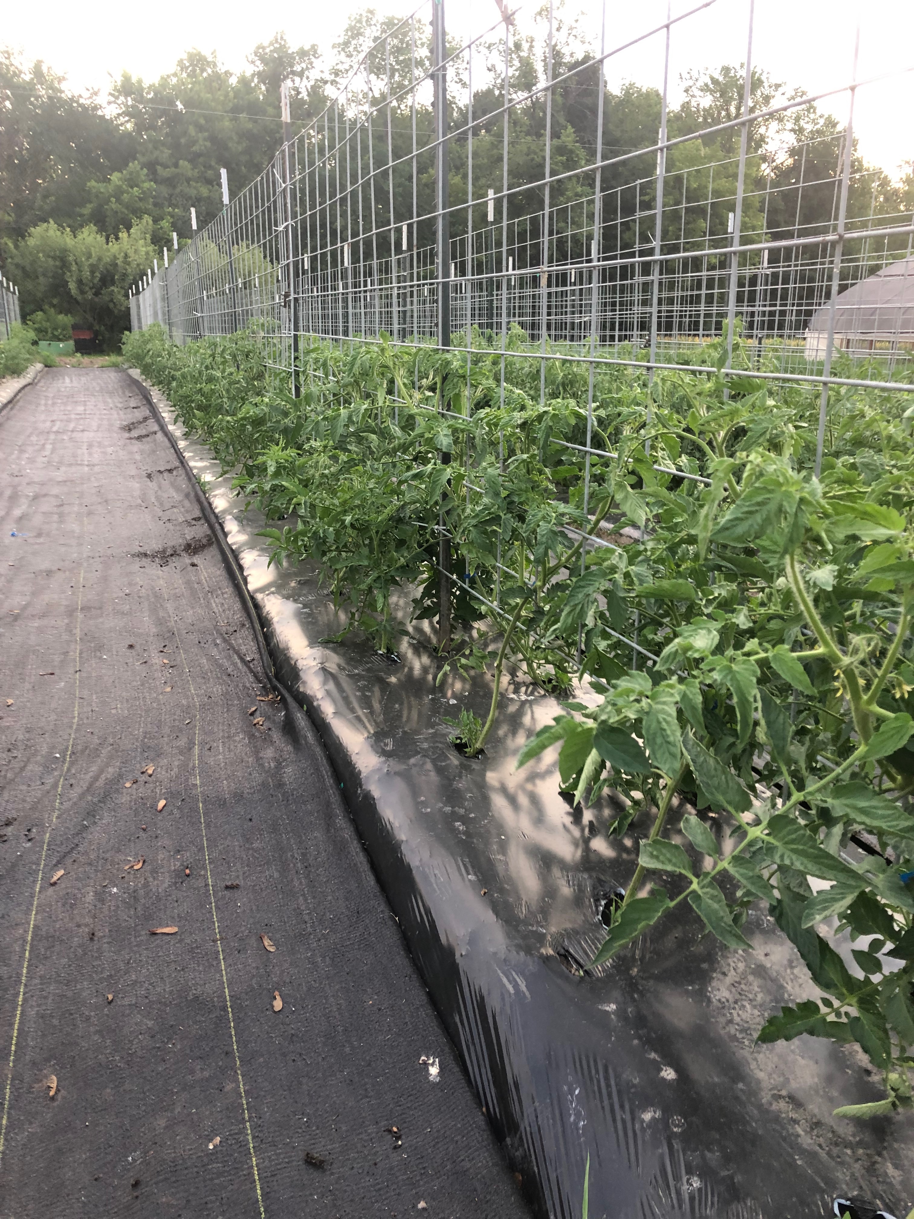 Another powerhouse week. We continued our weeding marathon all week long and made our way through a 2nd pass in hoop 2 and all the carrots and beets look perfect. 2nd passes in the onions and beans and peppers too. Scott is weed wacking the walkways and edges and in his free time tied up the tomato plants on the trellis as they shot right up in the heat and irrigation. Tomatoes are forming and the plants look strong. Best news is……the potato patch walkways are covered and it is 100% weed free! A huge thank you to Cousin John for cultivating the walkways before we came to lay the landscape fabric. 500 staples and a few hours later it looks fabulous. The plants are just starting to flower and I think this is going to be a best ever year for us with potatoes. Fingers crossed.