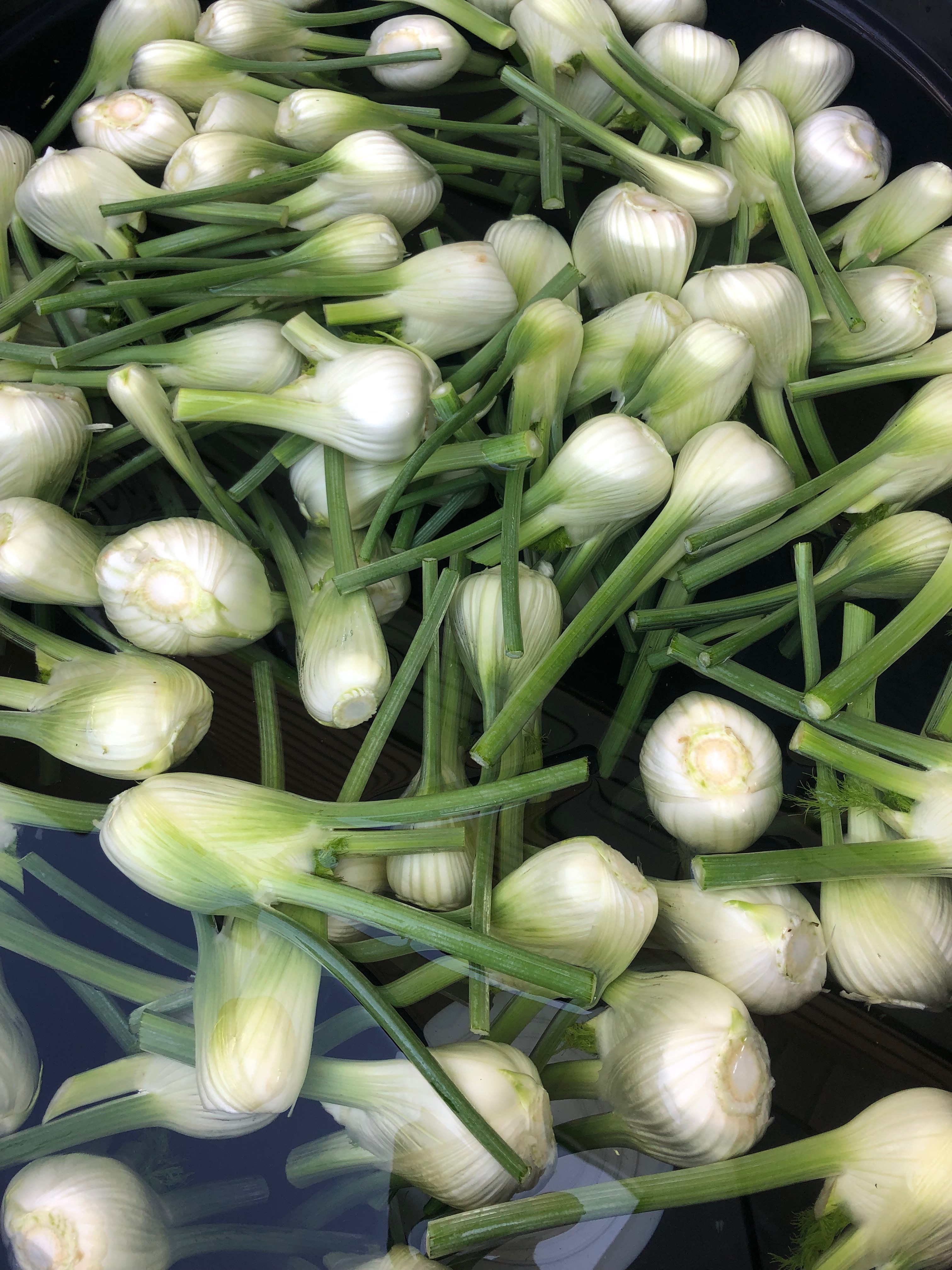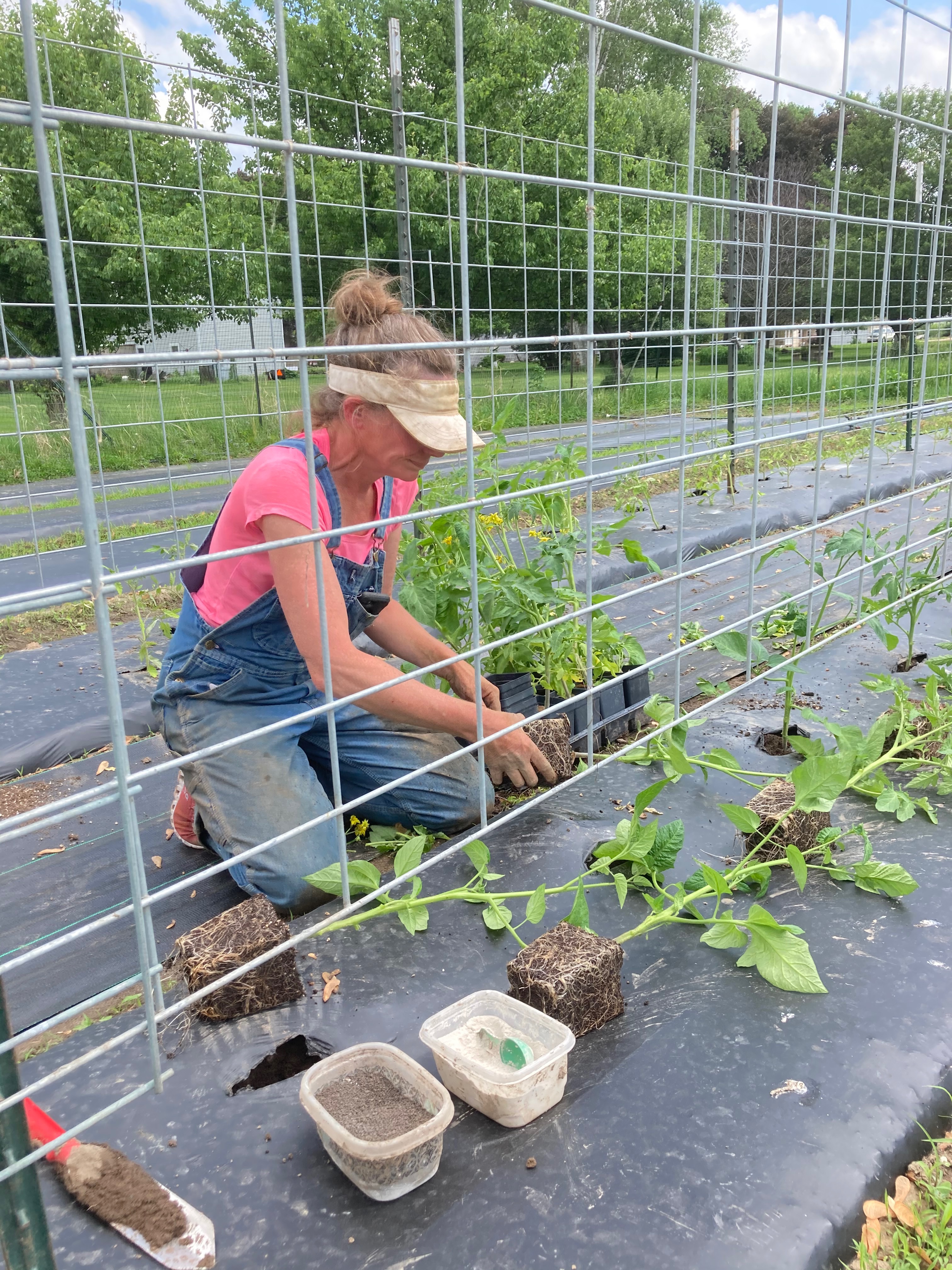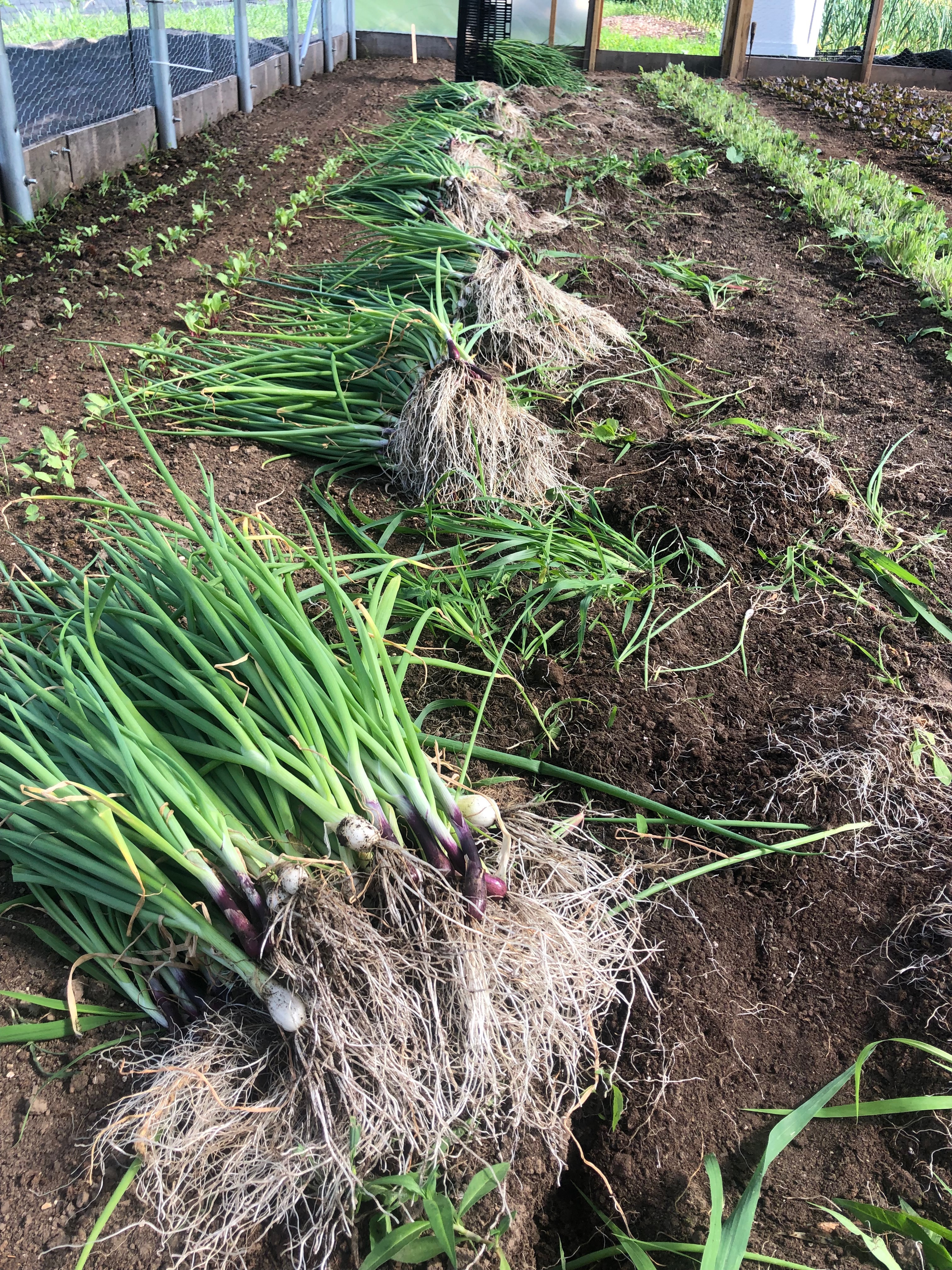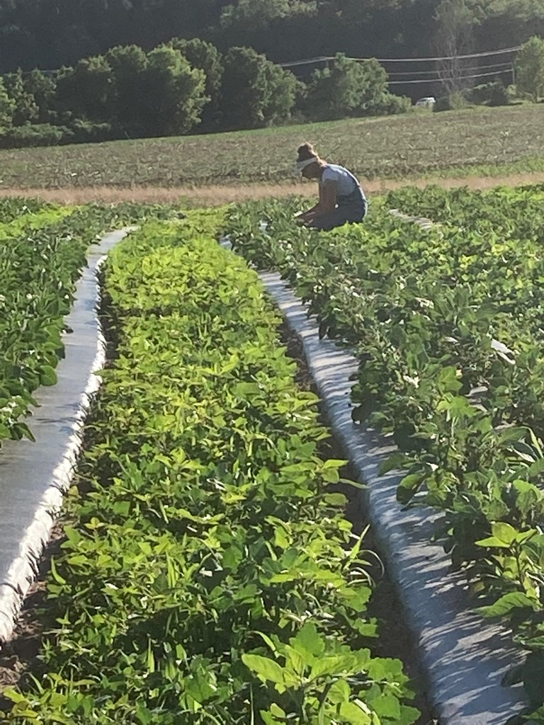 Another powerhouse week. We continued our weeding marathon all week long and made our way through a 2nd pass in hoop 2 and all the carrots and beets look perfect. 2nd passes in the onions and beans and peppers too. Scott is weed wacking the walkways and edges and in his free time tied up the tomato plants on the trellis as they shot right up in the heat and irrigation. Tomatoes are forming and the plants look strong. Best news is……the potato patch walkways are covered and it is 100% weed free! A huge thank you to Cousin John for cultivating the walkways before we came to lay the landscape fabric. 500 staples and a few hours later it looks fabulous. The plants are just starting to flower and I think this is going to be a best ever year for us with potatoes. Fingers crossed.