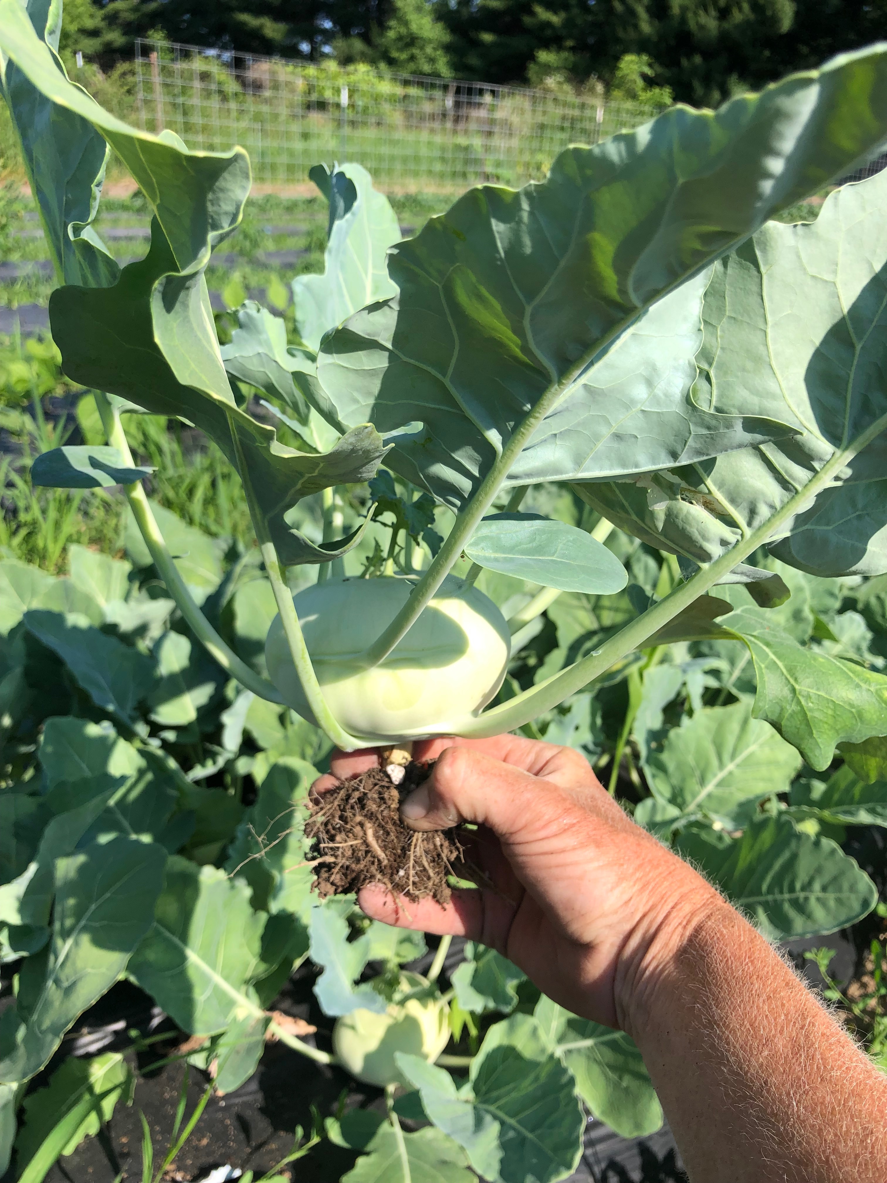 Kohlrabi-White and green. These are the last of the huge harvest. They will return in Fall.