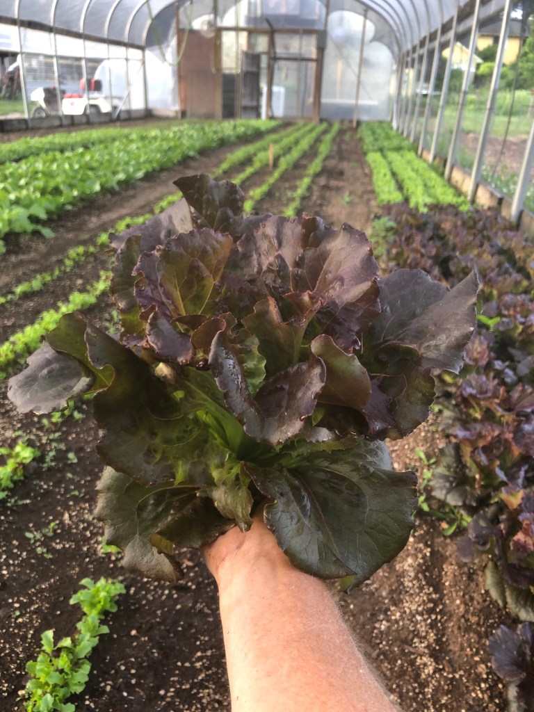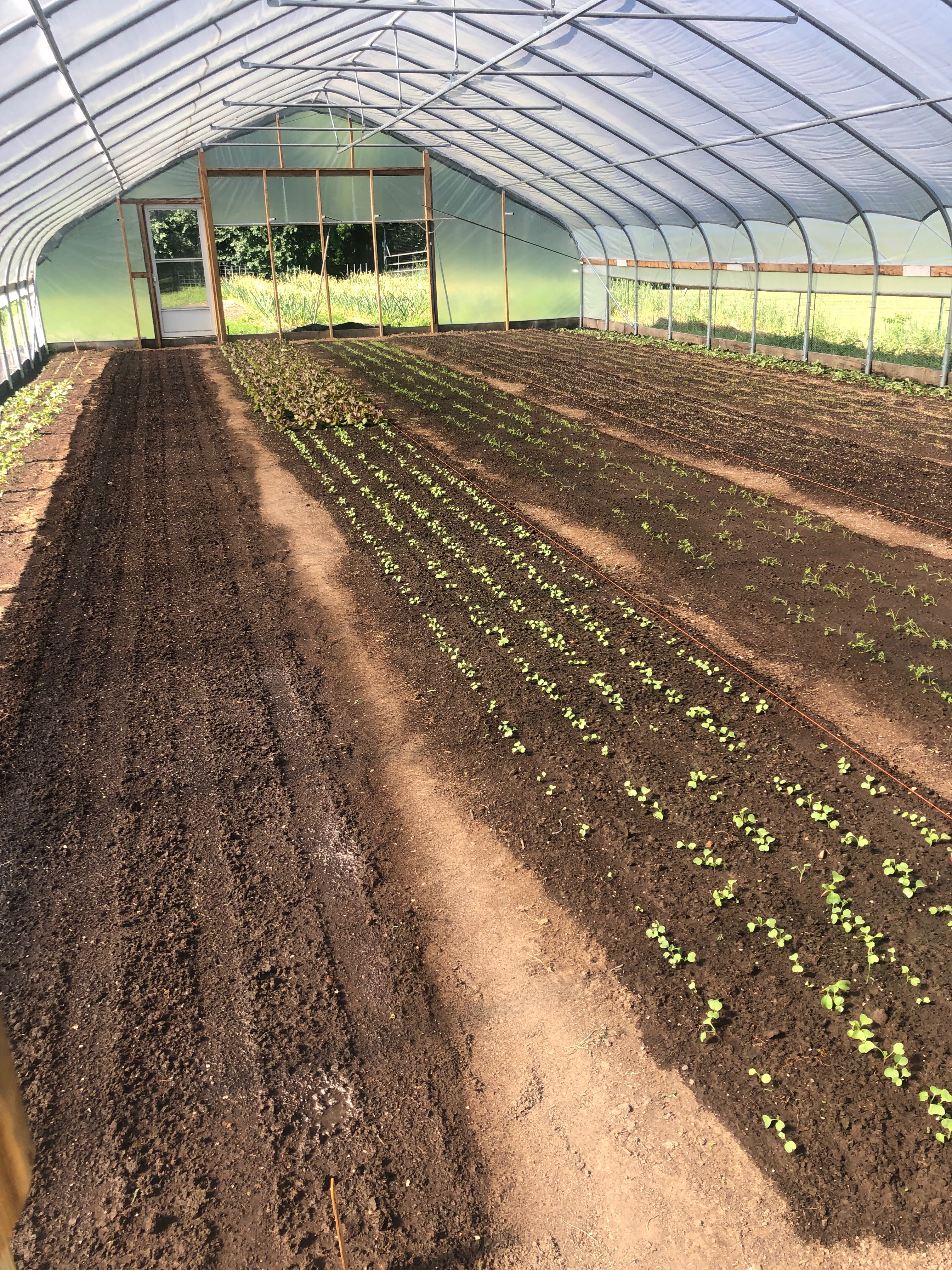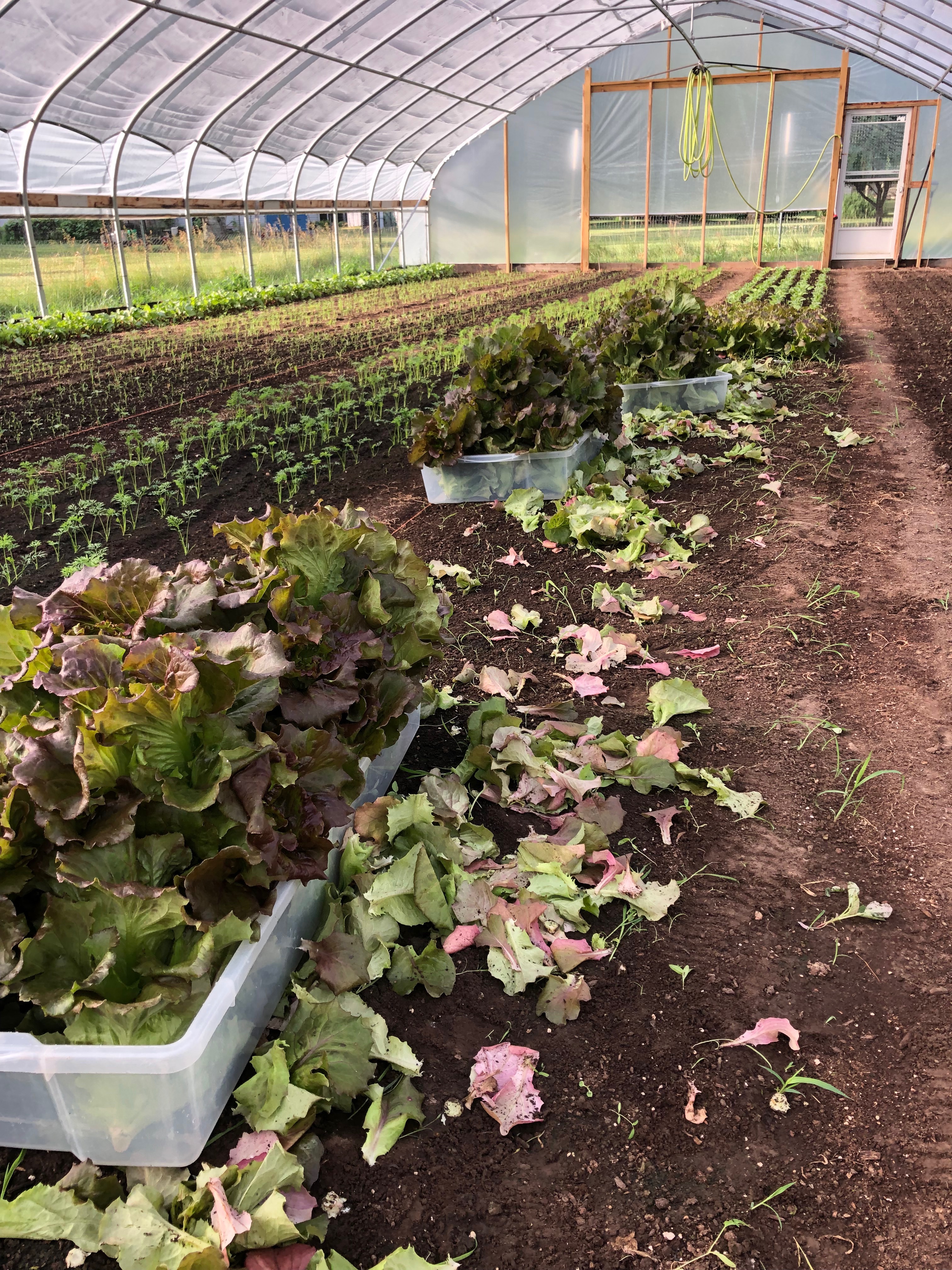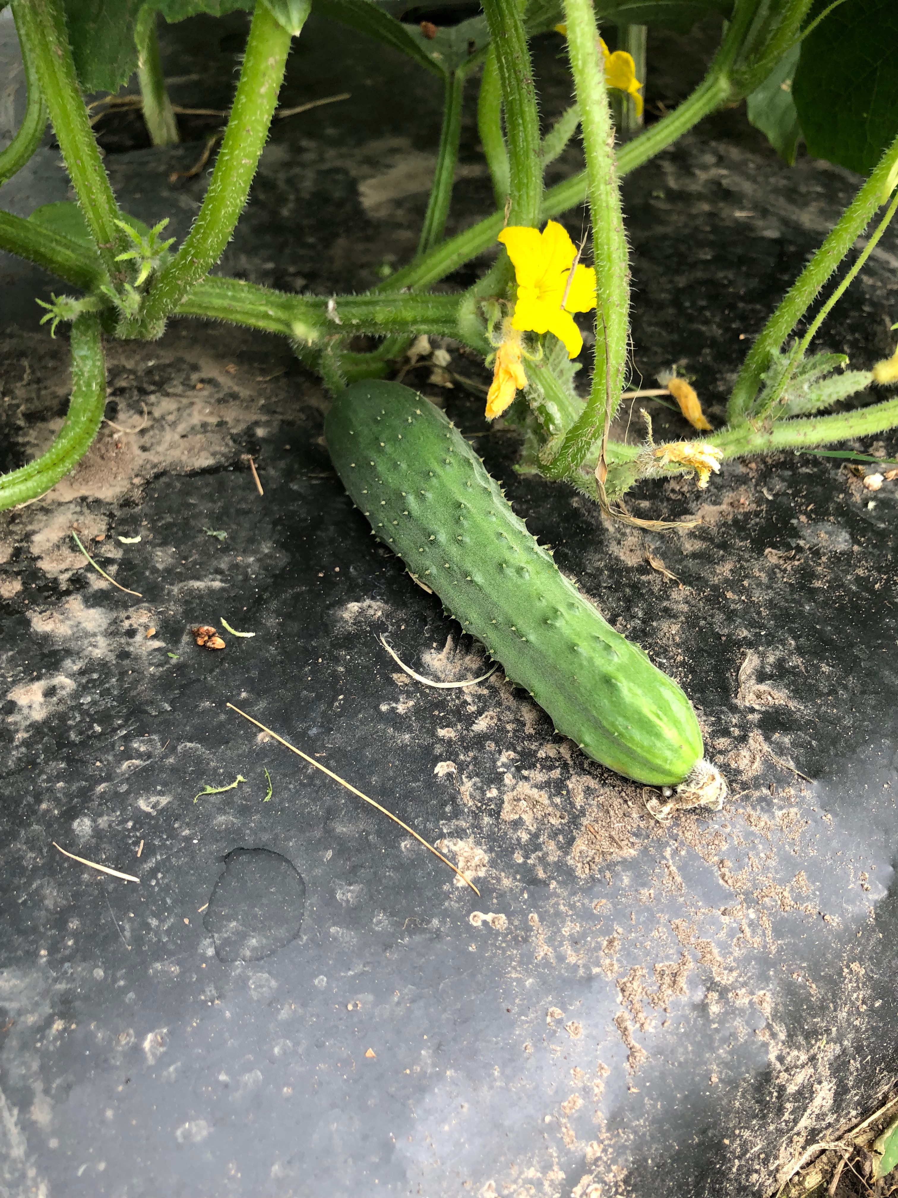 We transplanted lettuce into hoop 1 after harvest and got looooong rows of broccoli and cabbage out in the garden for a later harvest. More cucumber transplants went in to extend our rotation just as we saw the 1st cucumbers forming on the 1st plants.
