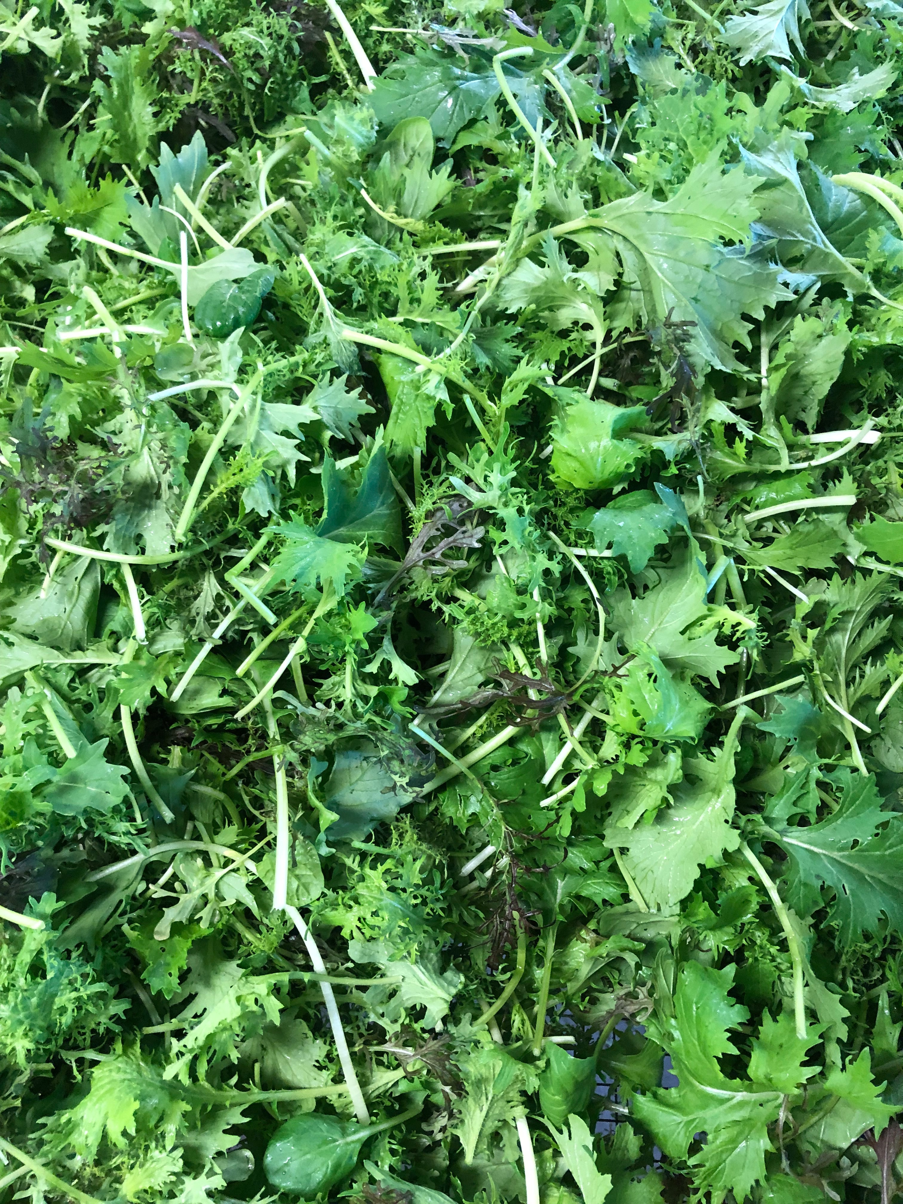 Asian Greens mix-Spicy. Great in fresh salads or lightly saute with garlic scapes.