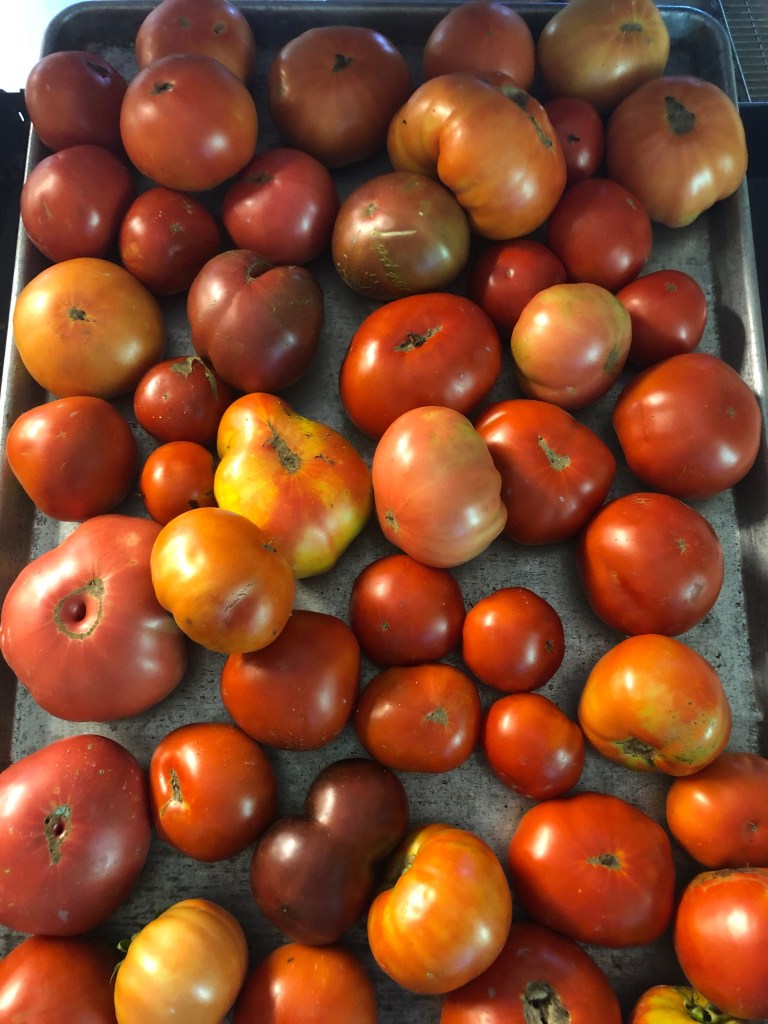 We are in full summer garden bounty mode here. HUGE! harvests hauled up from the garden and the tomatoes are kicking in and the peppers too. The days are full and happy. Irrigation is running around the clock as it is dry but we are keeping up. The plants love the heat and bright sunshine. All outside crops are in for the season and we joke we are riding the wave to the end now…..it’s fun to watch the brussels sprouts grow tall and the squash size up.