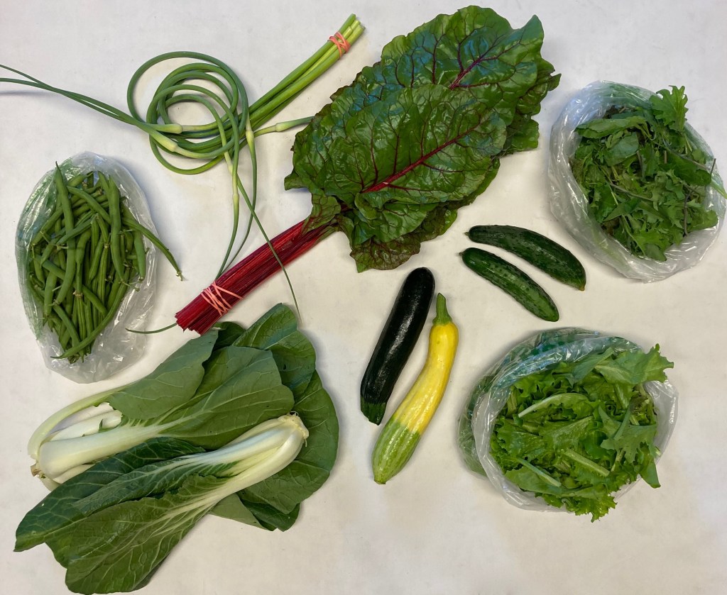 head lettuce, leaf lettuce (full only), bell peppers, cucumbers, arugula, sweet summer onions, purple filet beans, carrots, kohlrabi, basil, slice tomatoes, cherry tomatoes, zucchini, sweet mini peppers (full only)