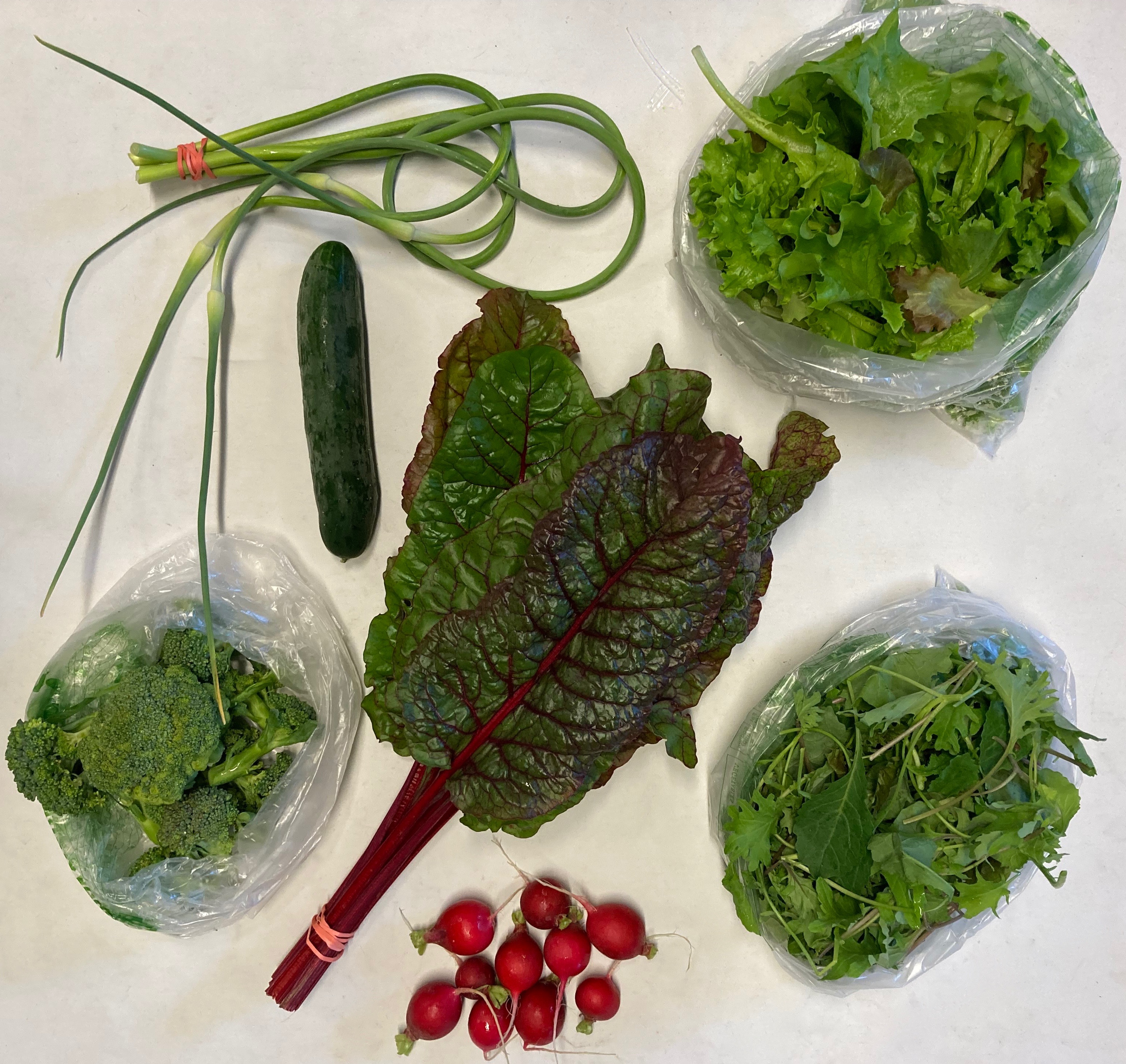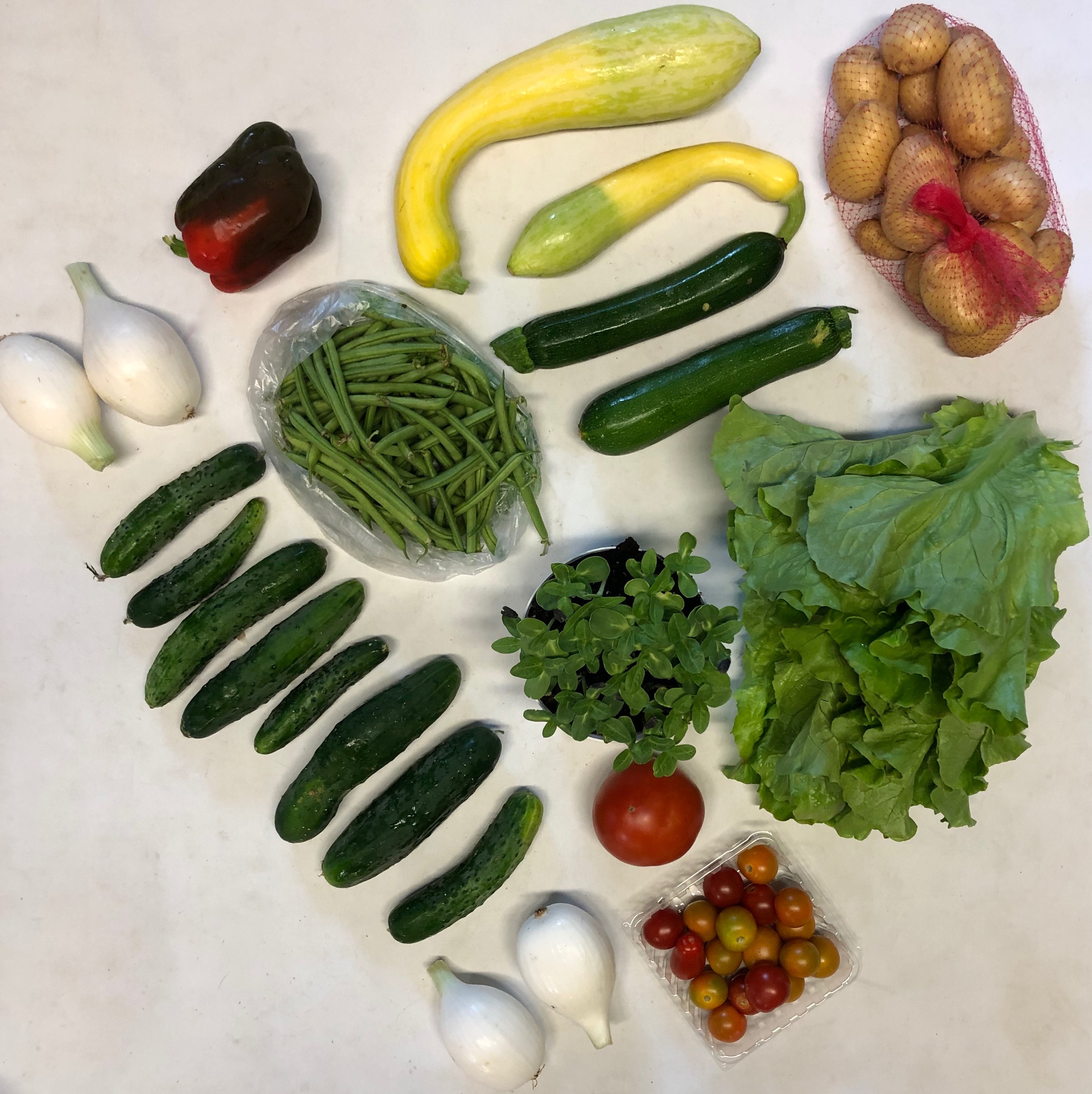 head lettuce, leaf lettuce (full only), bell peppers, cucumbers, arugula, sweet summer onions, purple filet beans, carrots, kohlrabi, basil, slice tomatoes, cherry tomatoes, zucchini, sweet mini peppers (full only)
