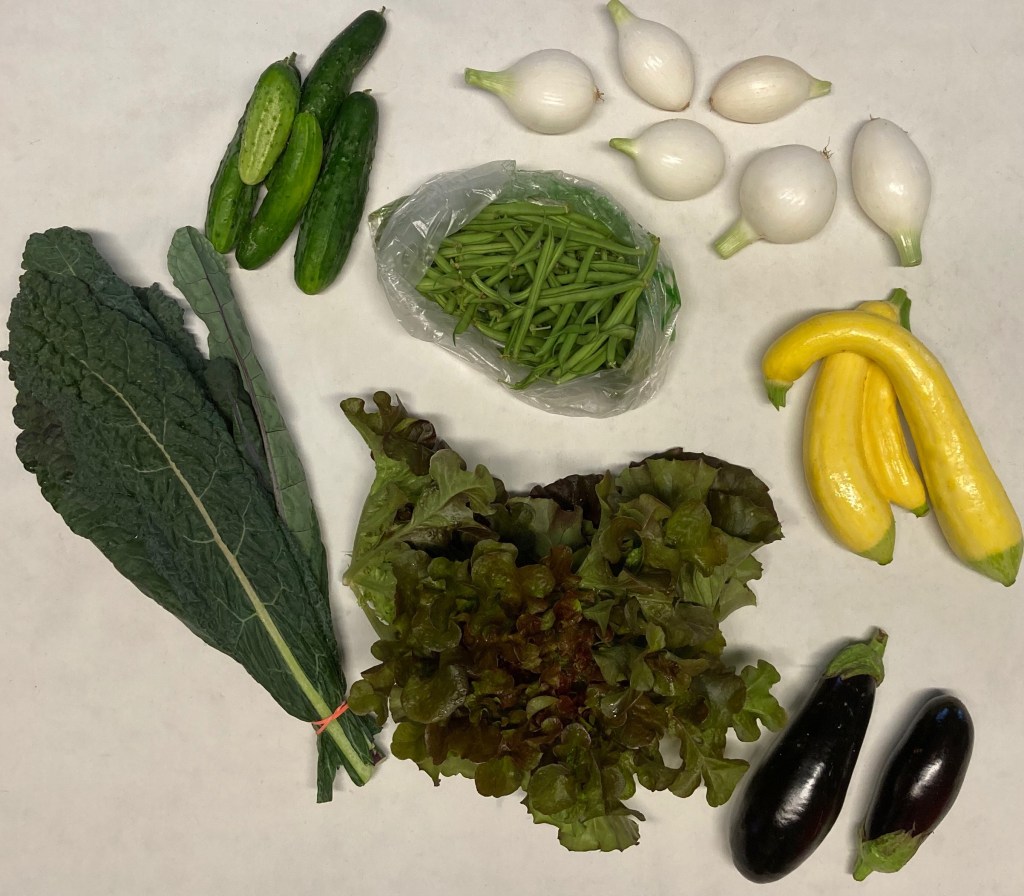 Head Lettuce, Kale, Zucchini, green beans, cucumber sweet onions, and eggplant (Full only)