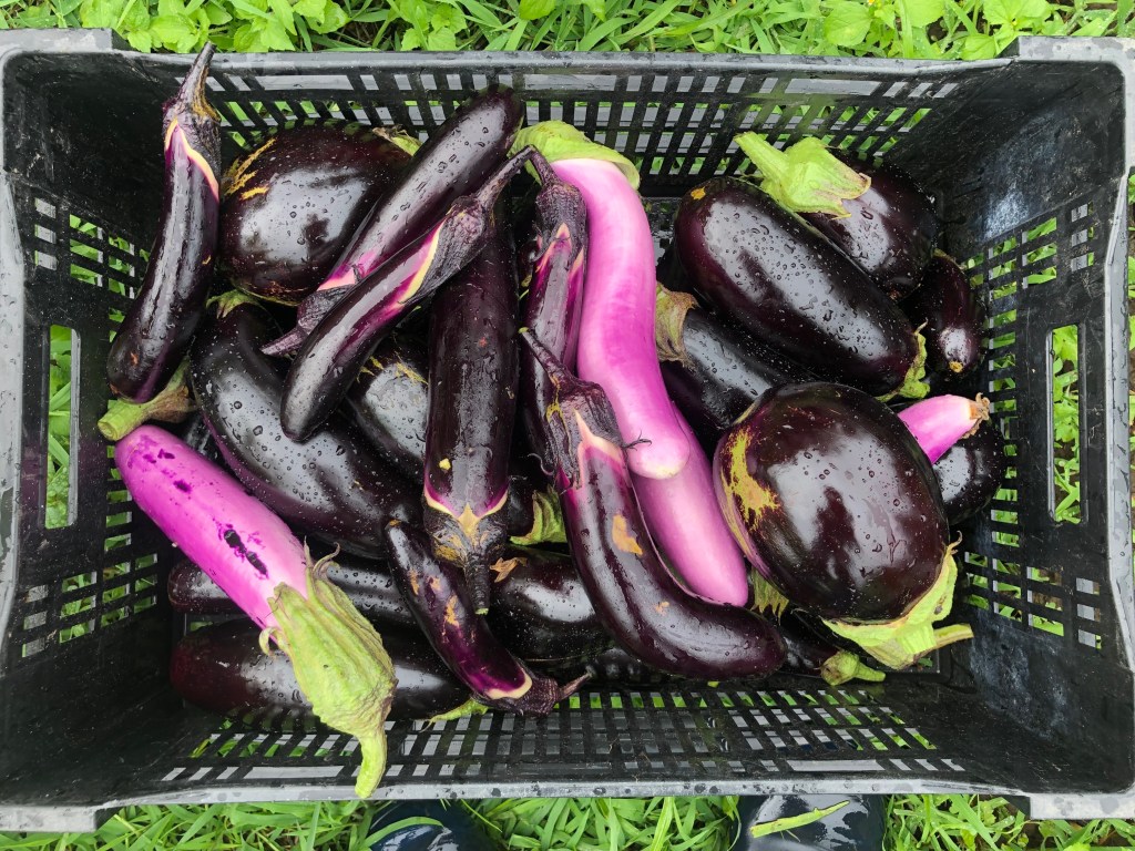 Eggplant (full only)-HUGE! Surprise that the eggplant had such an abundant harvest this week. The plants are large and strong this year. We are thrilled after a so so eggplant year last year.