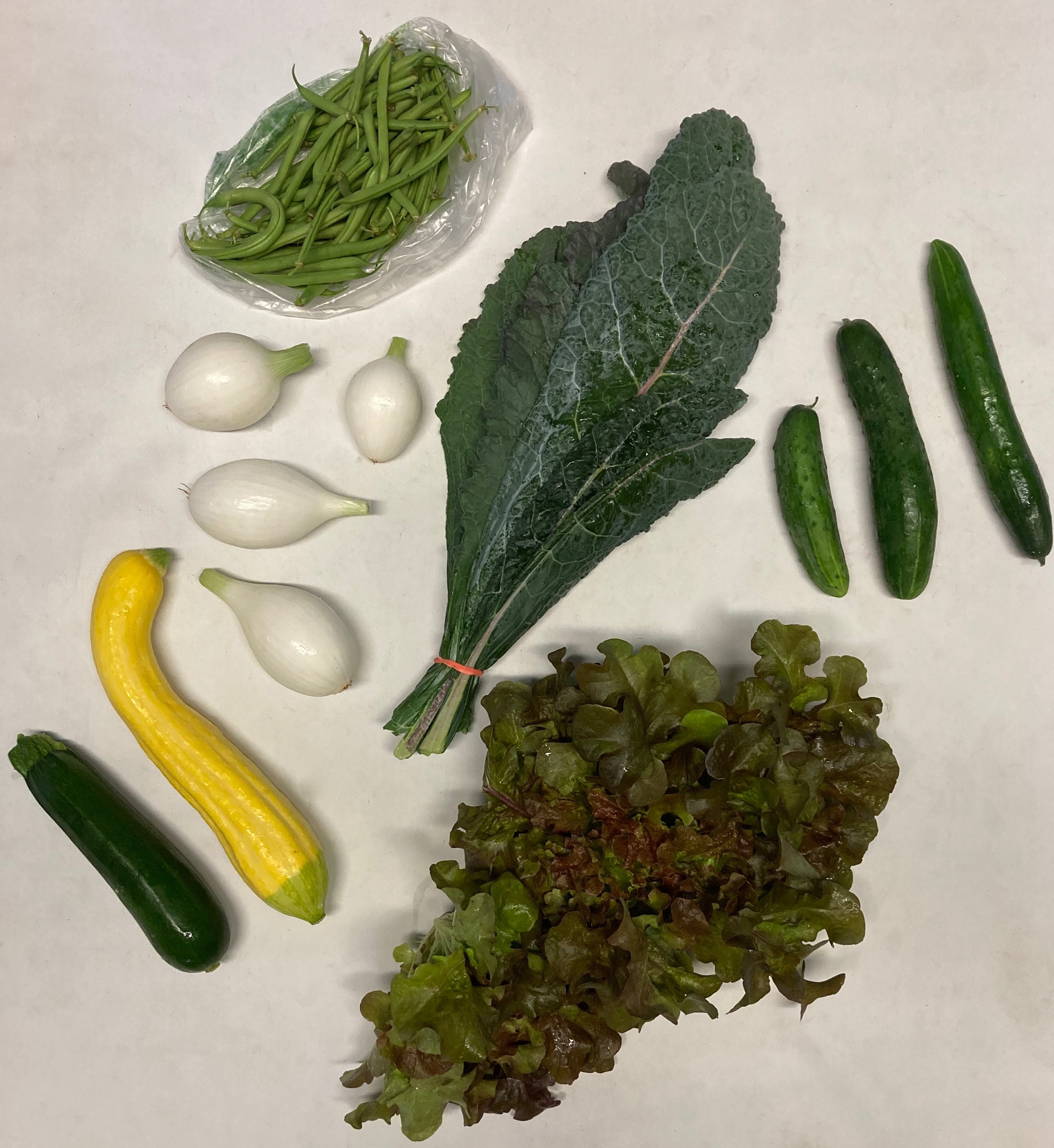 Head Lettuce, Kale, Zucchini, green beans, cucumber sweet onions, and eggplant (Full only)