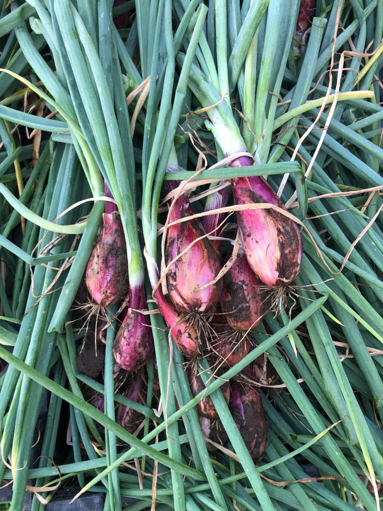 Shallots-A mild onion flavor. We planted tons of shallots this year and harvested a few early birds for fun.