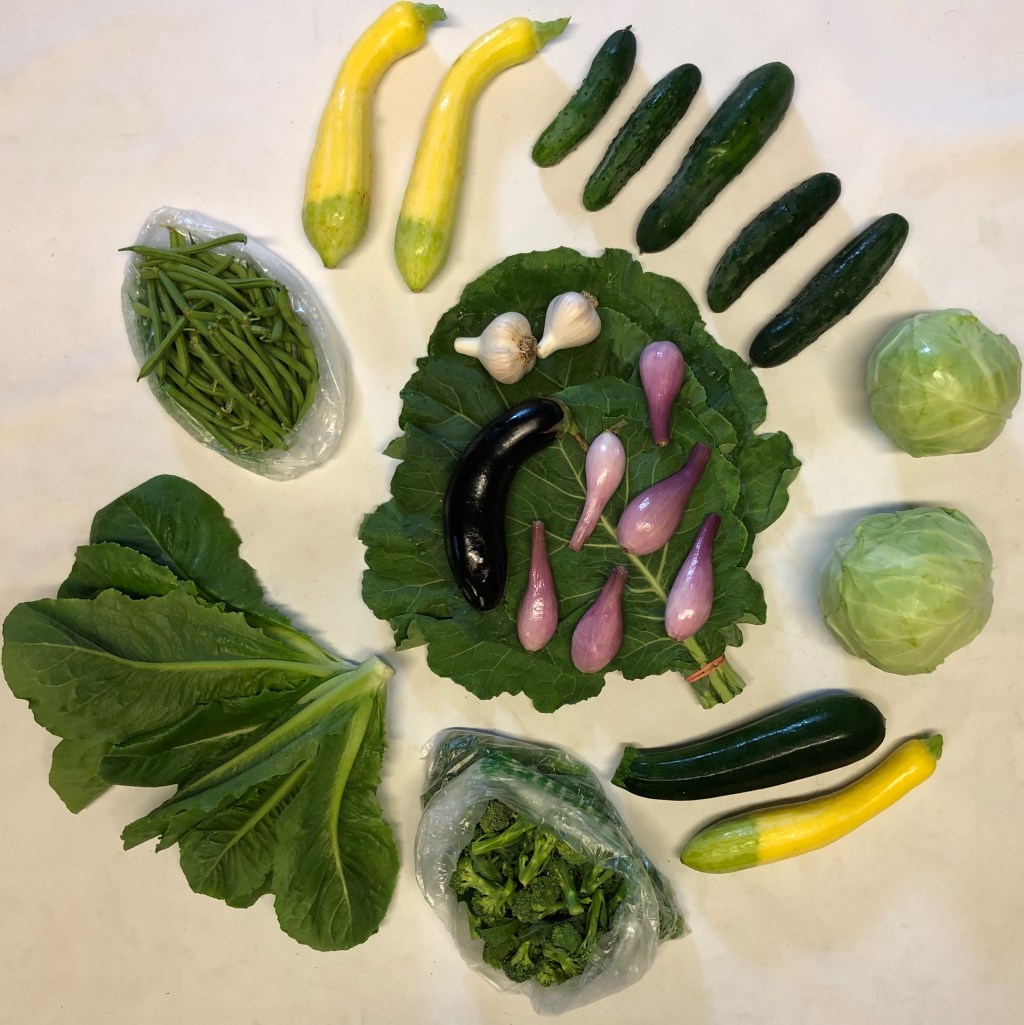 Head lettuce, cucumbers, zucchini, beans, beets (snack only), collard greens, garlic, shallots, cabbage, and eggplant (full only), broccoli side shoots (full only)