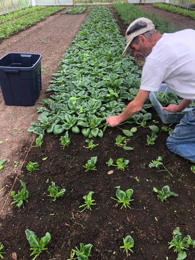 Scott harvesting leaf by leaf by leaf.Triple rinsed spinach in the dunk tank.
