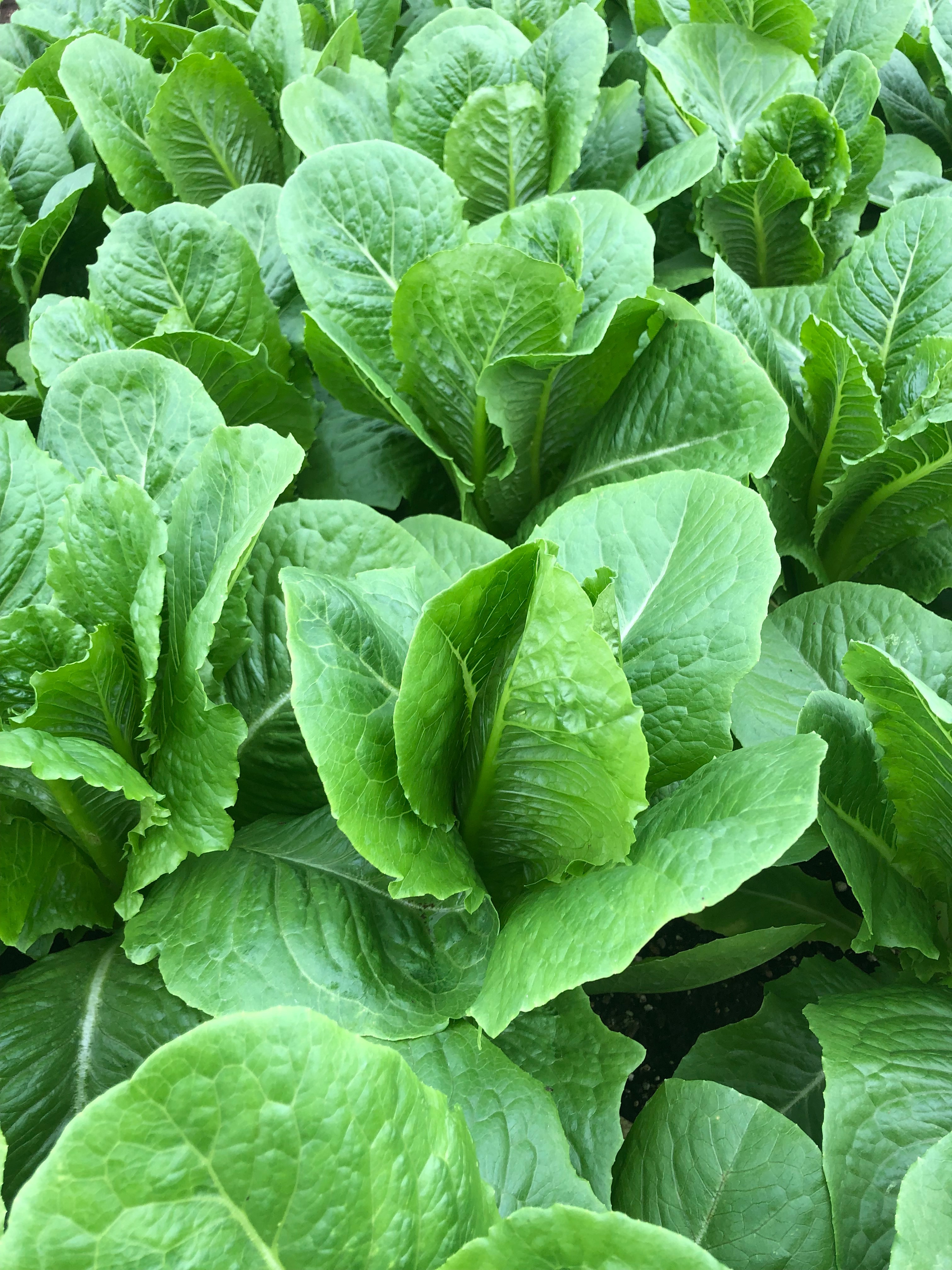 Head Lettuce-We harvested a mid sized romaine from hoop 1 this week and it is delicious! Sweet and crunchy.