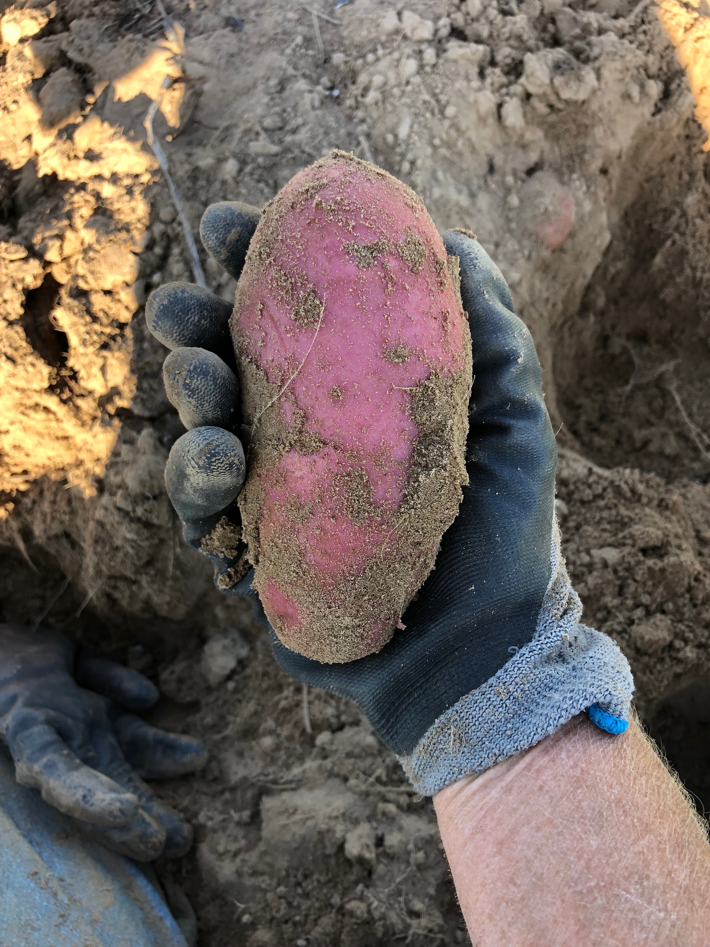 Hand digging the sweet potatoes.Making our way down the row as Scott forks.A big guy!oddball!Image of russeted skin.