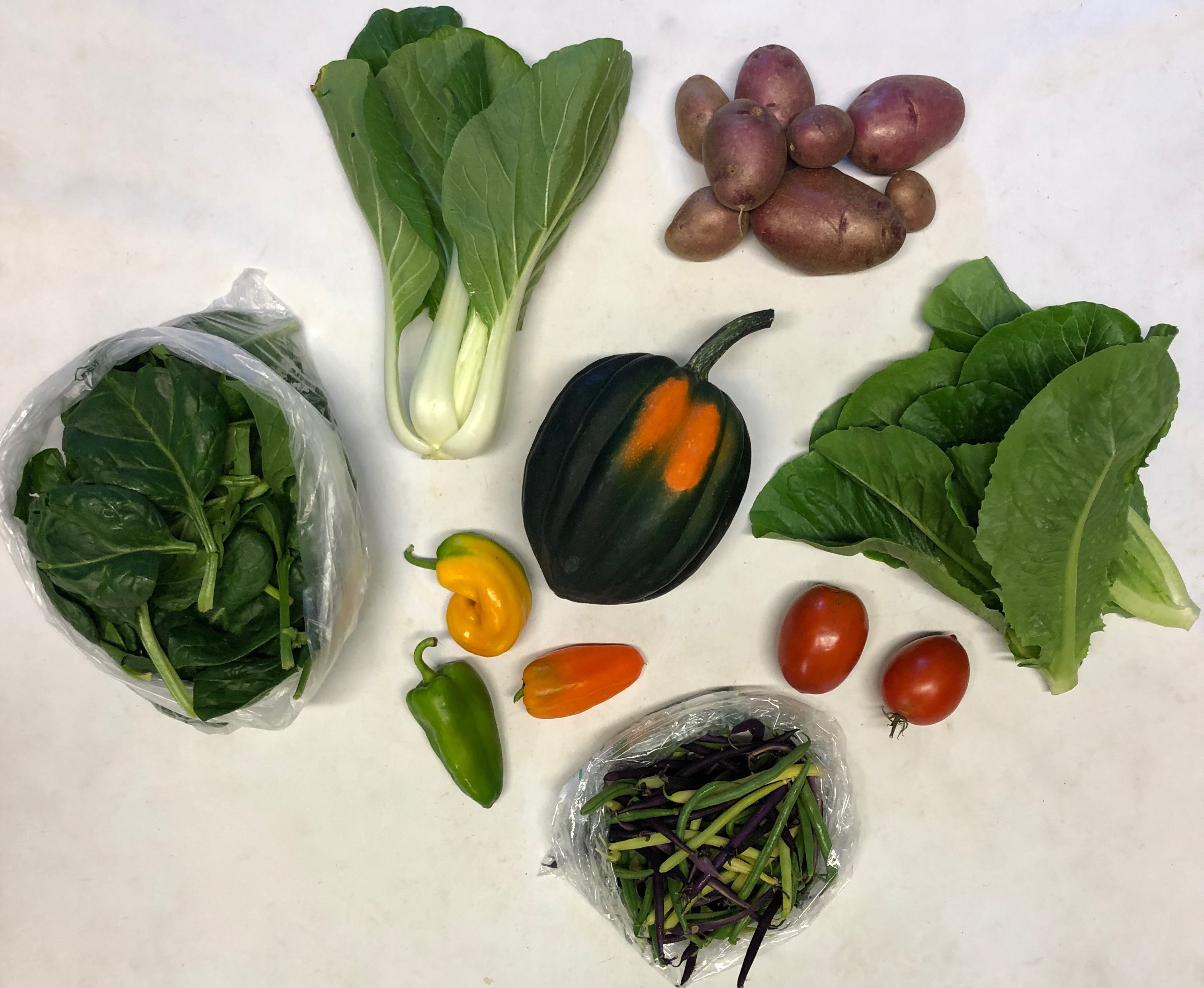 WHAT IS IN YOUR SHARE-HEAD LETTUCE, ASIAN GREENS MIX (FULL ONLY), SUNFLOWER BOUQUET, PURPLE POTATOES, TRI COLOR FILET BEAN MEDLEY, ITALIAN FRY PEPPERS, CHERRY TOMATOES, SLICE TOMATOES, EDAMAME, SPAGHETTI SQUASH, STORAGE ONIONS, ZUCCHINI, GARLIC