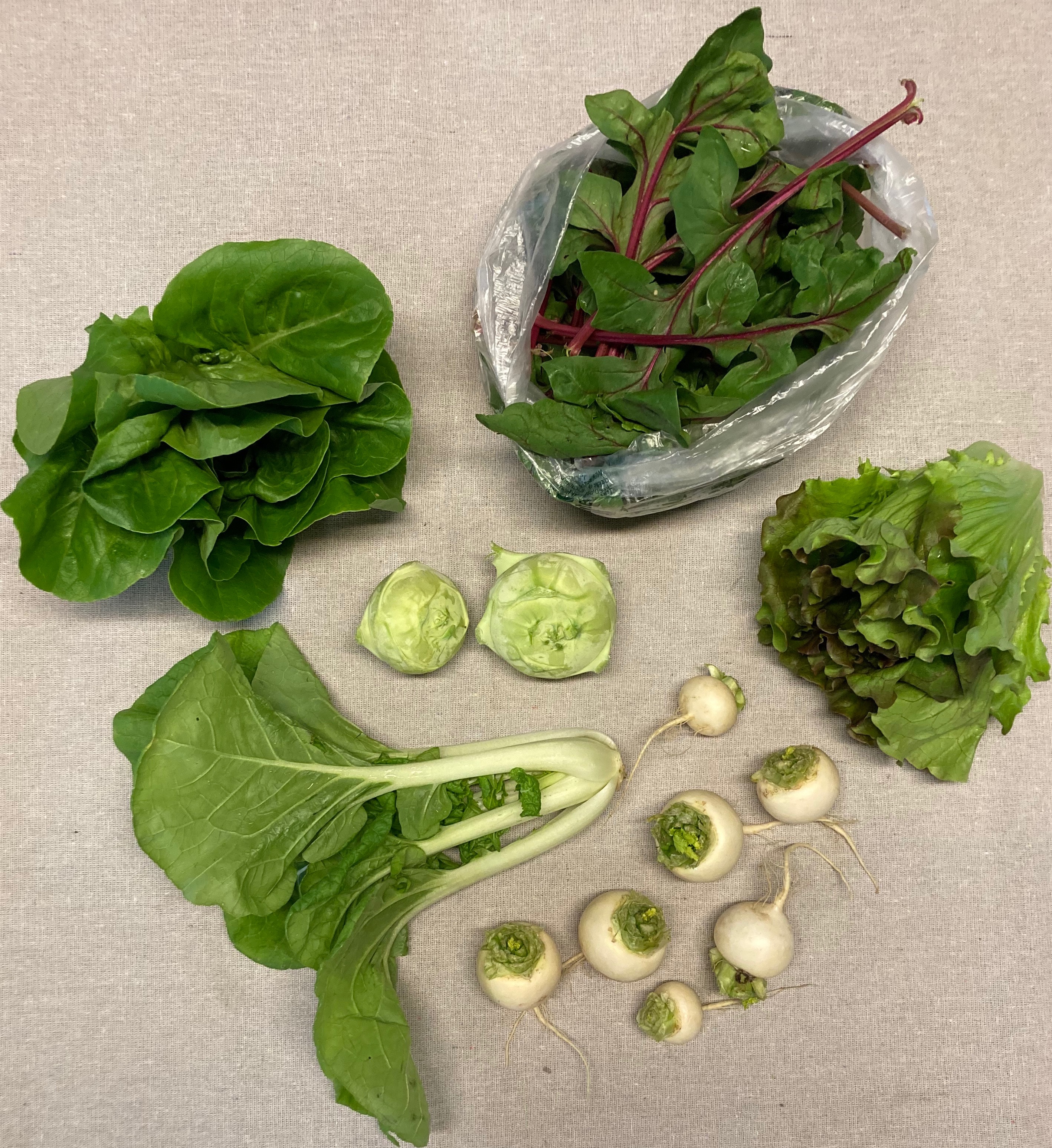What is in your share-pink spinach, 2 varieties of head lettuce, turnips, pac choi, 1st kohlrabi harvest!