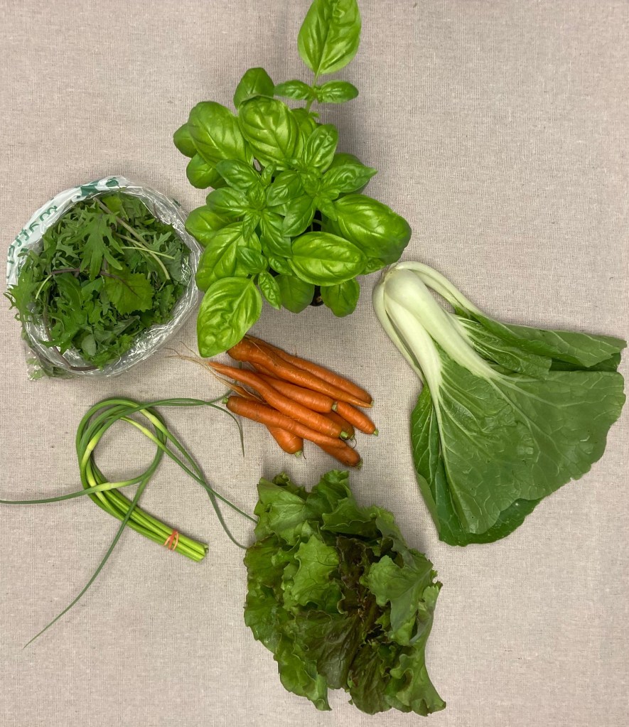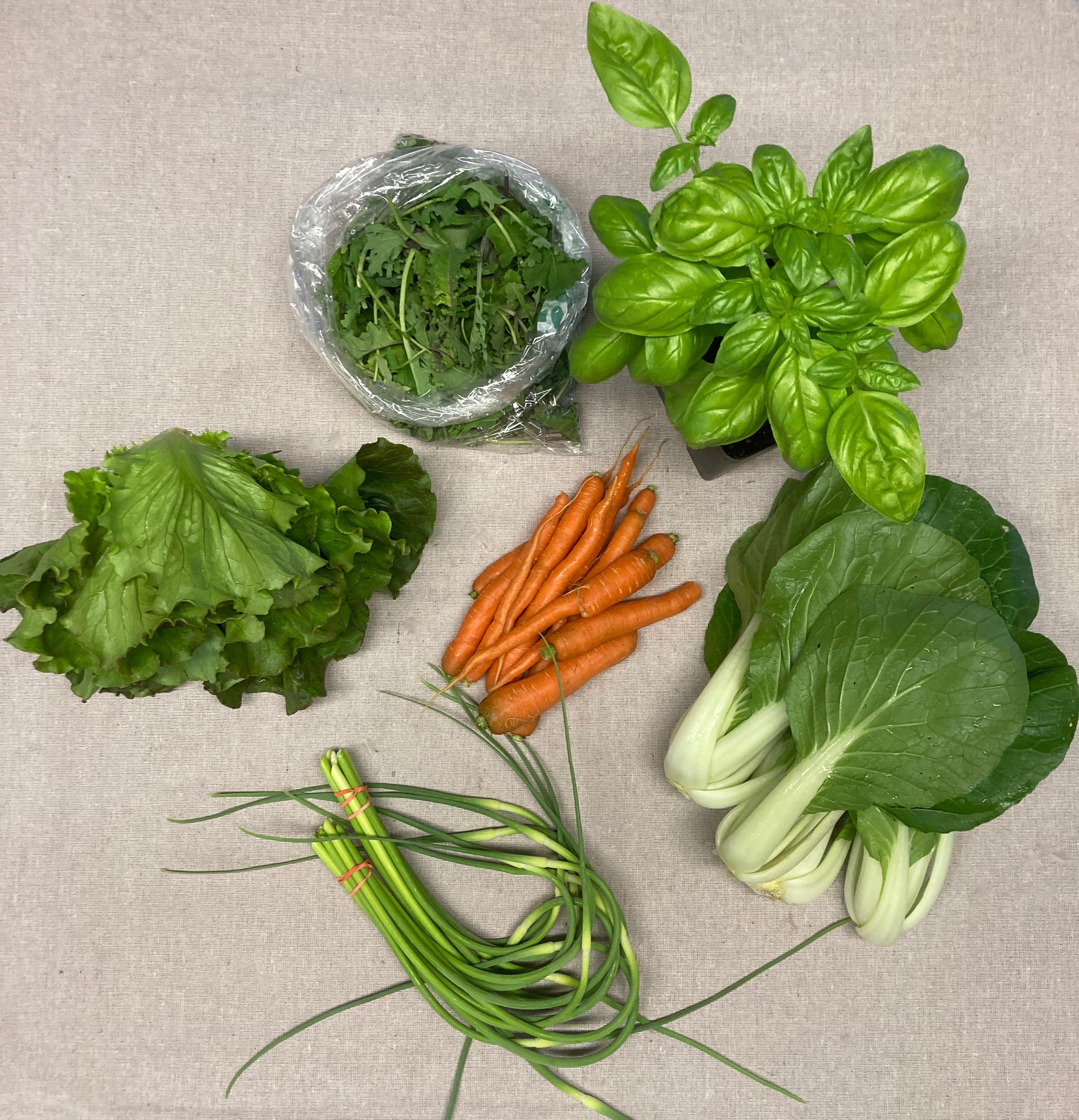 What is in your share-Head lettuce, baby kale mix, garlic scapes, carrots, pac choi and basil plant.