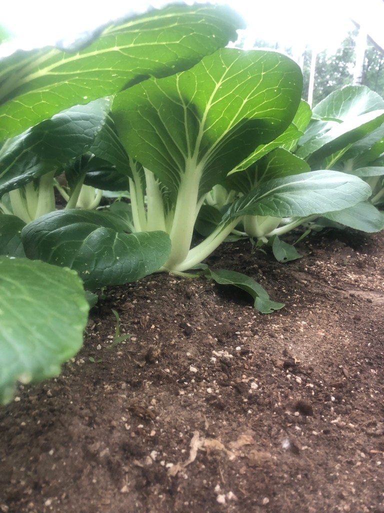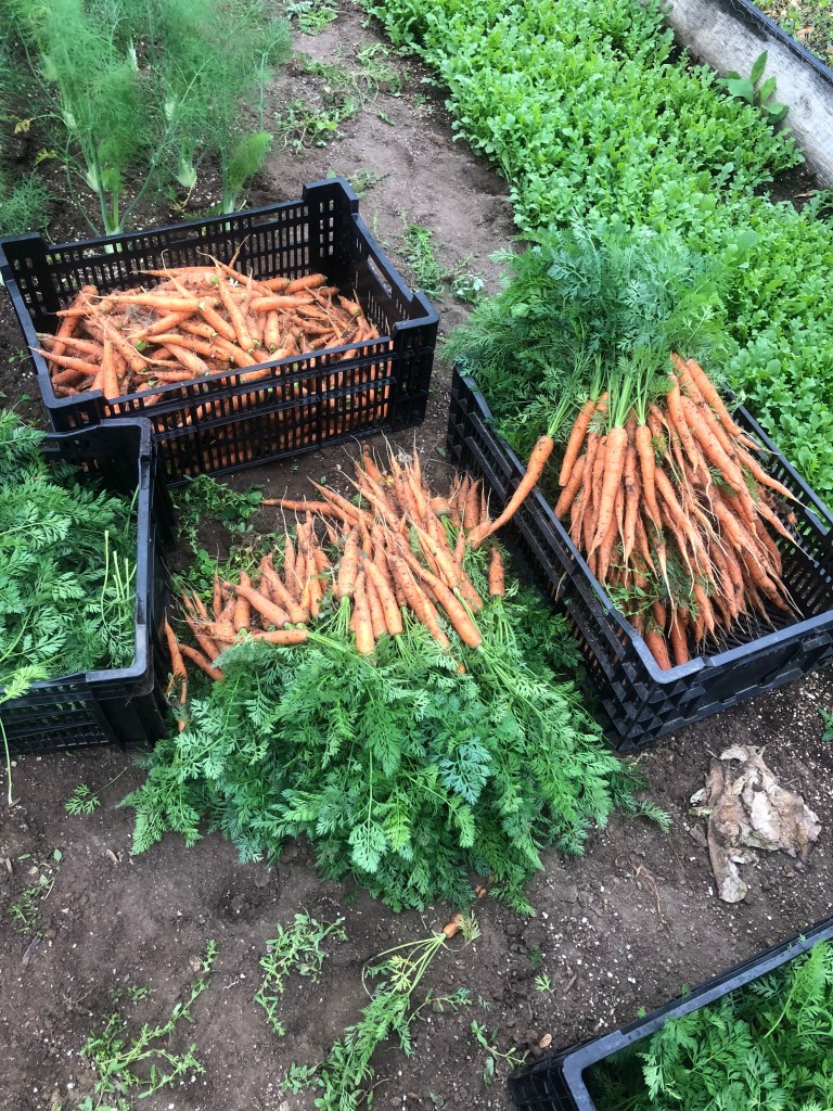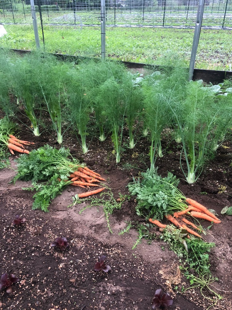 Carrots!-These crunchy delights were planted in hoop 1 in March. Maeve calls them “real carrots” because of the flavor. We plant the carrots in rows and then between the rows we planted baby head lettuce and in between the lettuce we planted fennel. First the lettuces came out for Spring Share and now the carrots-next week the fennel. We are able to harvest 3 crops out of 1 section of the greenhouse when space is tight in the early season.