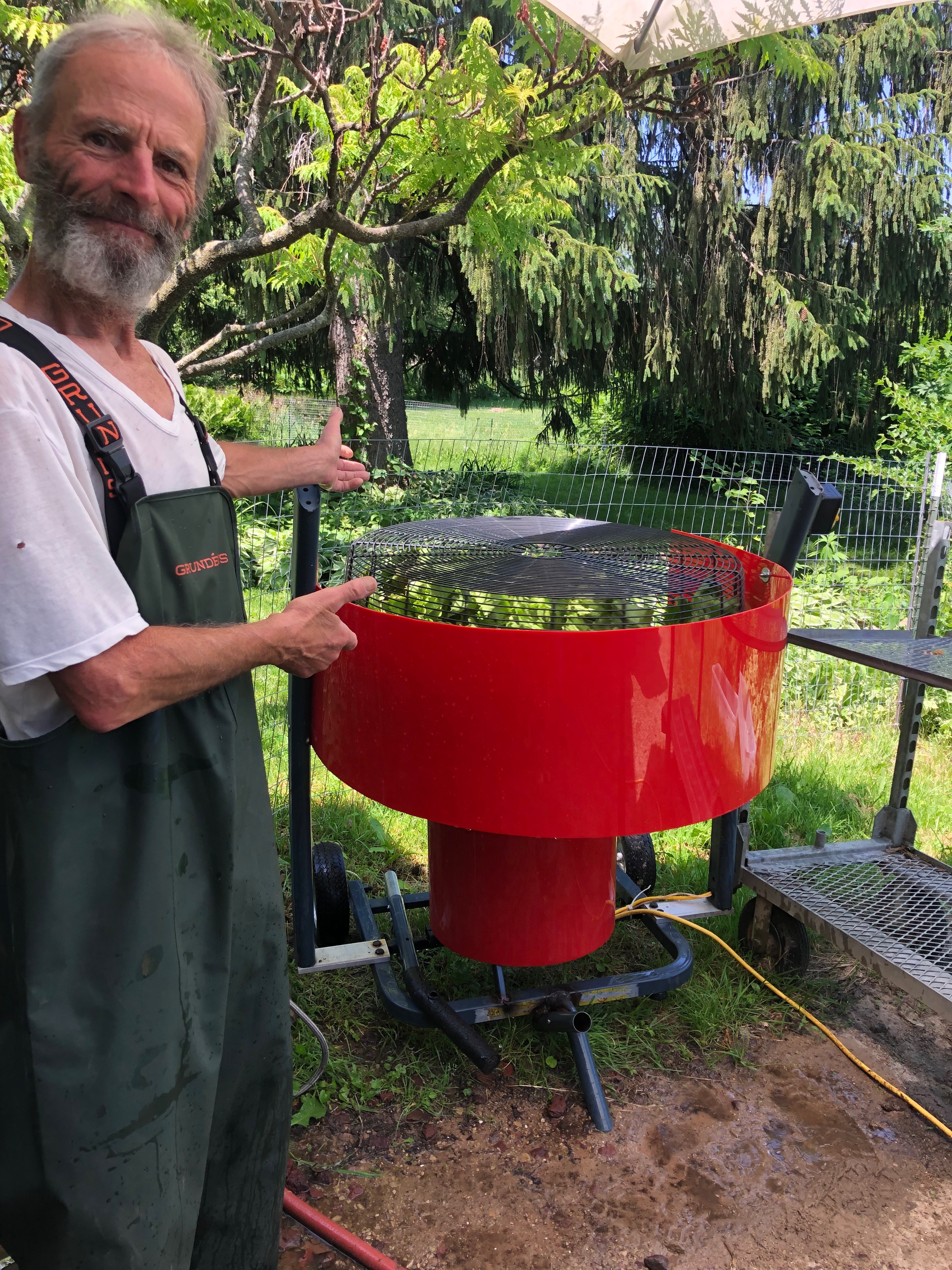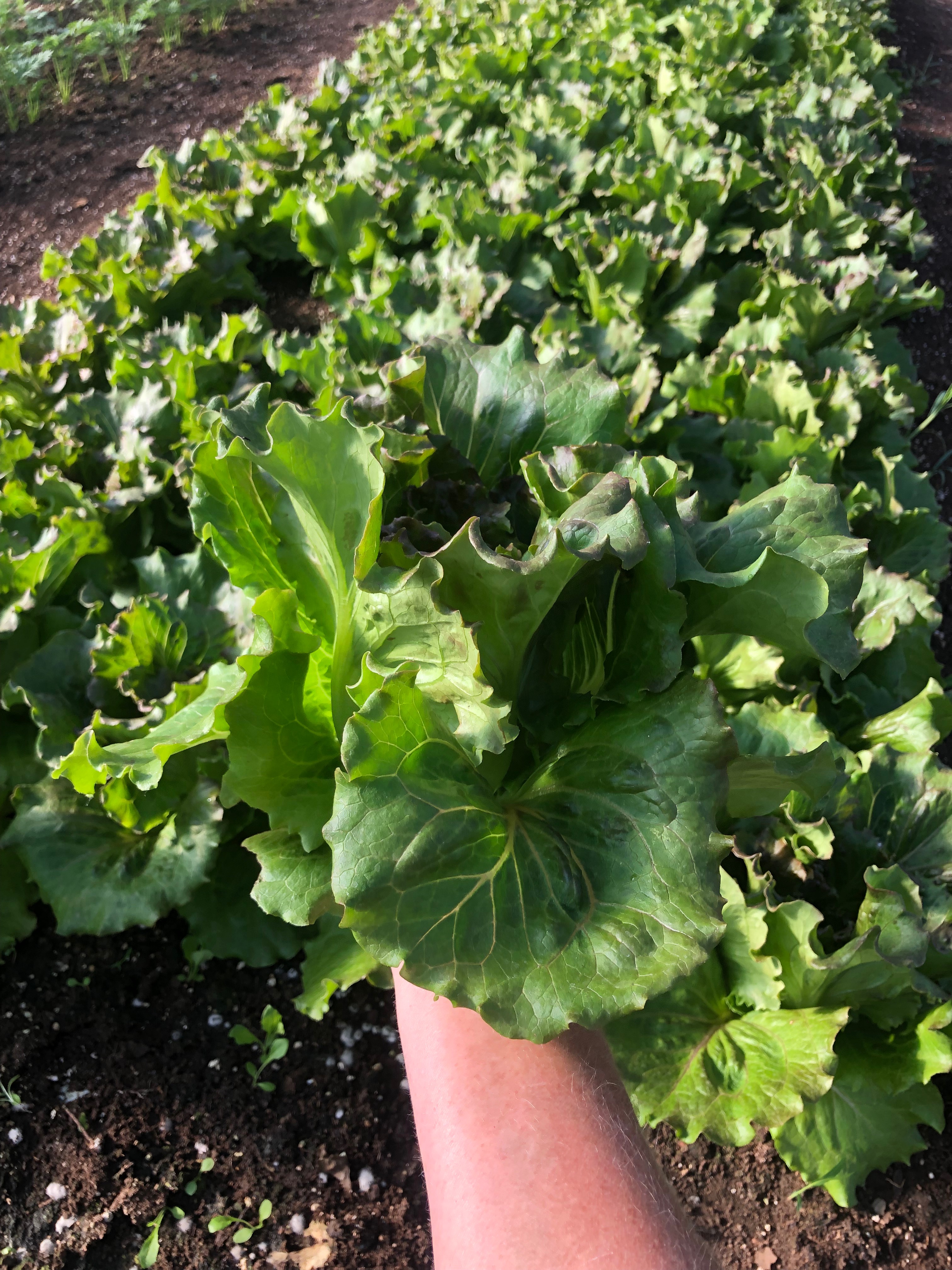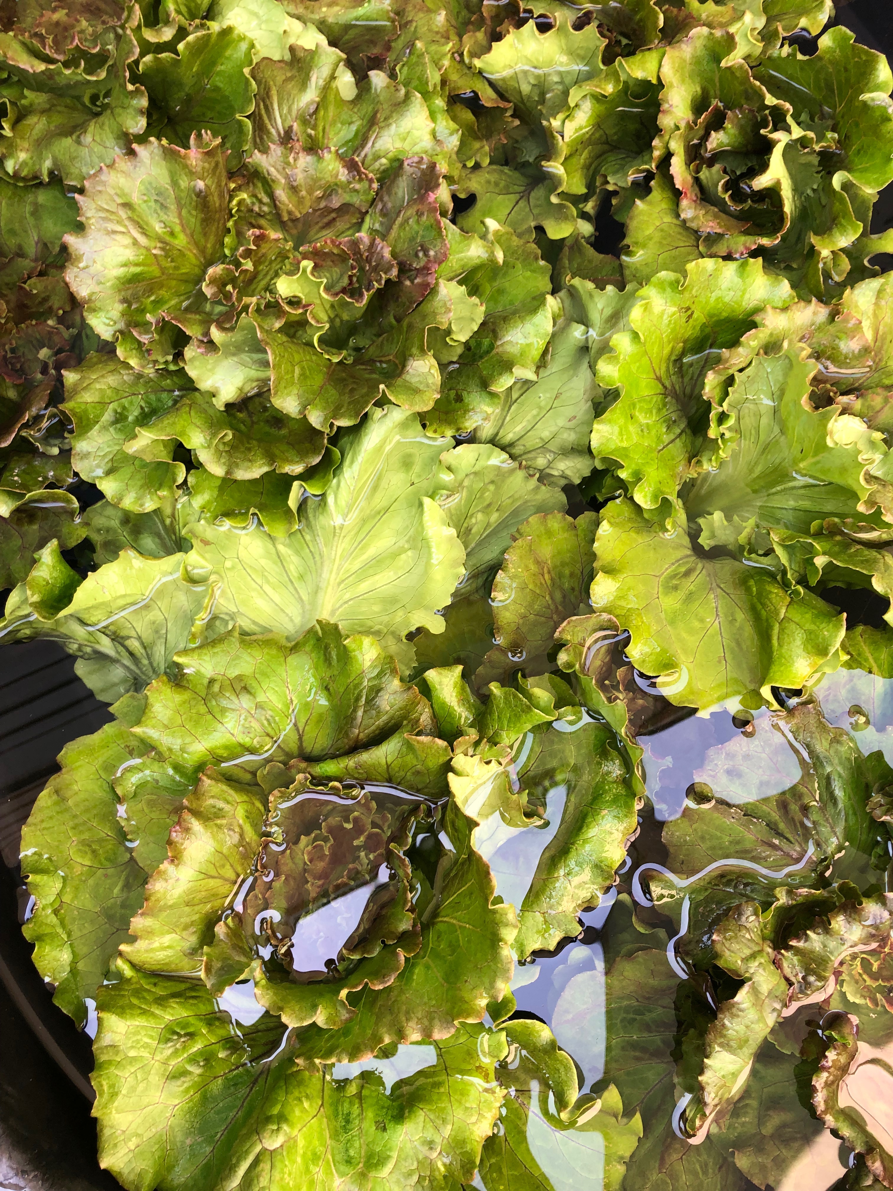Head Lettuce-We harvest the leafy green crops at first light on these hot days to insure they are crisp and not bitter. We zip them up to the cooler and then triple rinse and then spun dry in Scott’s new invention. He created a leafy green spinner out of a tread mill motor, huge fan guards and red fiberglass left over from a valentine heart project years ago. It works great and what a time saver.