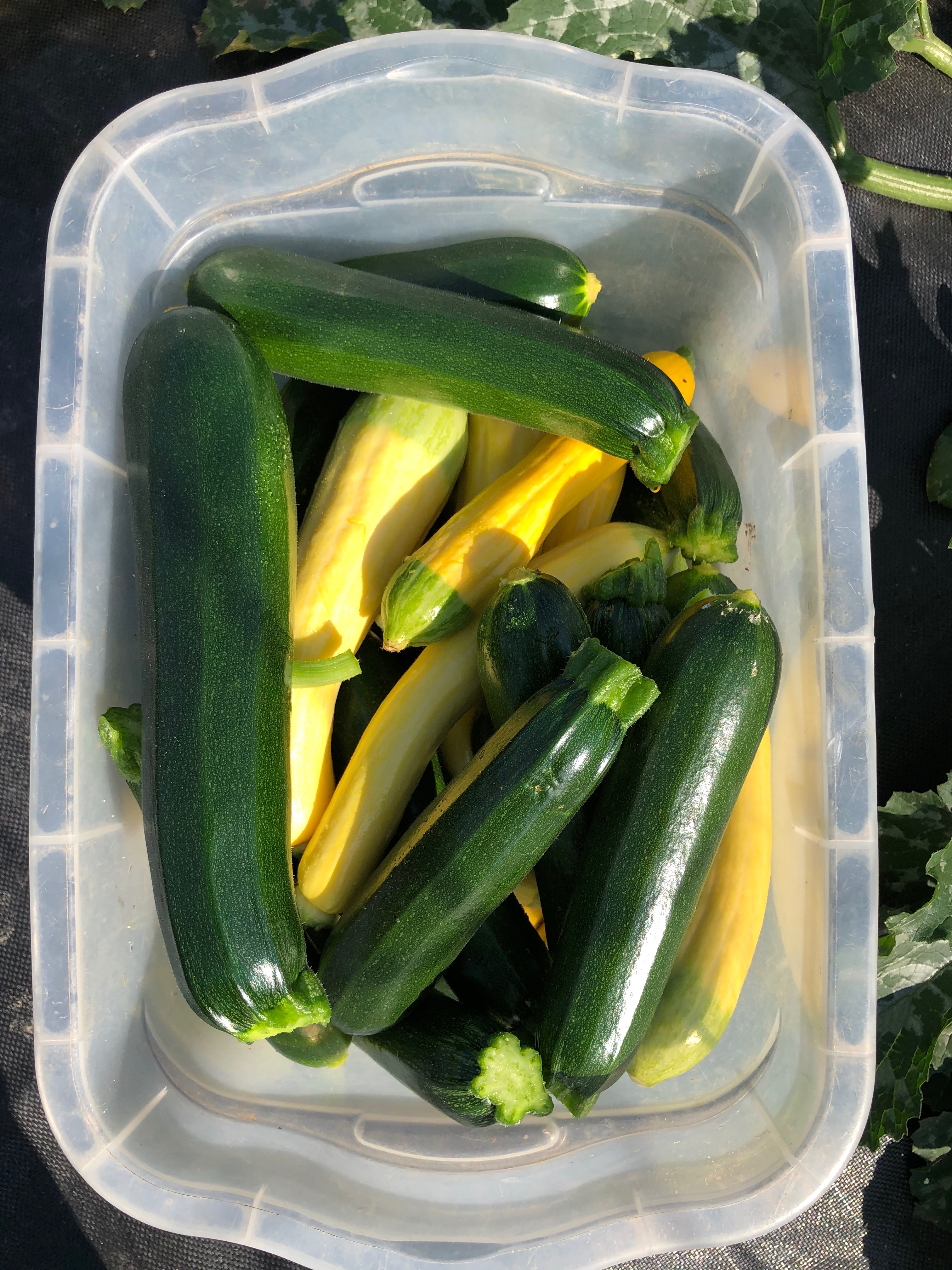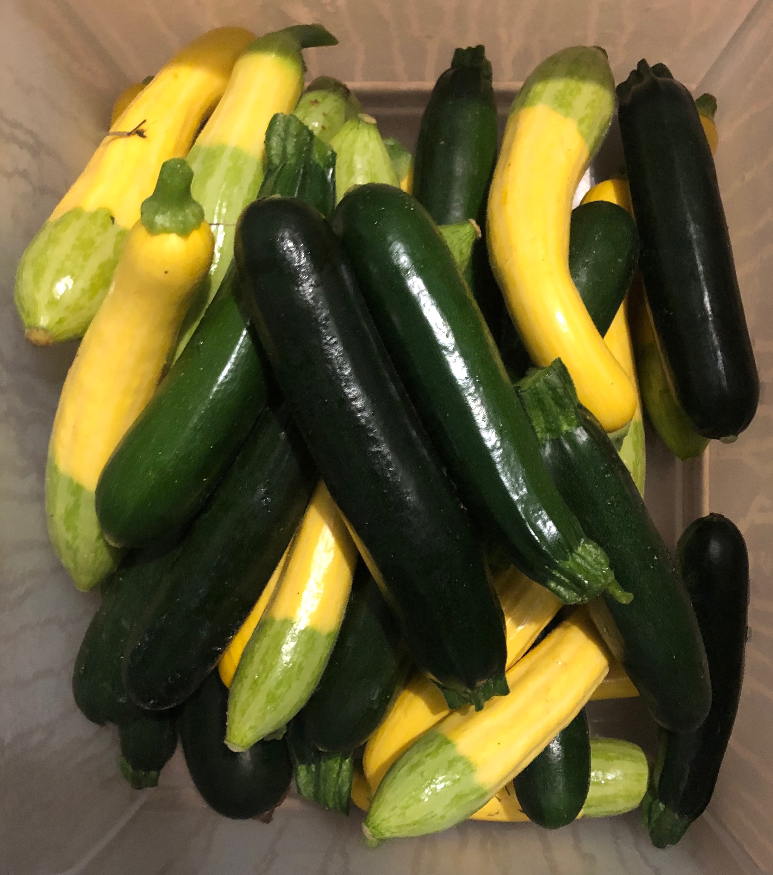 Zucchini-Daily and sometimes twice daily trips to the patches ensure perfectly sized summer squash. AND the baseball bats we sometimes miss are on the extra table for those that wish to make zucchini bread or fritters.