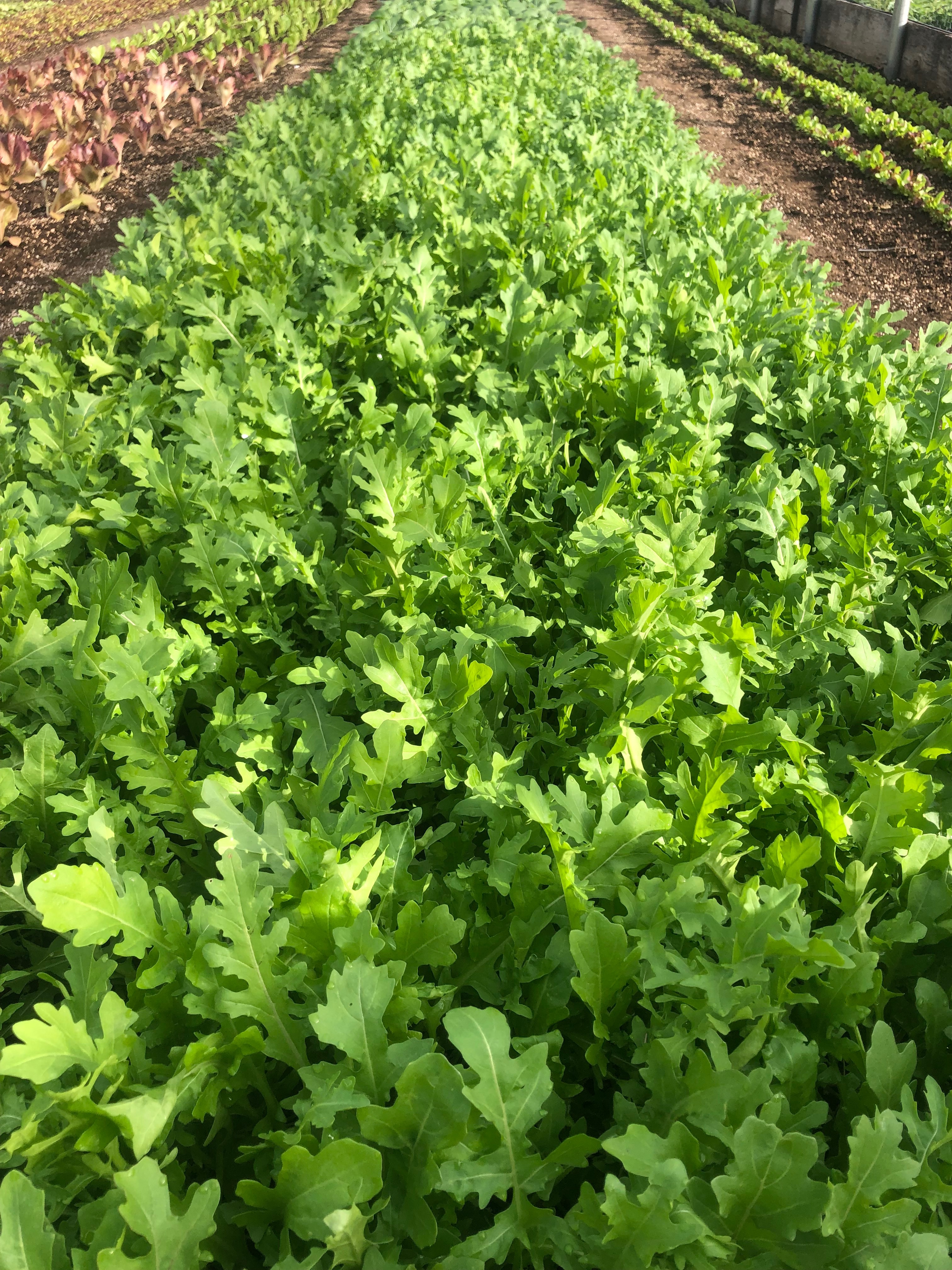 Arugula-Snappy! A great peppery flavor. A nice bite added to fresh salads or wilted is delicious with a dash of soy sauce.