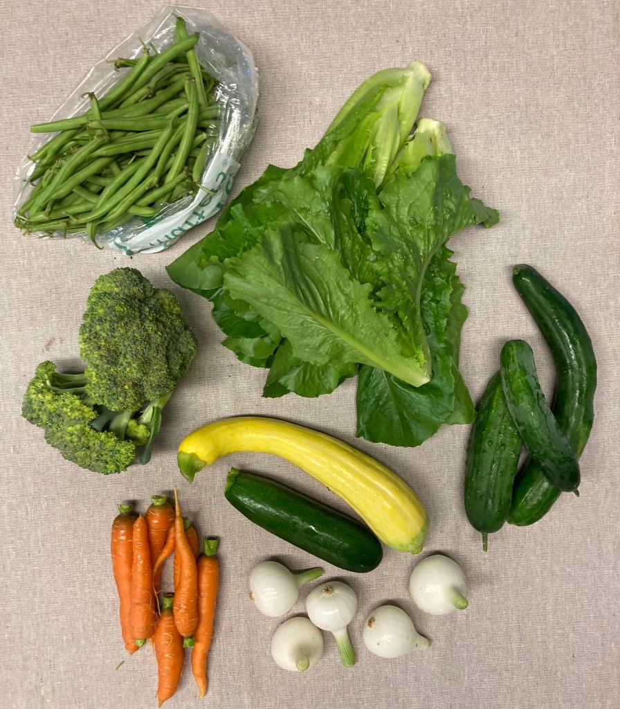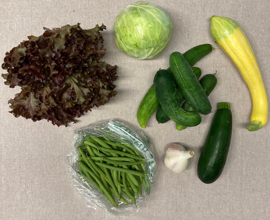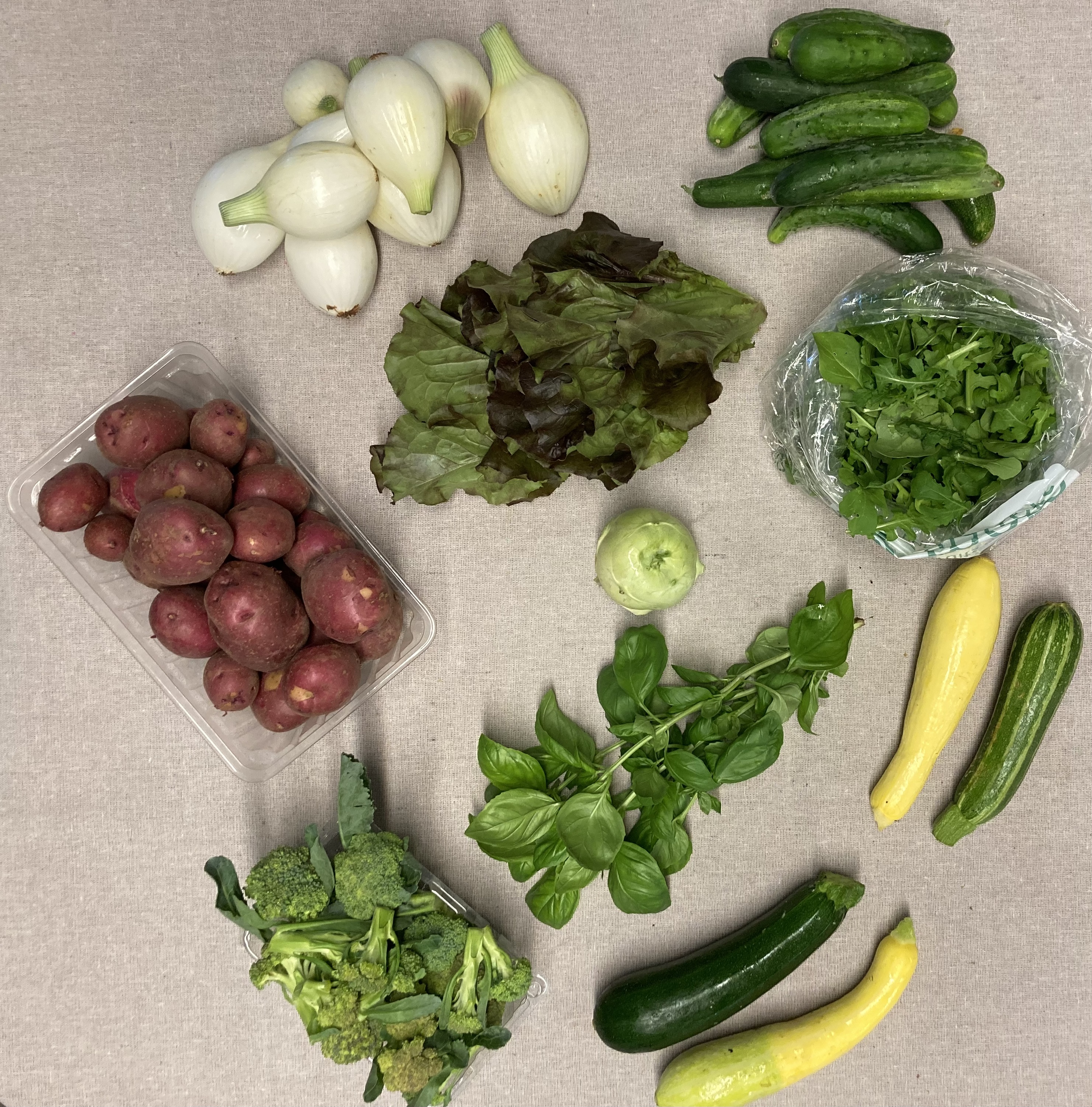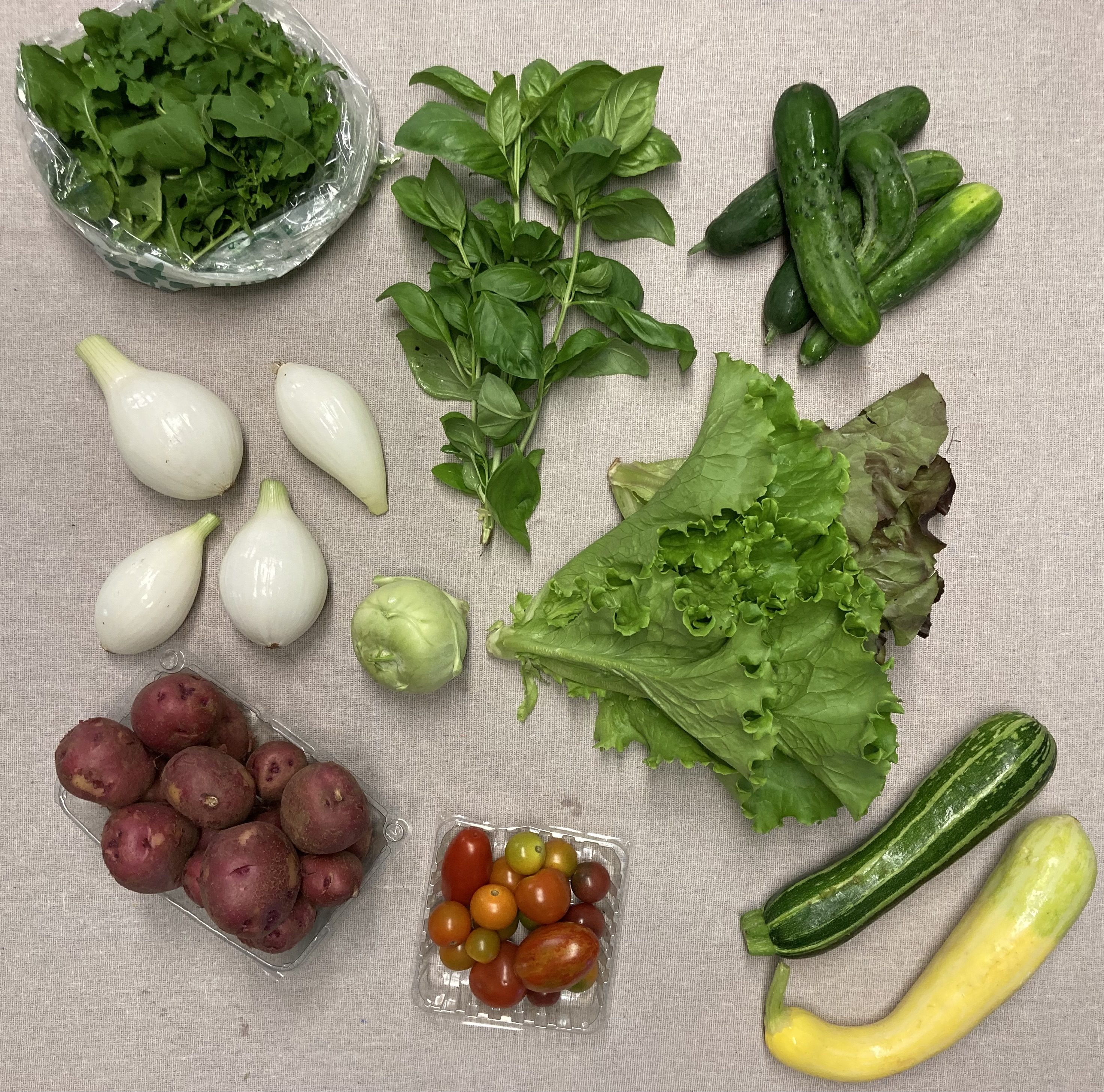 WHAT IS IN YOUR SHARE-Head lettuce, cucumbers, arugula, new red potatoes, sweet onions, zucchini, kohlrabi, basil, broccoli side shoots (full only), and cherry tomatoes (snack only)