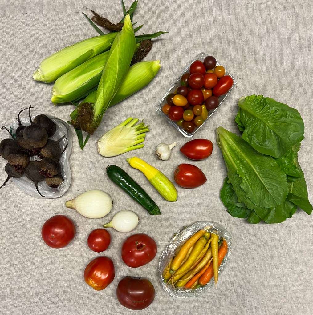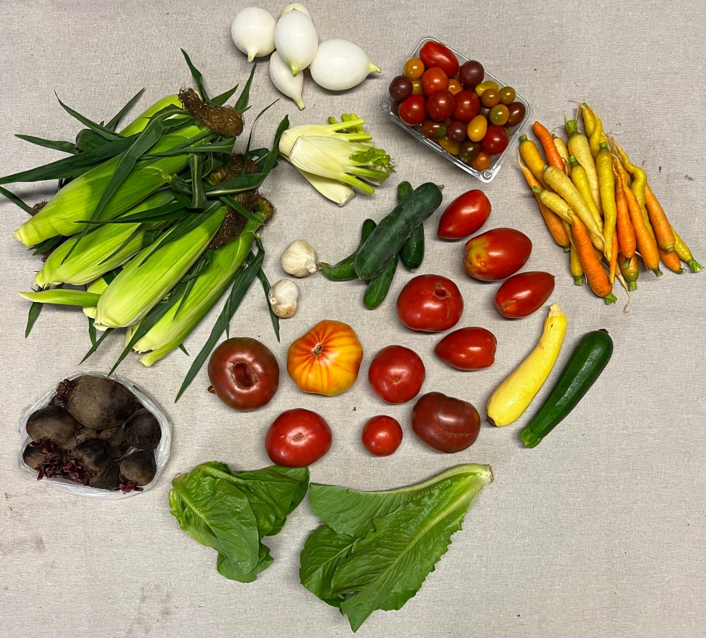 WHAT IS IN YOUR SHARE-TOMATOES-SLICE/PASTE/CHERRY, HEAD LETTUCE, COLORFUL CARROTS, SWEET ONIONS, BEETS, FENNEL, CORN AND SUMMER SQUASH