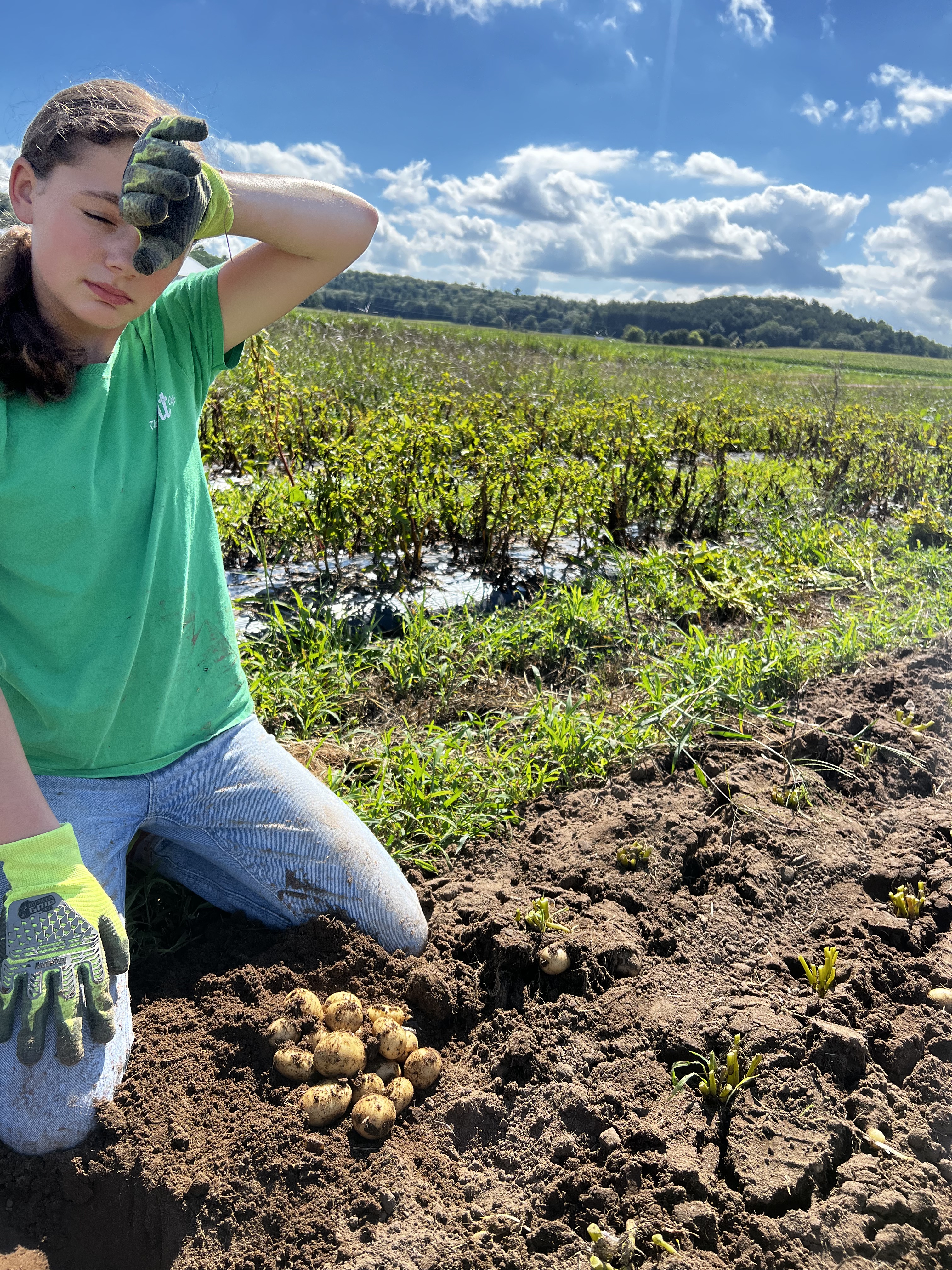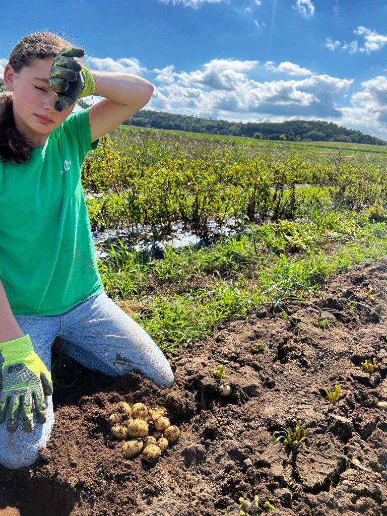 We planted a long row of late radishes in Hoop 2 for fun and we dug the 1st of the heirloom potatoes. We peeked under the sweet potato vines and they sure look great. The cucumbers are done and the last picking of cucumbers on the extra table this week and I think we will be coming to a hard stop on the slice tomatoes next week too. We have had a good 5 weeks of tomatoes but we can tell the vines are going down. Expected with this weather and late season but hard to see them go. We are looking forward to Autumn and all the delicious treats to enjoy….best news is we are going to sneak off some brussels sprouts next week for an early taste. The plants are gorgeous and and we planted 2 varieties…1 an extra early variety so we have a nice long season after the crop failure last year.