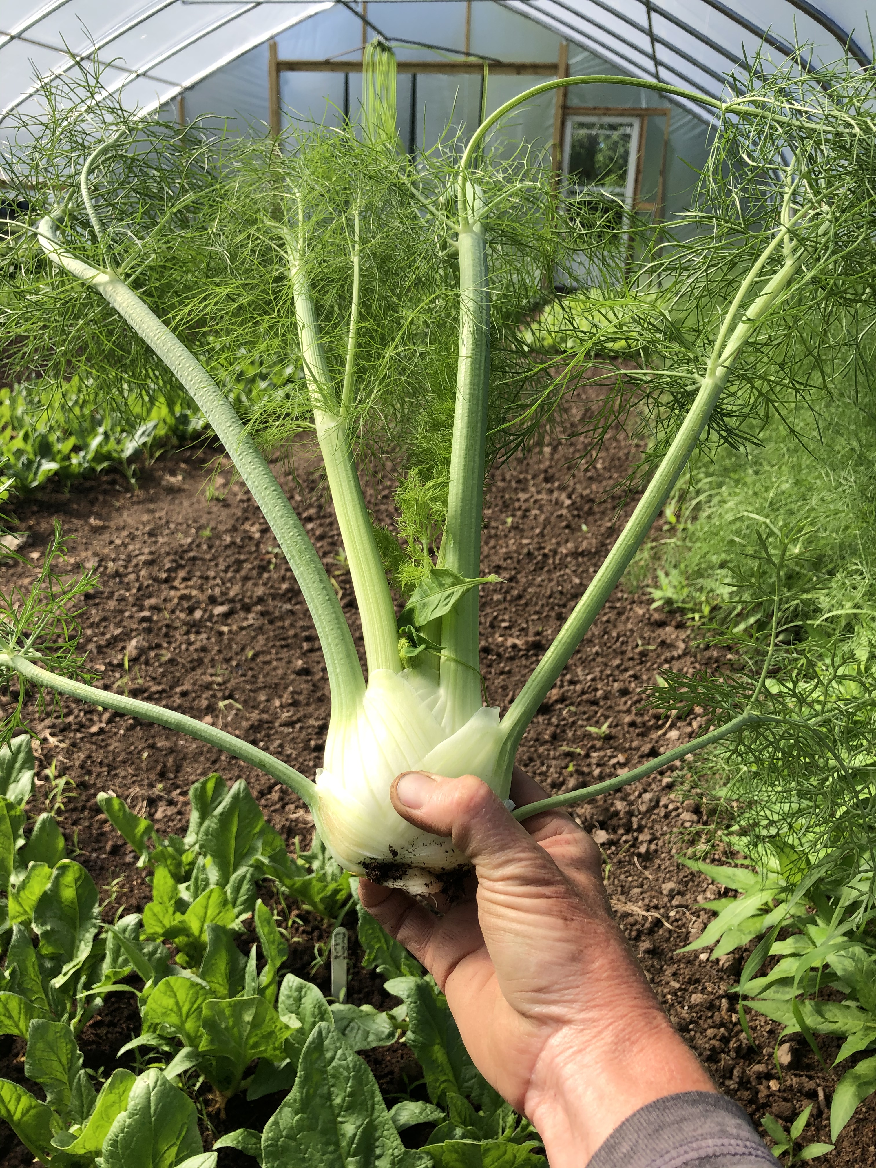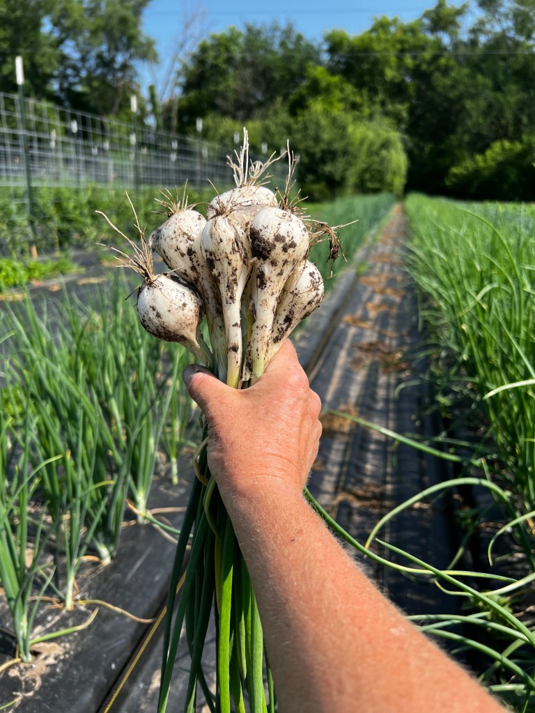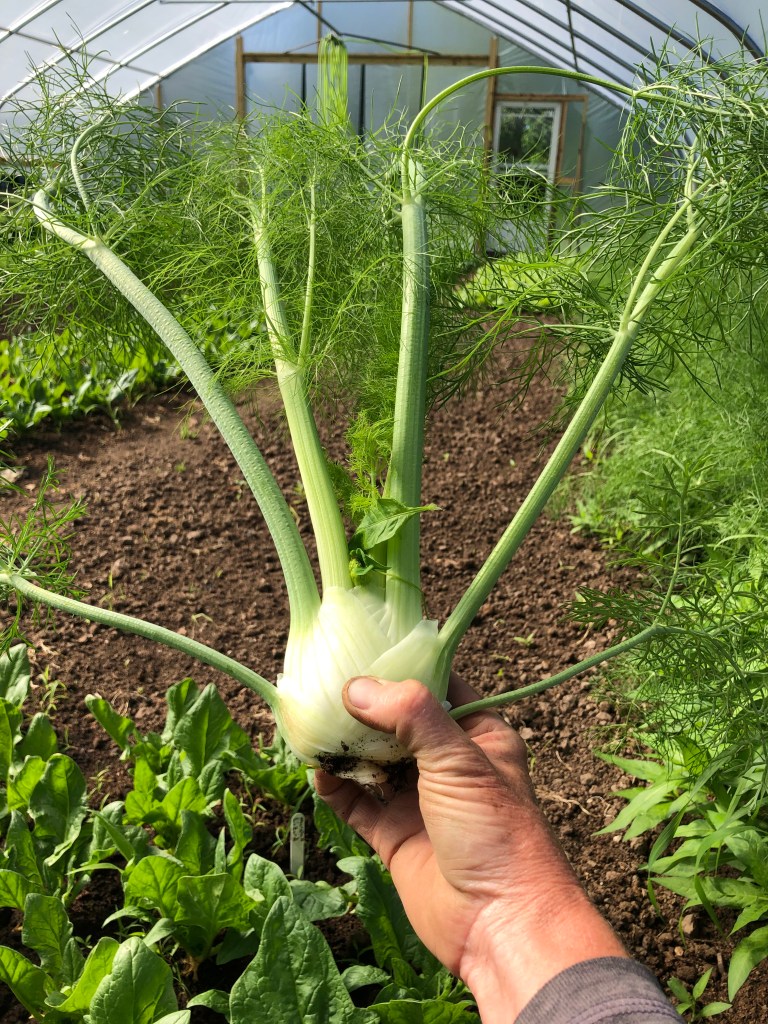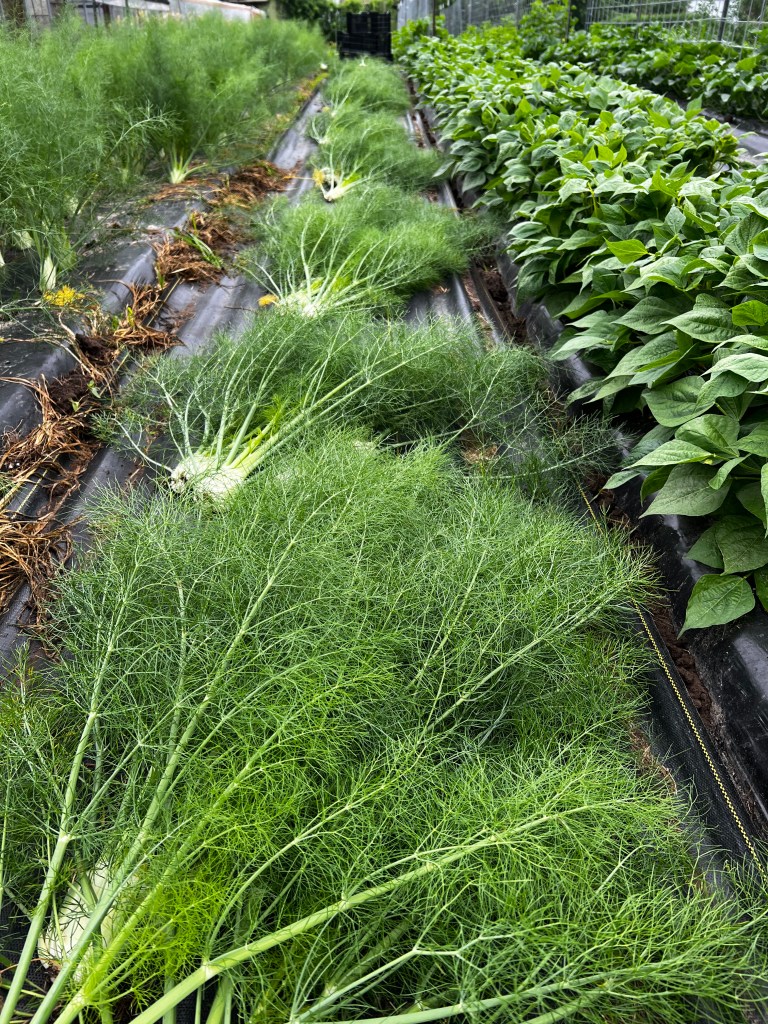 A hot and happy week in the gardens. We had about an inch of rain and grateful. Irrigation still going but the pressure has eased a bit. We seeded in another row of late green beans and more lettuce in hoop 2. We transplanted kohlrabi in the field and spent a lot of time weeding!