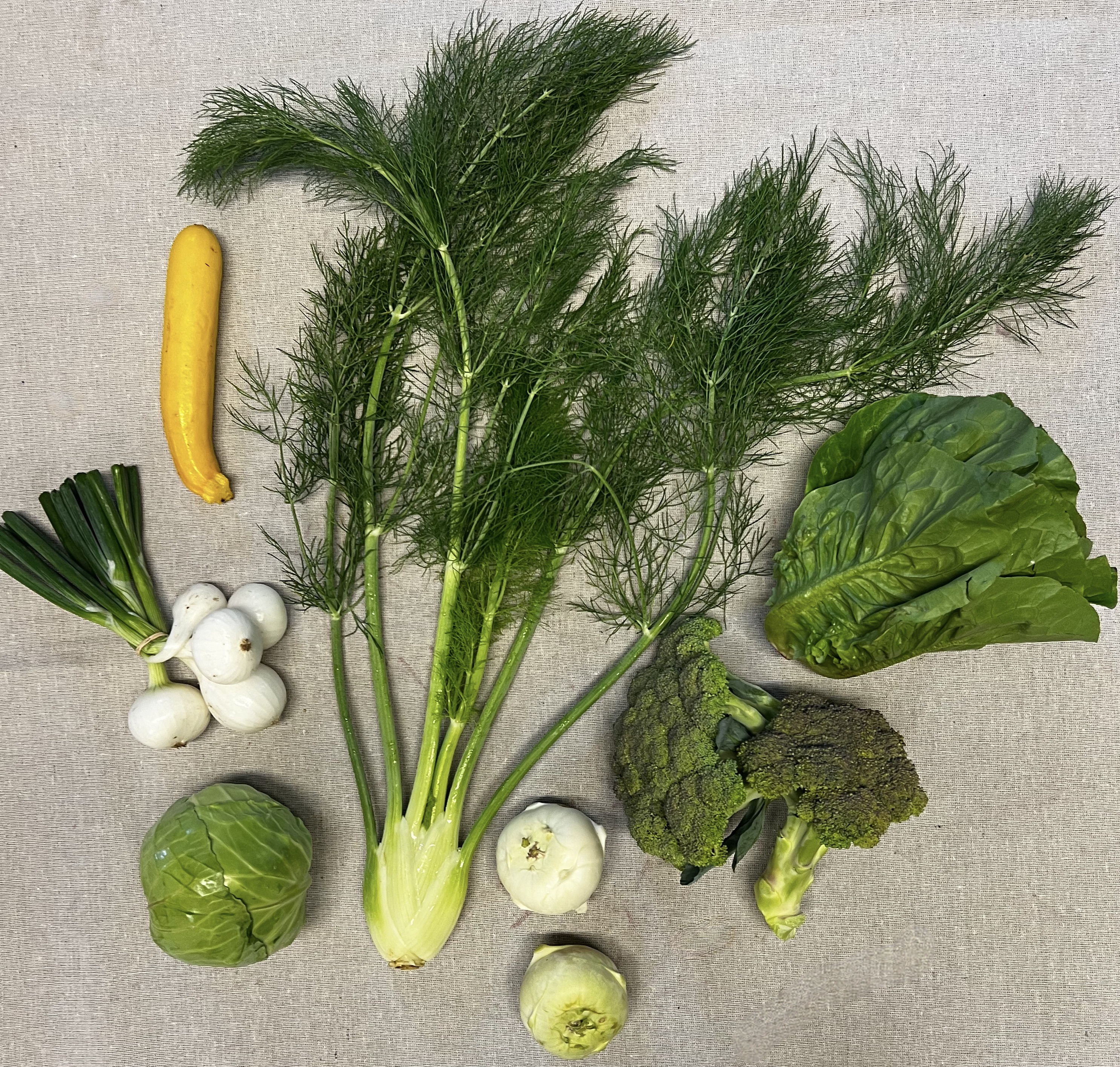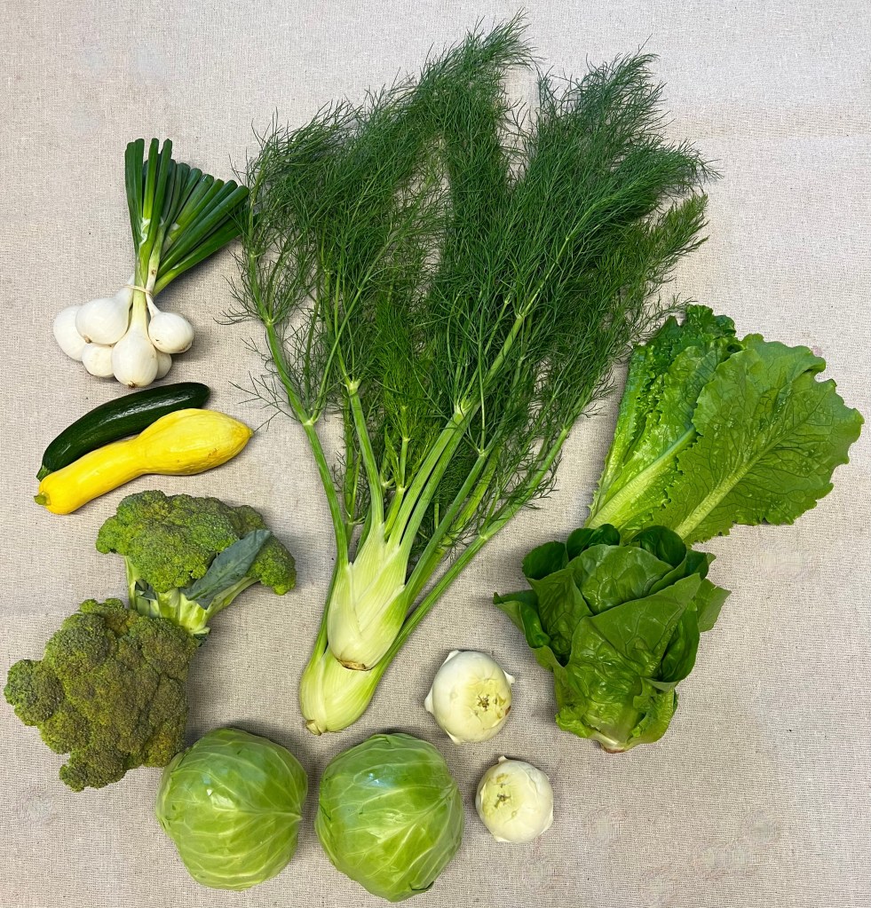 What is in your share…..head Lettuce, zucchini, cabbage, broccoli, fennel, onions, kohlrabi