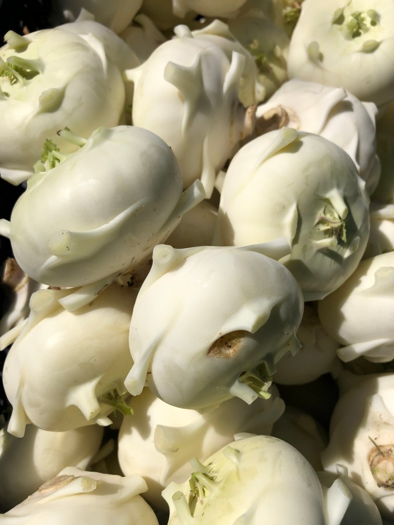 Kohlrabi-We harvested both green and fancy white heads this week. Sweet flavor. A family favorite.