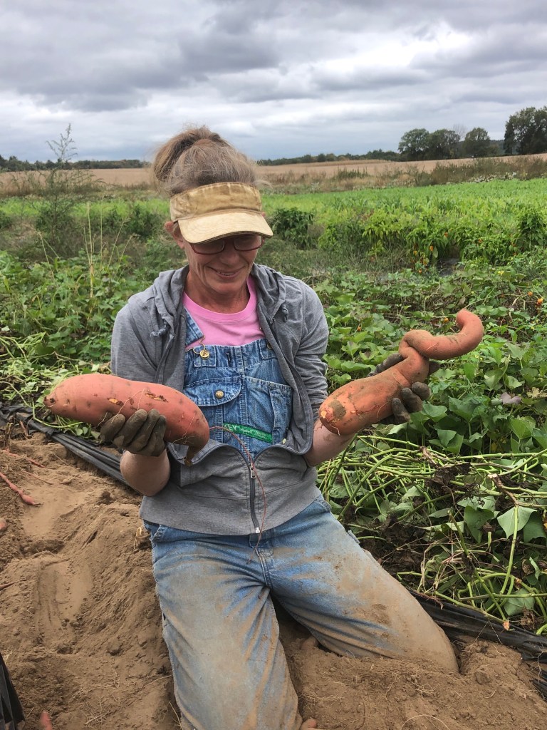 Our helper Al is busy with the garden cleanup and landscape fabric and irrigation are being lifted and the compost pile grows. We had perfect weather for late-season harvest. 2 more rows of sweet potatoes will be dug next week and lots of carrots to pull and the gorgeous spinach in hoop 2 will continue to produce but with the change of season our duties slow.