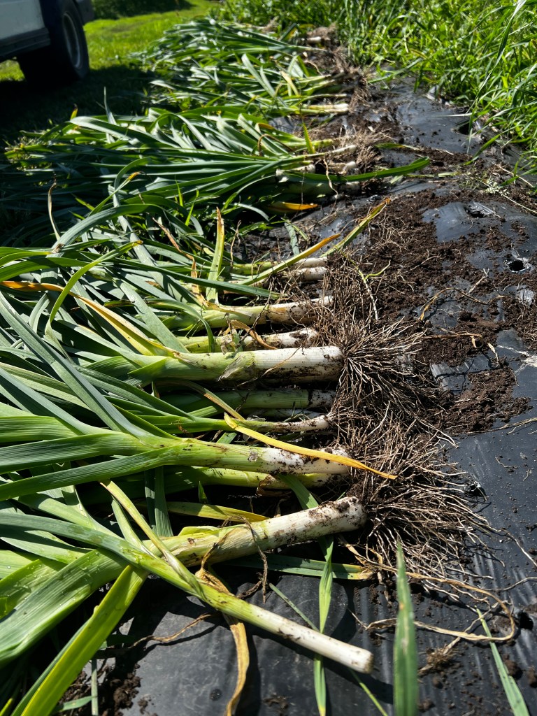 Leeks-Our helper Al pulled the last of the leek crop from the garden this past week and we trimmed and cleaned them up in the shade. Longest we have ever grown.